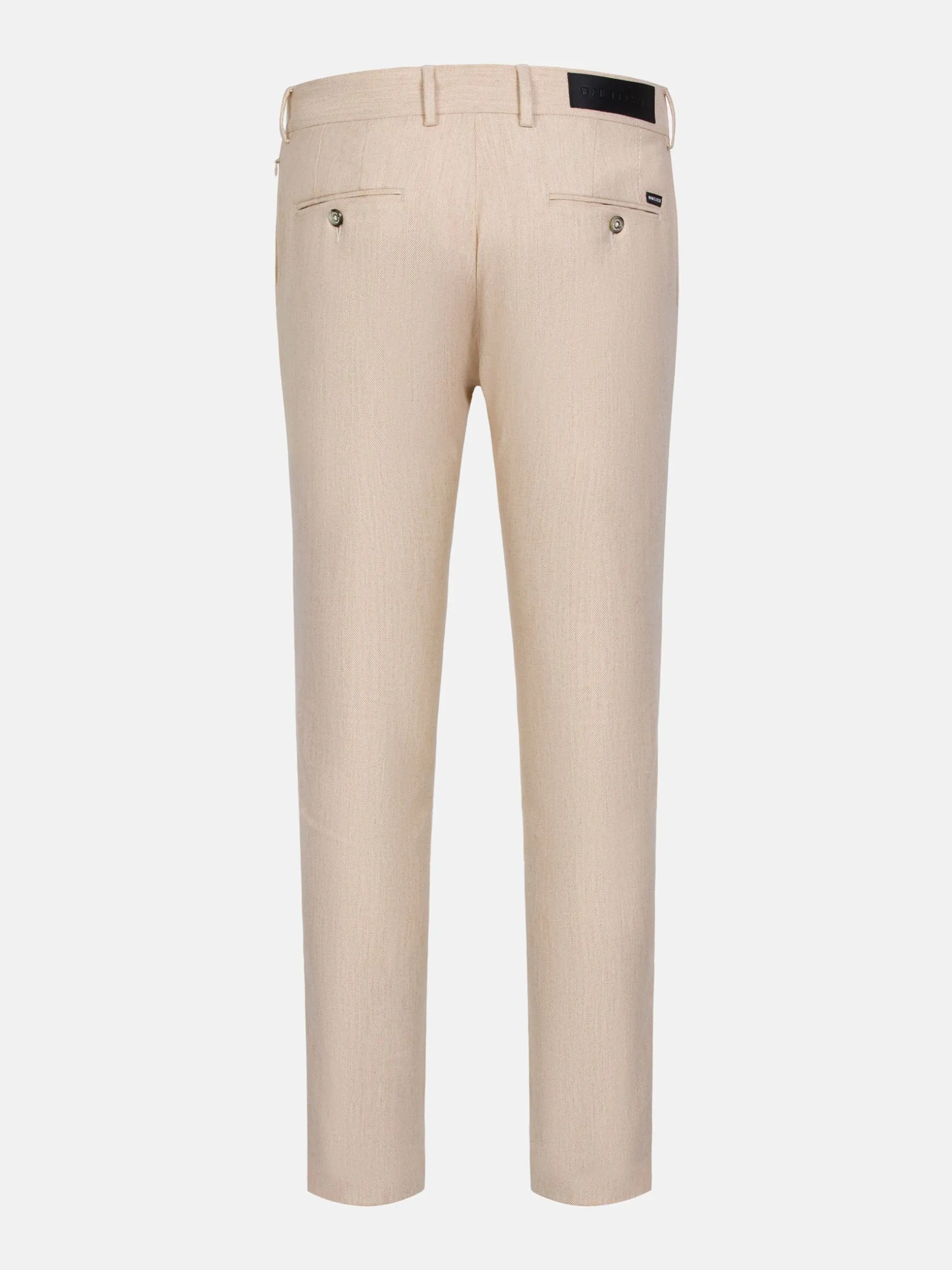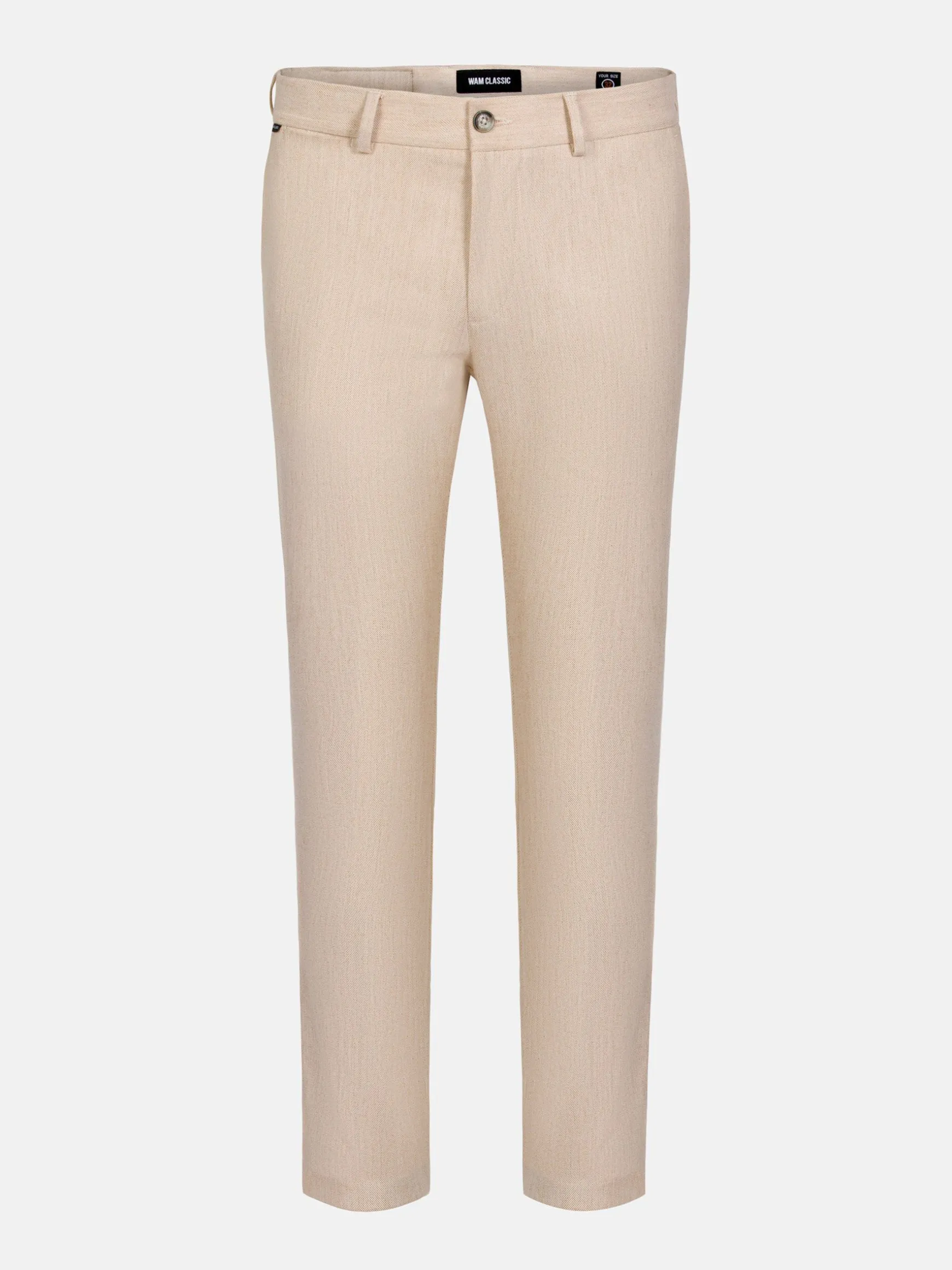 Alaric Slim Fit Beige Chino biedt een strakke stijl met een praktisch ontwerp. Hij heeft twee achterzakken met knoopsluiting, twee voorzakken en een discrete verborgen zak met ritssluiting. De slim fit is gemaakt van stretchstof voor comfort en biedt een moderne, getailleerde look die perfect is voor elke gelegenheid.