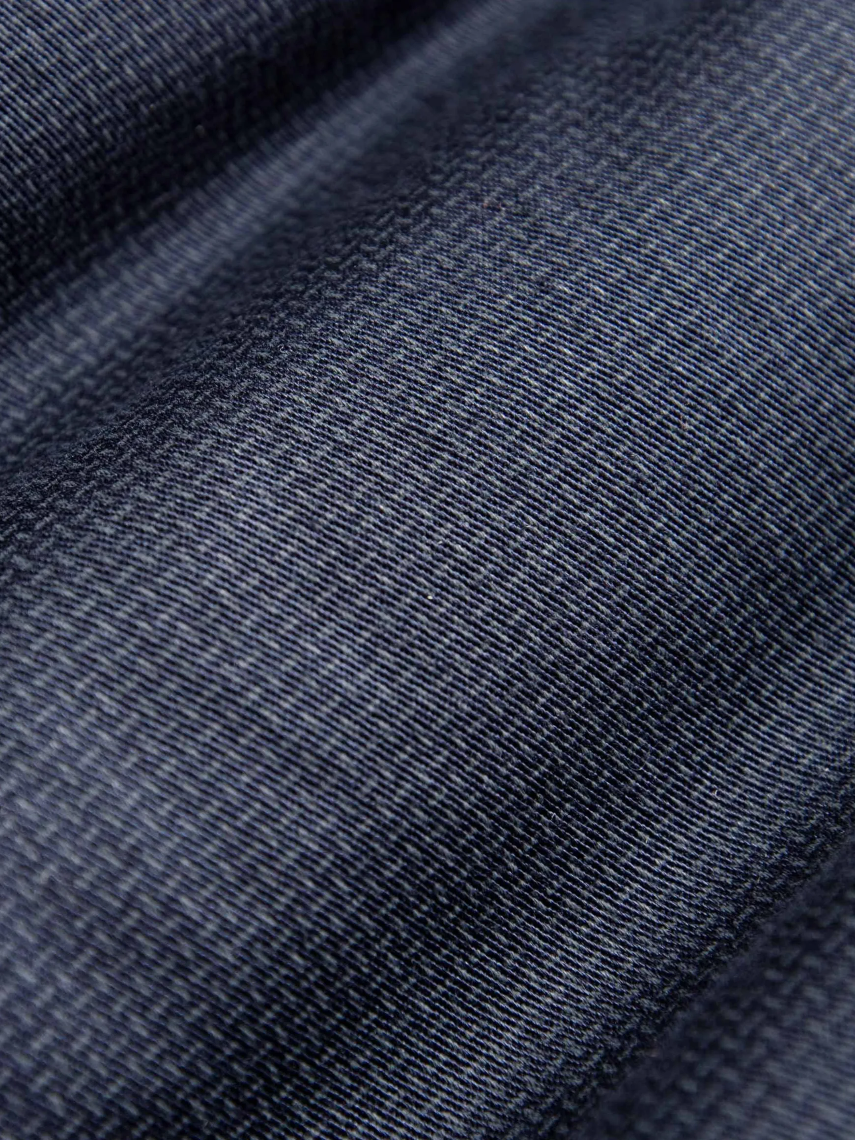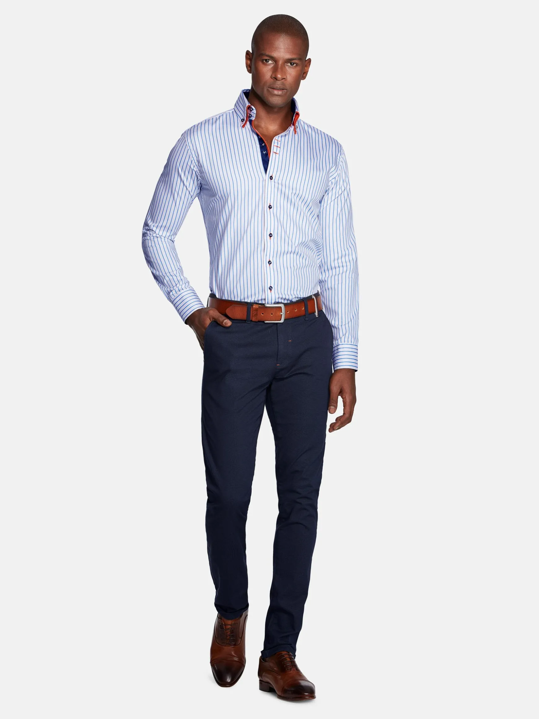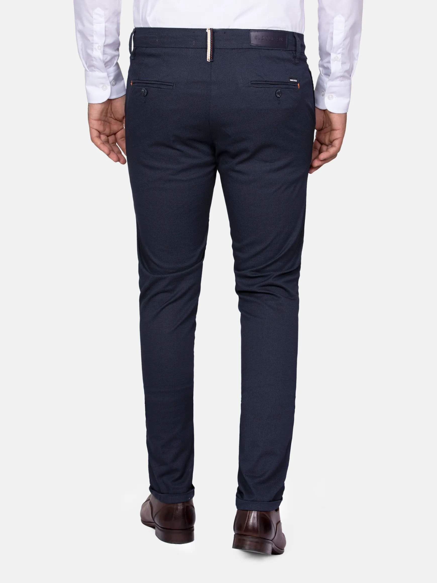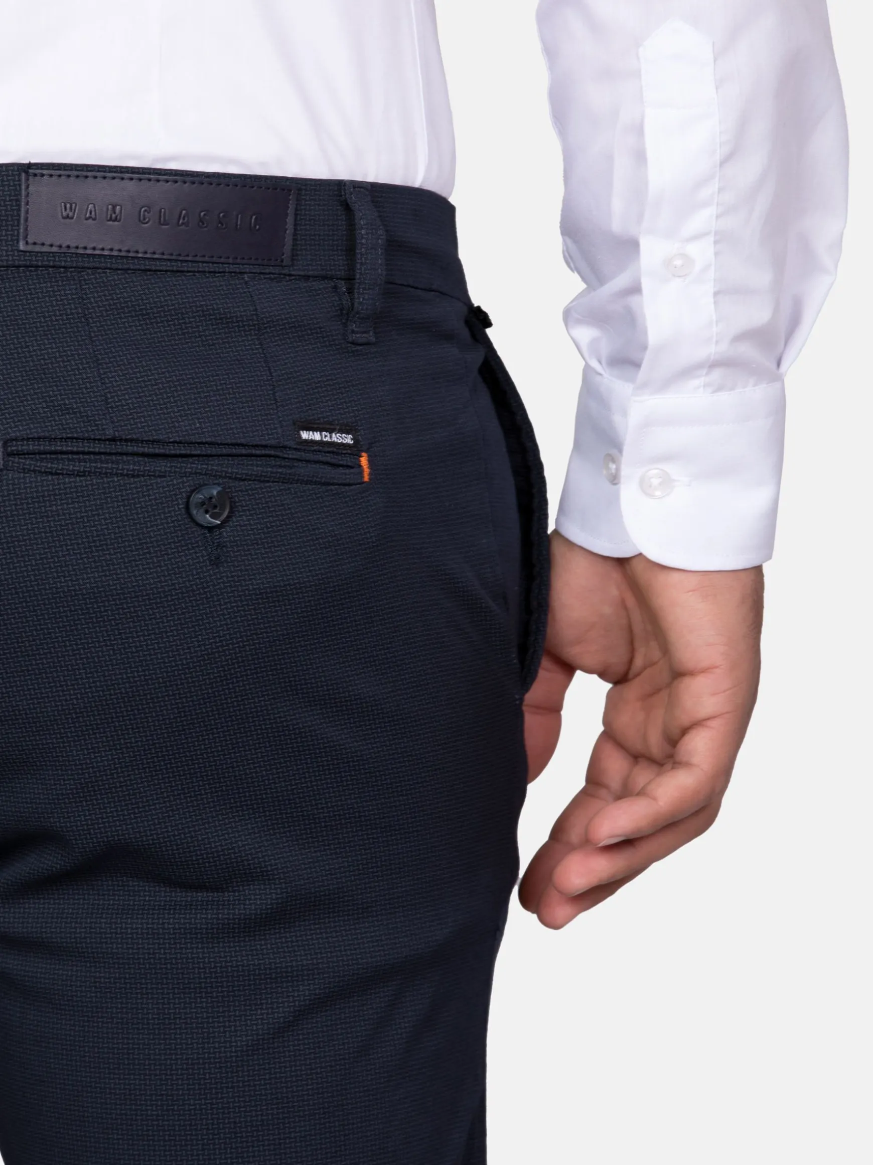 Modieuze en nette chino in een prachtige donkerblauwe kleur. Staat mooi met bijvoorbeeld een wit of lichtblauw overhemd. Deze chino is zeer geschikt voor kantoor of gelegenheden waar je er een beetje netjes uit wilt zien. De broek heeft twee steekzakken en twee achterzakken met knoopsluiting. Op de taille zit een donker embleem.