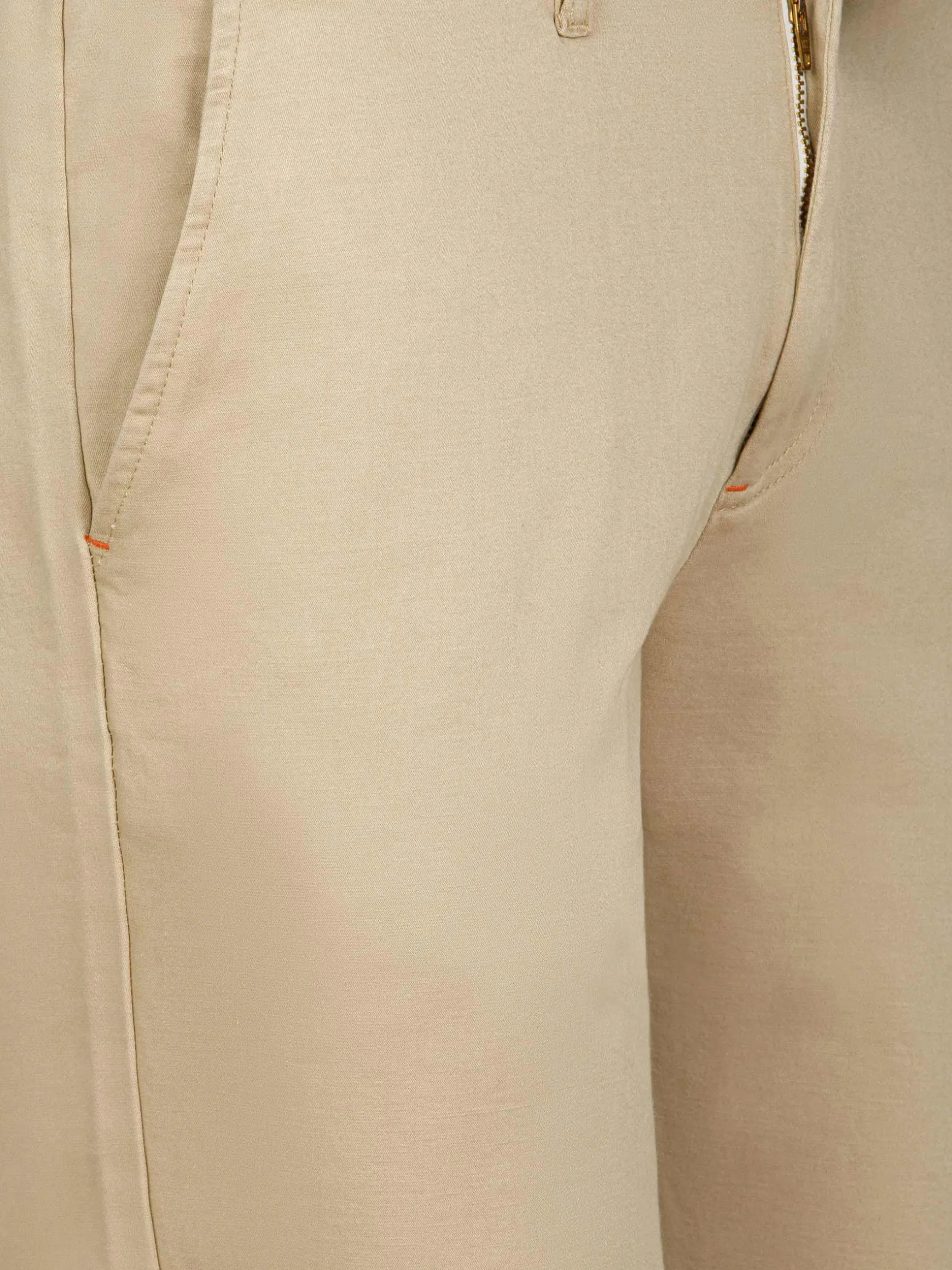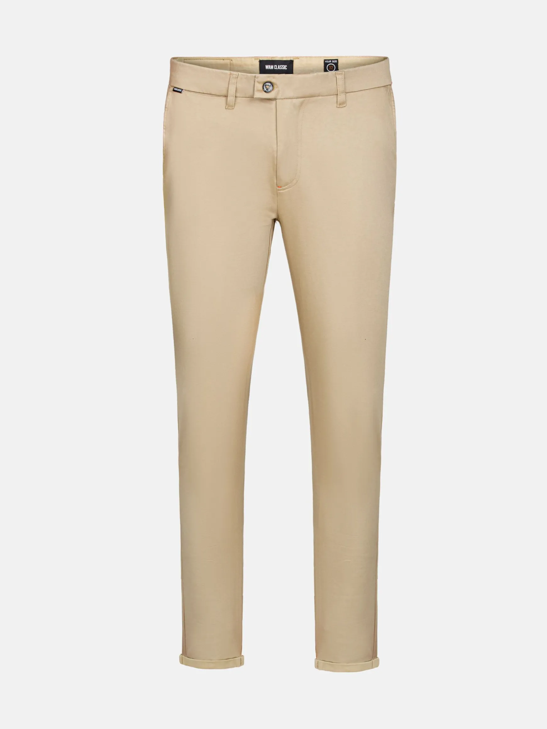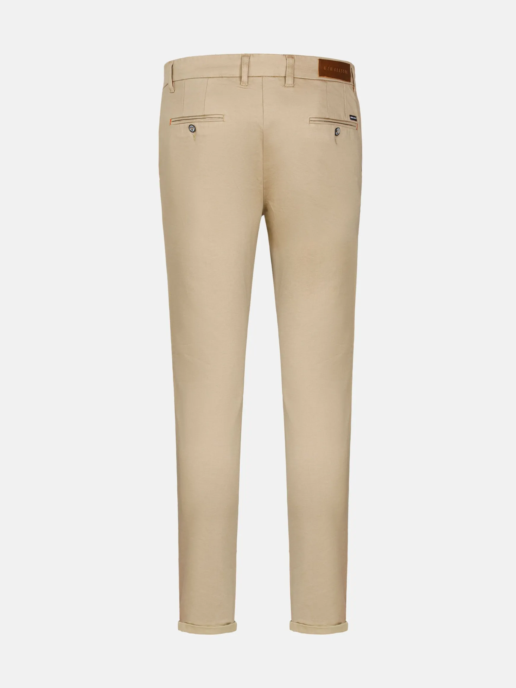 Robo Beige Chino. Deze slim-fit chino’s zijn ontworpen voor moderne elegantie en comfort, met stretchstof die superflexibiliteit biedt. Met twee voorzakken en twee achterzakken met knoopsluiting bieden ze praktische opbergruimte zonder afbreuk te doen aan stijl. De ritssluiting voegt een verfijnde touch toe.