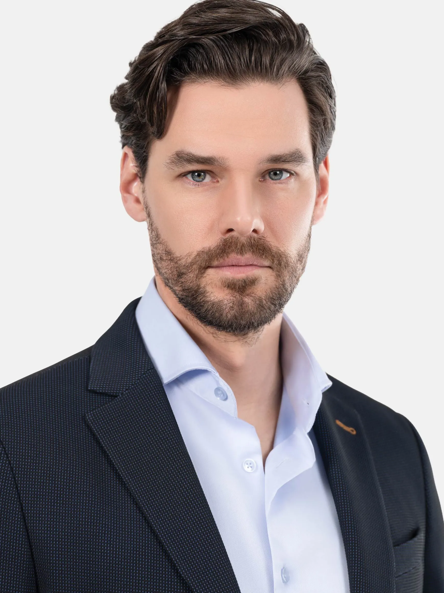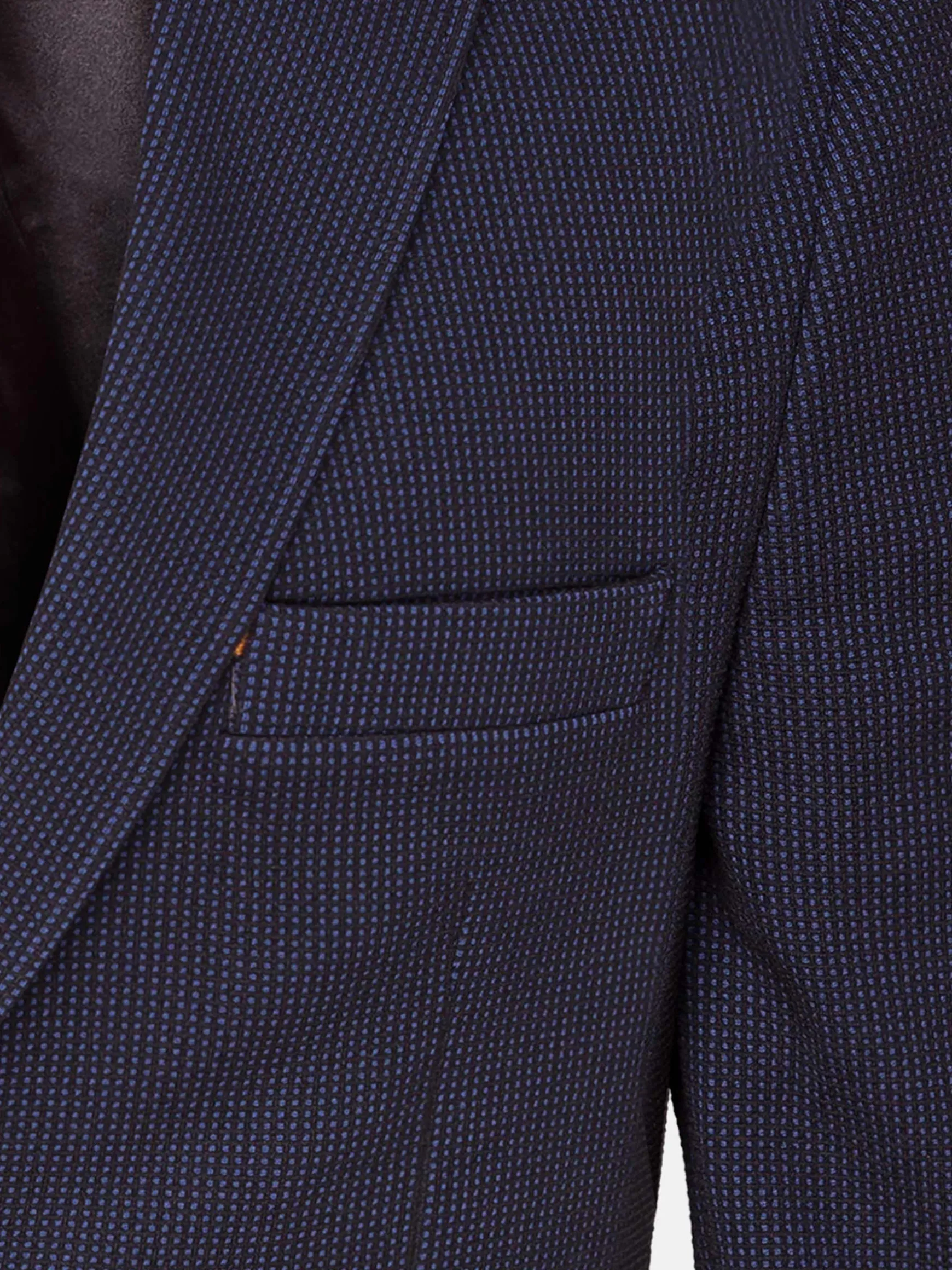 Italy Stretch Poly Light Indigo Cobert is een tijdloos stuk dat klassieke elegantie combineert met moderne verfijning. Het is gemaakt van een eersteklas mix van viscose, polyester en elastaan en biedt duurzaamheid, comfort en krasvastheid. Het heeft een brede revers, een moderne pasvorm en een eenborstig ontwerp met twee knopen. De blazer heeft ook klepzakken op de borst en een miniruit met stippen, waardoor het een veelzijdige keuze is voor verschillende gelegenheden.