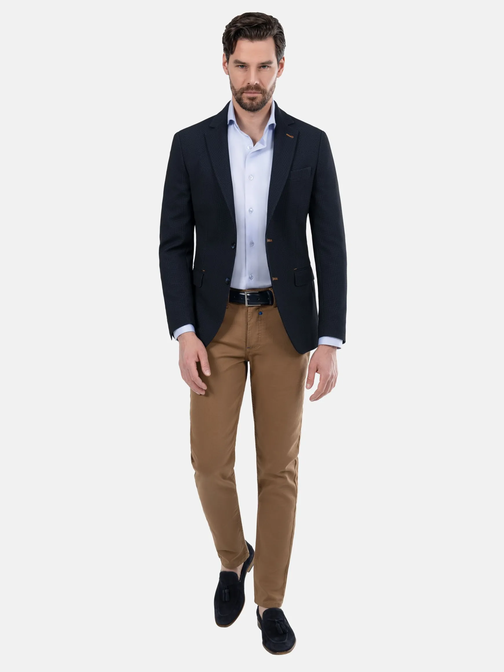 Bestaande uit 50% katoen, 45% polyester, 5% lycra. Om de kwaliteit te behouden, raden we aan dit colbert niet te wassen, maar te stomen. Niet bleken. Strijken op een temperatuur van 110°C. Niet geschikt voor de droger.
