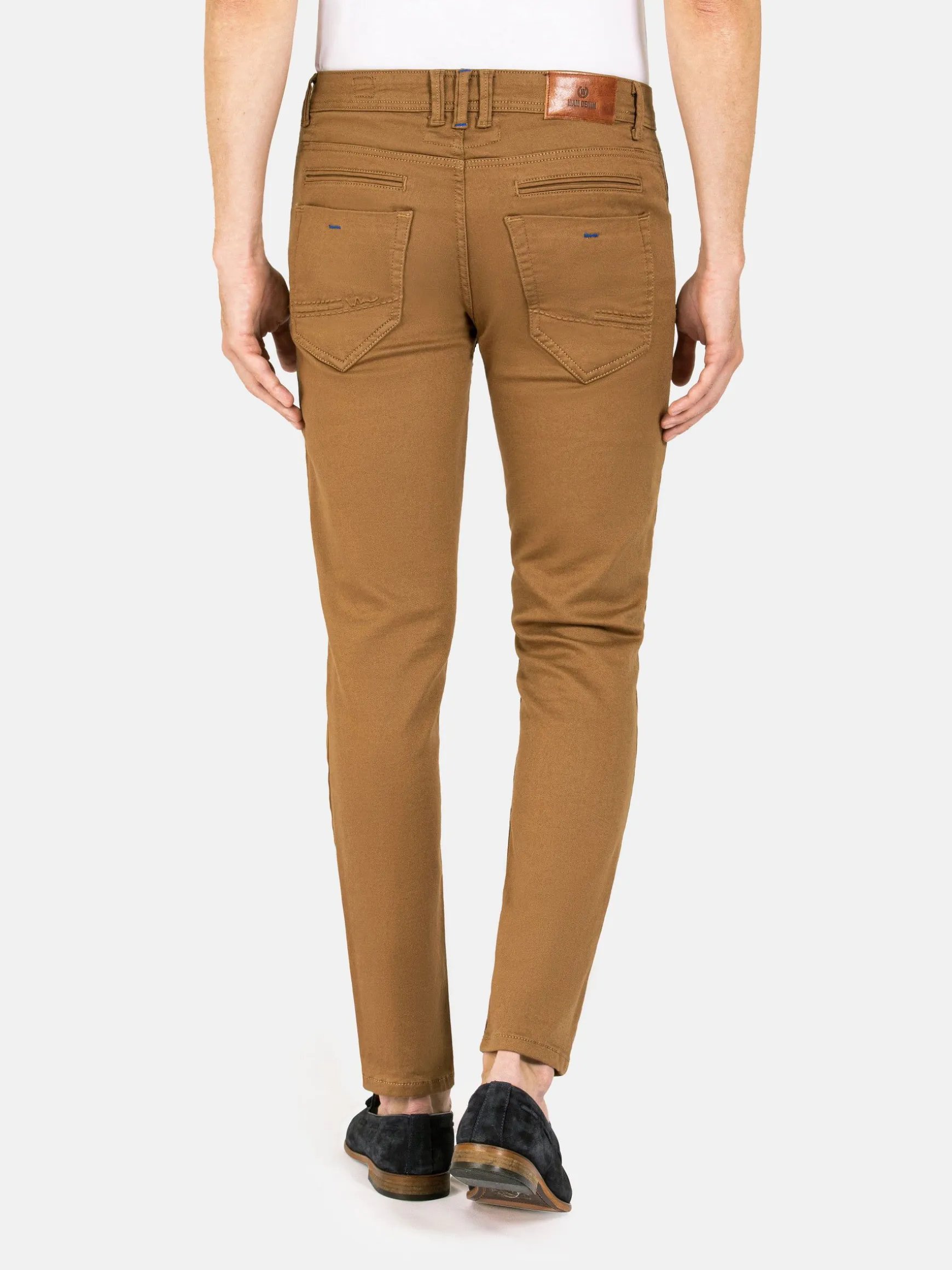 Peru kleurige jeans met knoopsluiting. Deze effen jeans staat goed met een sweater of T-shirt voor een casual look. Voor een meer nette look combineer je deze jeans met een overhemd. Boven de rechter achterzak is een merkembleem bevestigd.