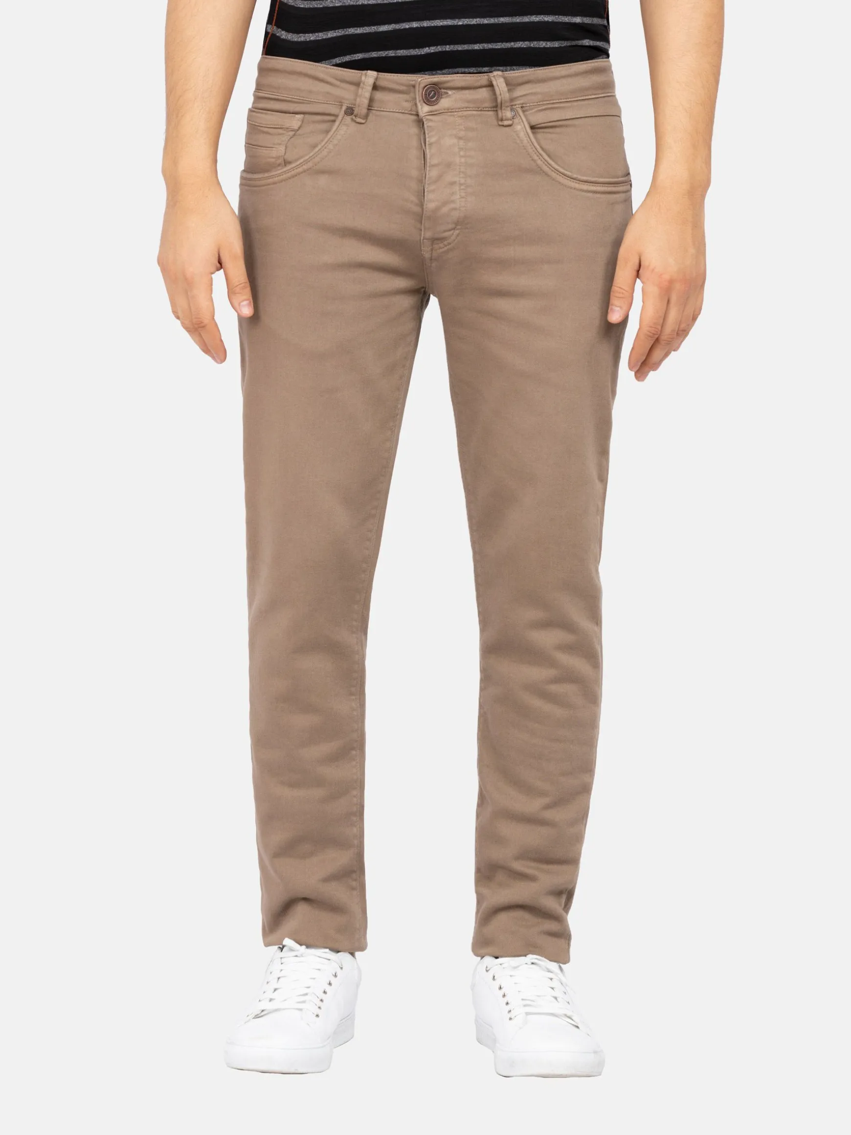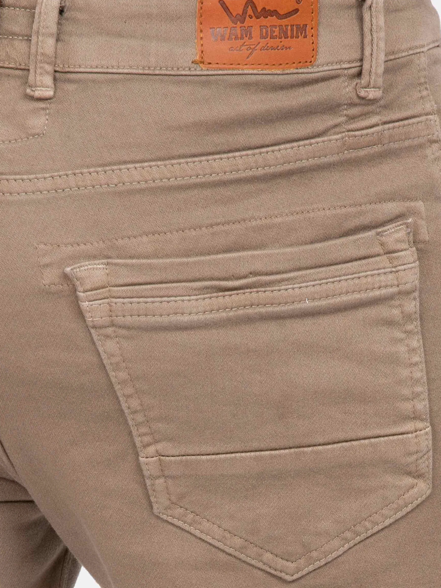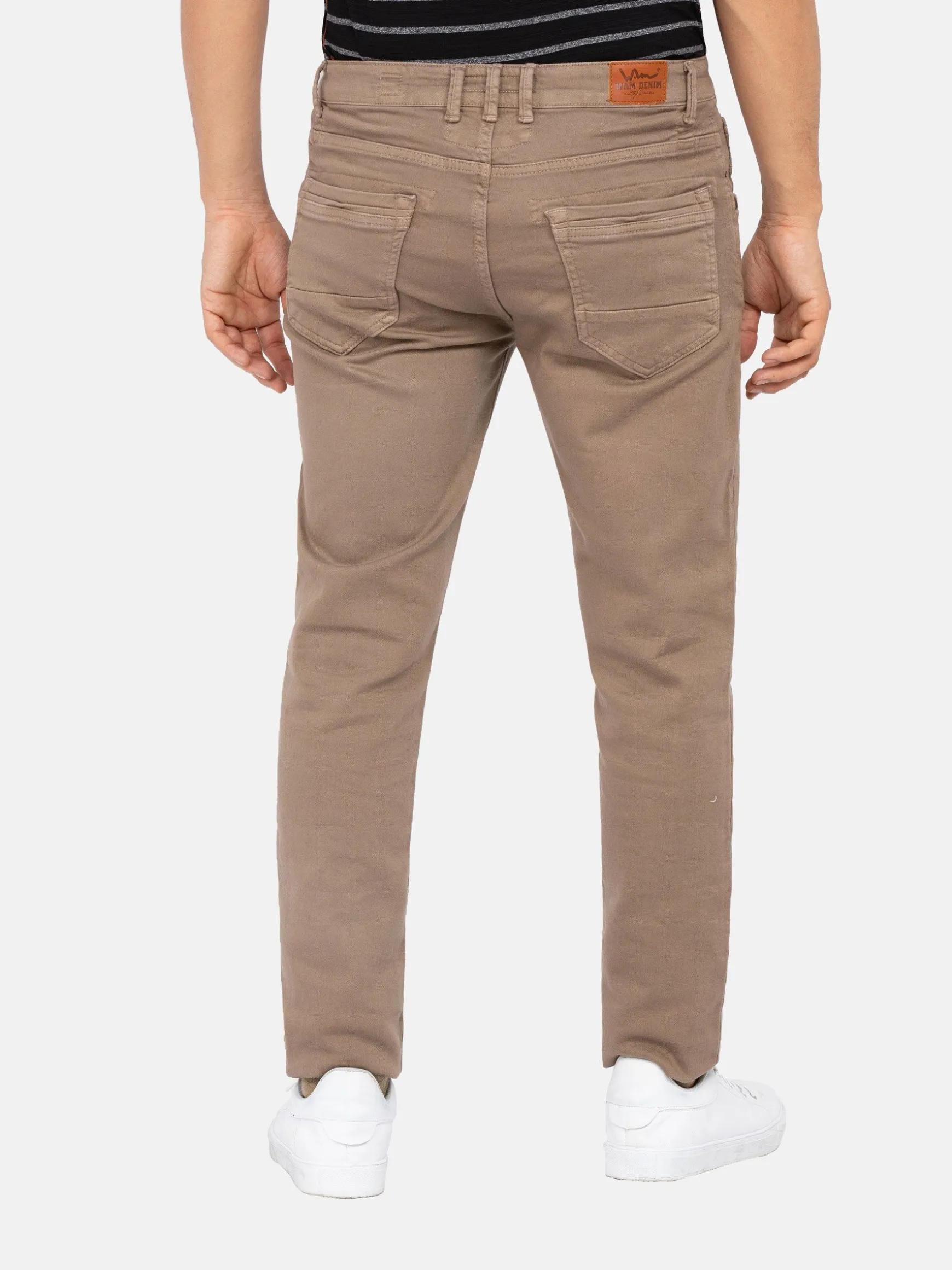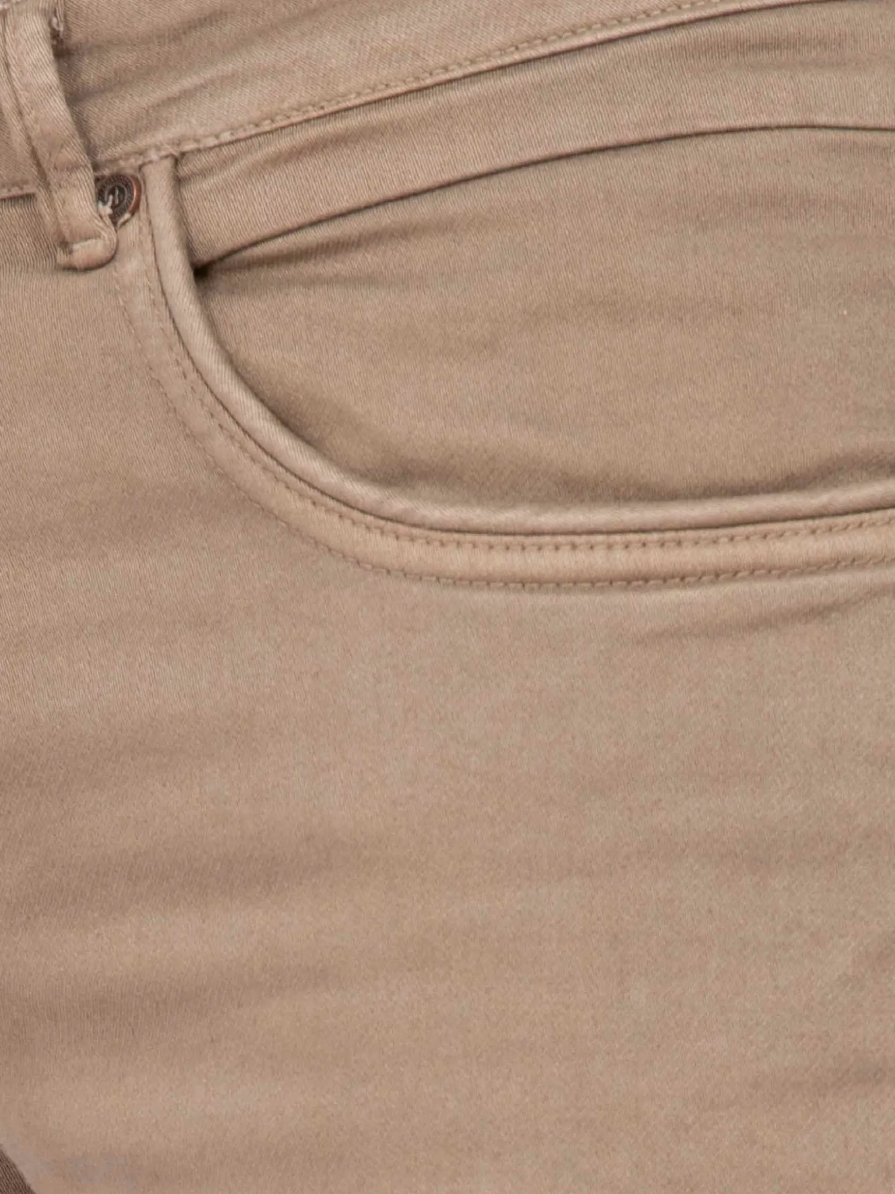 Beige kleurige jeans met een getailleerde pasvorm. Dit model heeft een knoopsluiting en een bruin embleem op de achterkant, boven de rechterzak.
