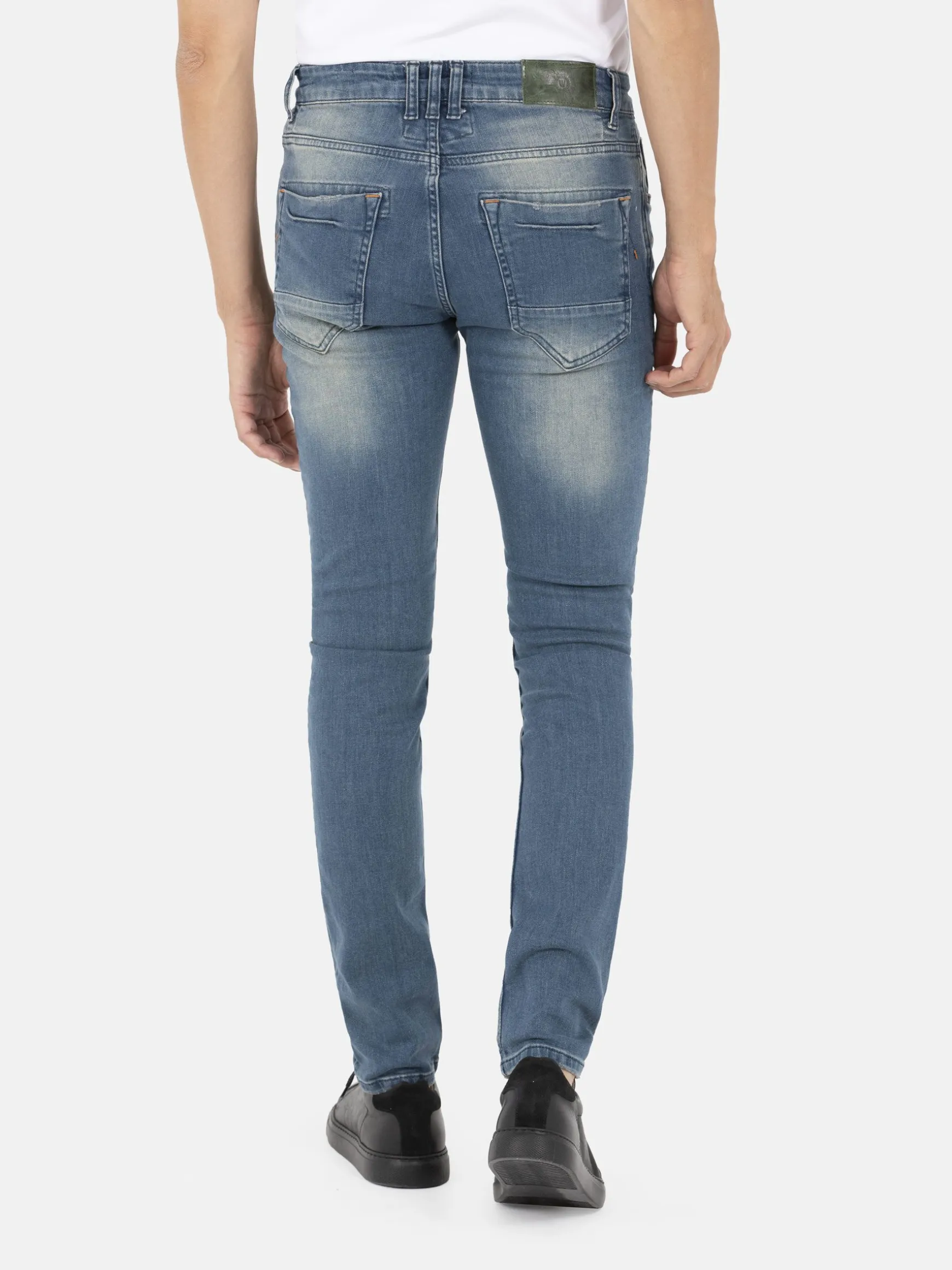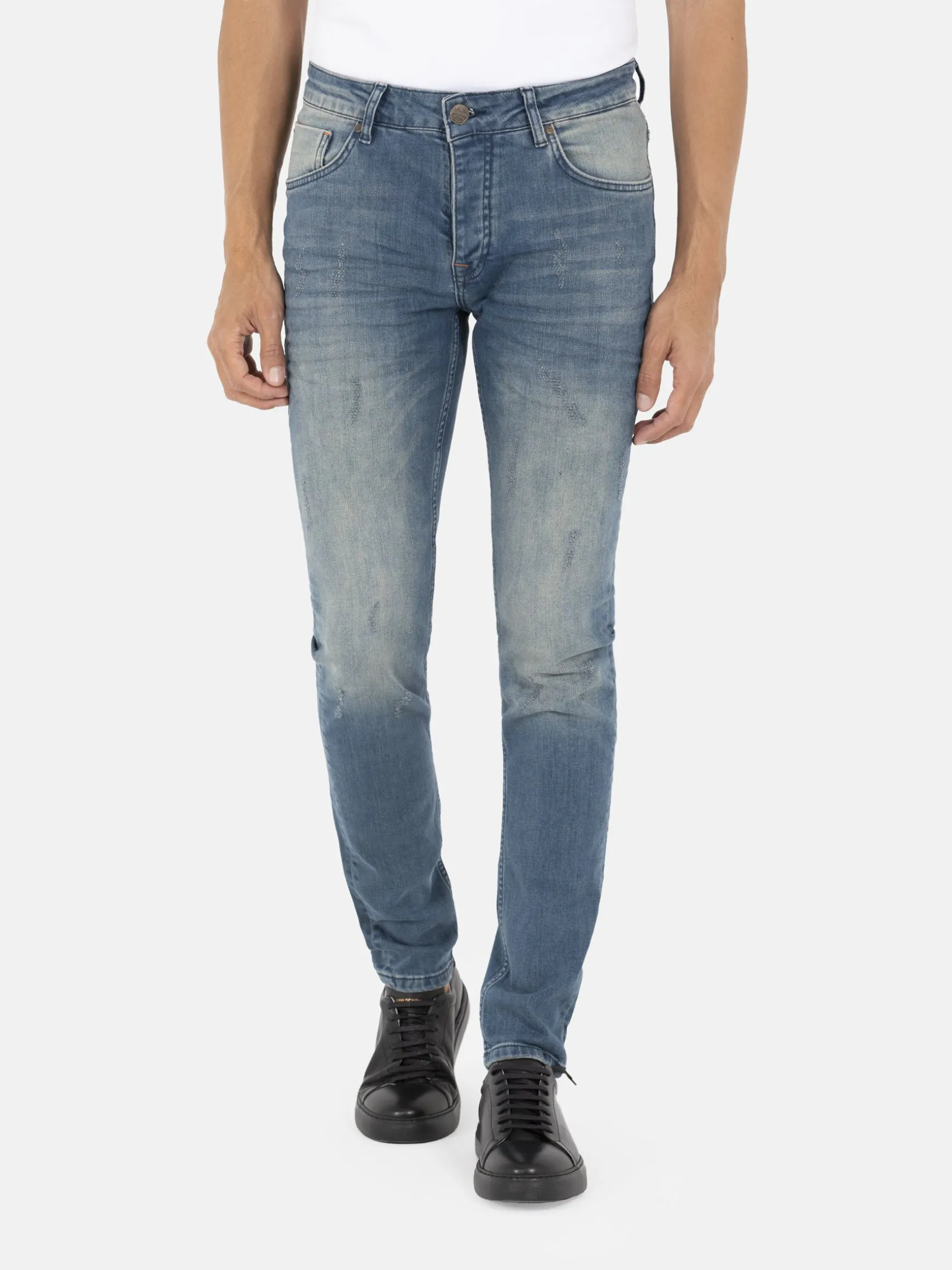 Blauwe jeans met een getailleerde taille en smalle broekspijpen. De jeans heeft een knoopsluiting en is afgewerkt met een groen merklabel boven de rechter achterzak.