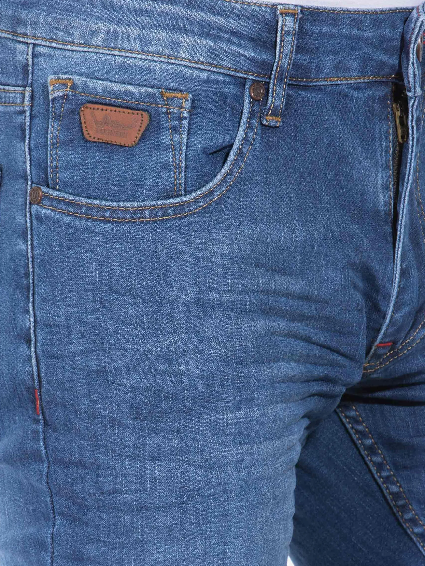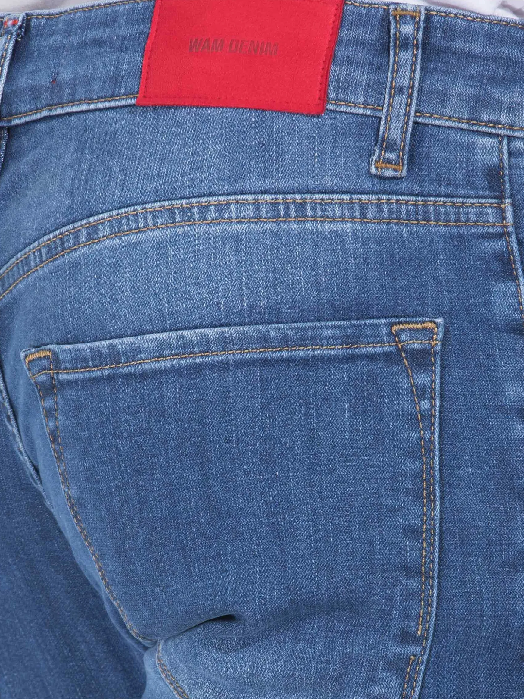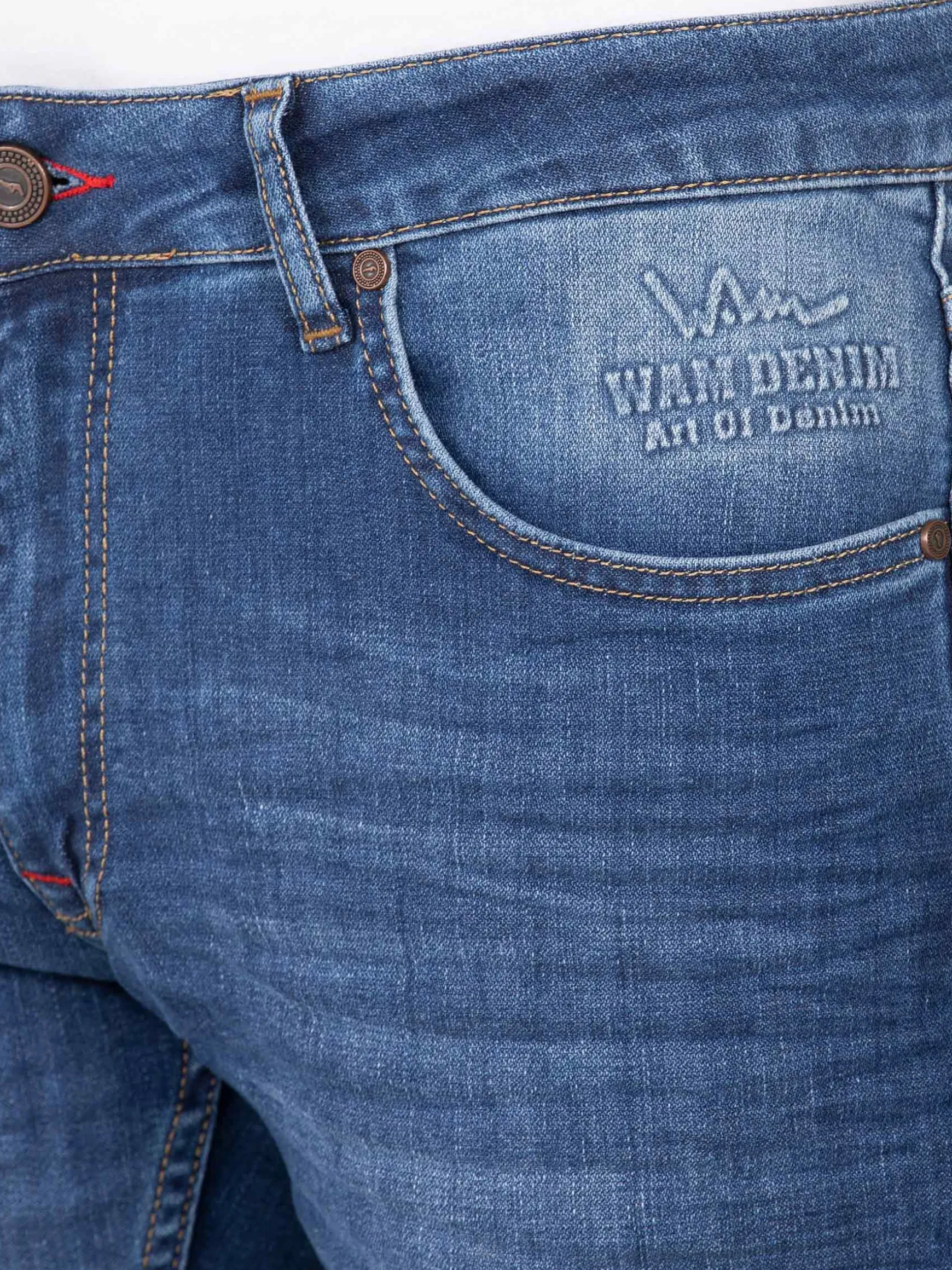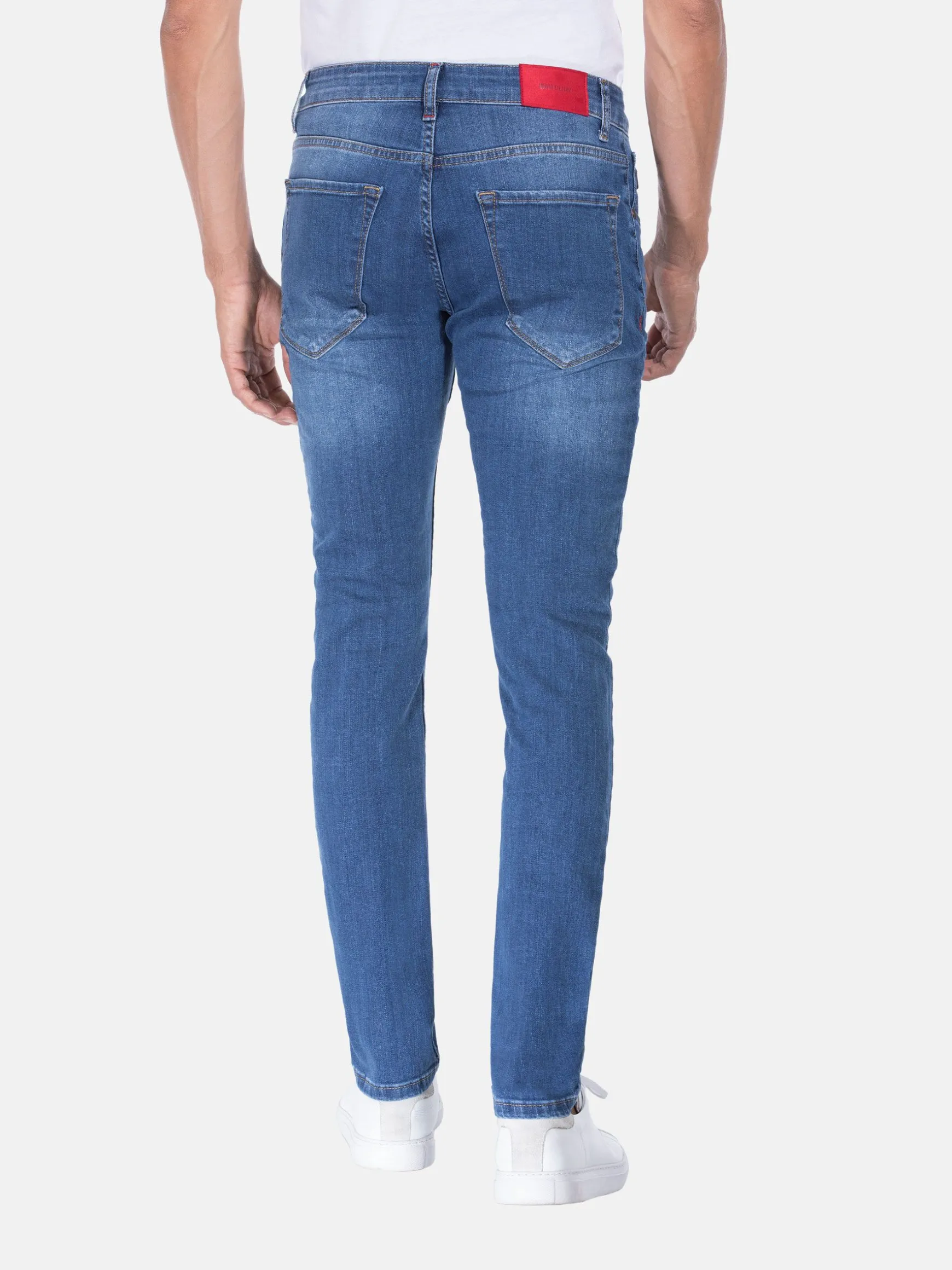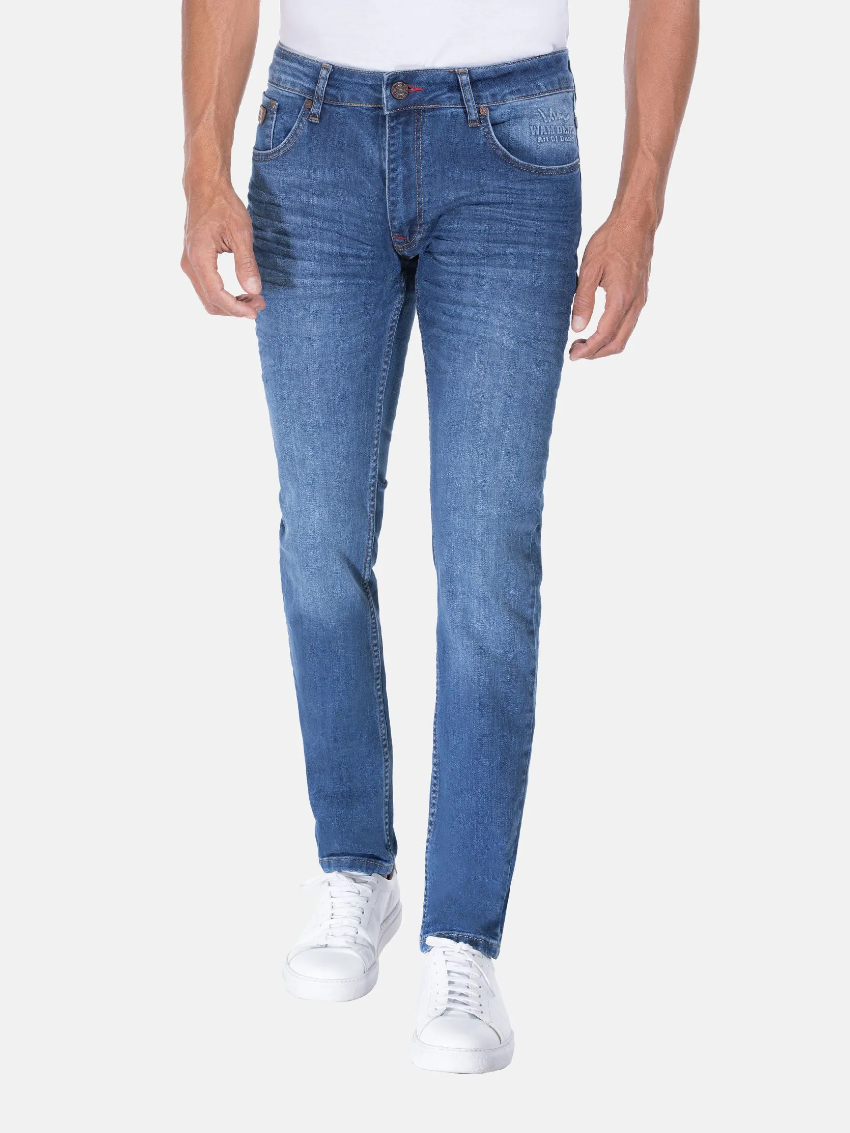 Lichtblauwe jeans met stone wash. Dit model heeft twee voor- en achterzakken. Boven de rechter achterzak is een rood merkembleem bevestigd.