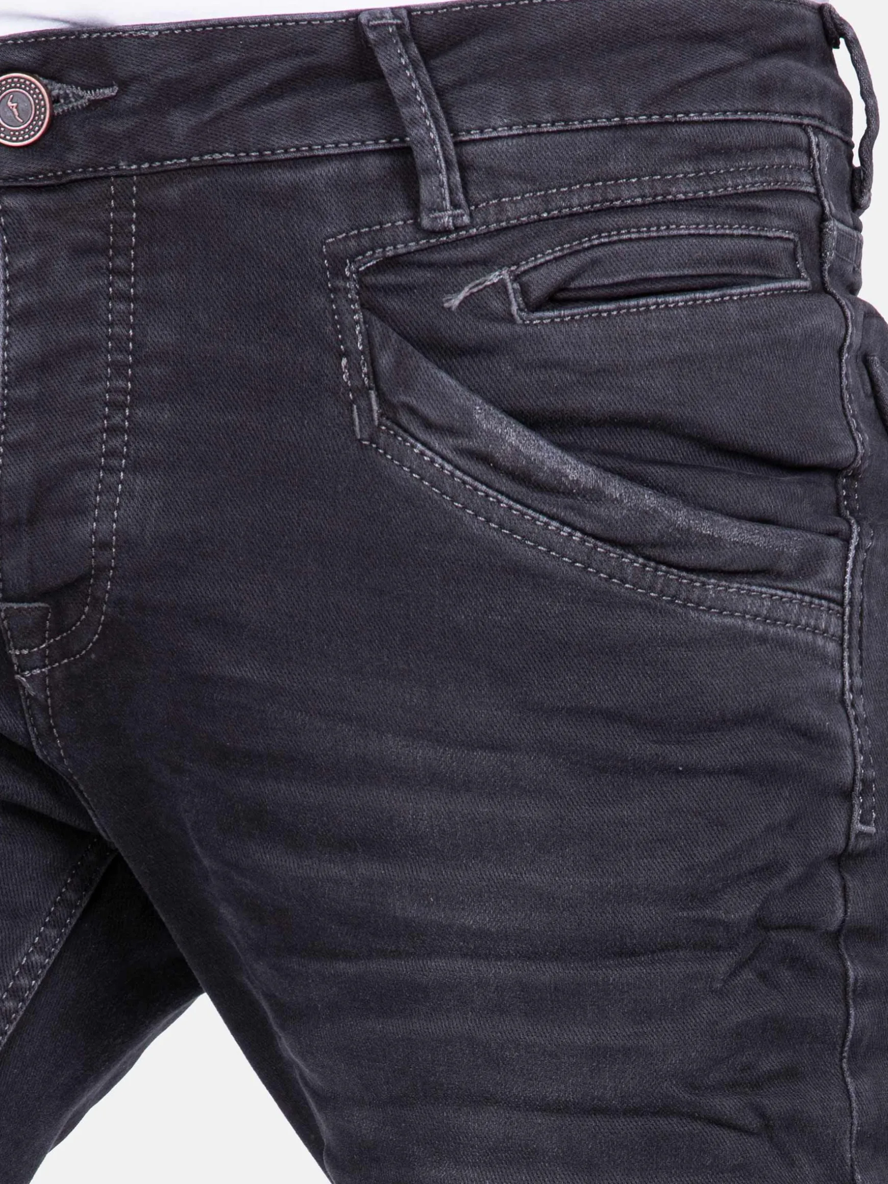 Stoere 5-pocket zwarte jeans met recht aflopende broekspijpen. Dit model met knoopsluiting heeft enkele slijtageplekken voor het effect. Staat heel goed met een sweater of T-shirt, maar kan evengoed gedragen worden met een overhemd.
