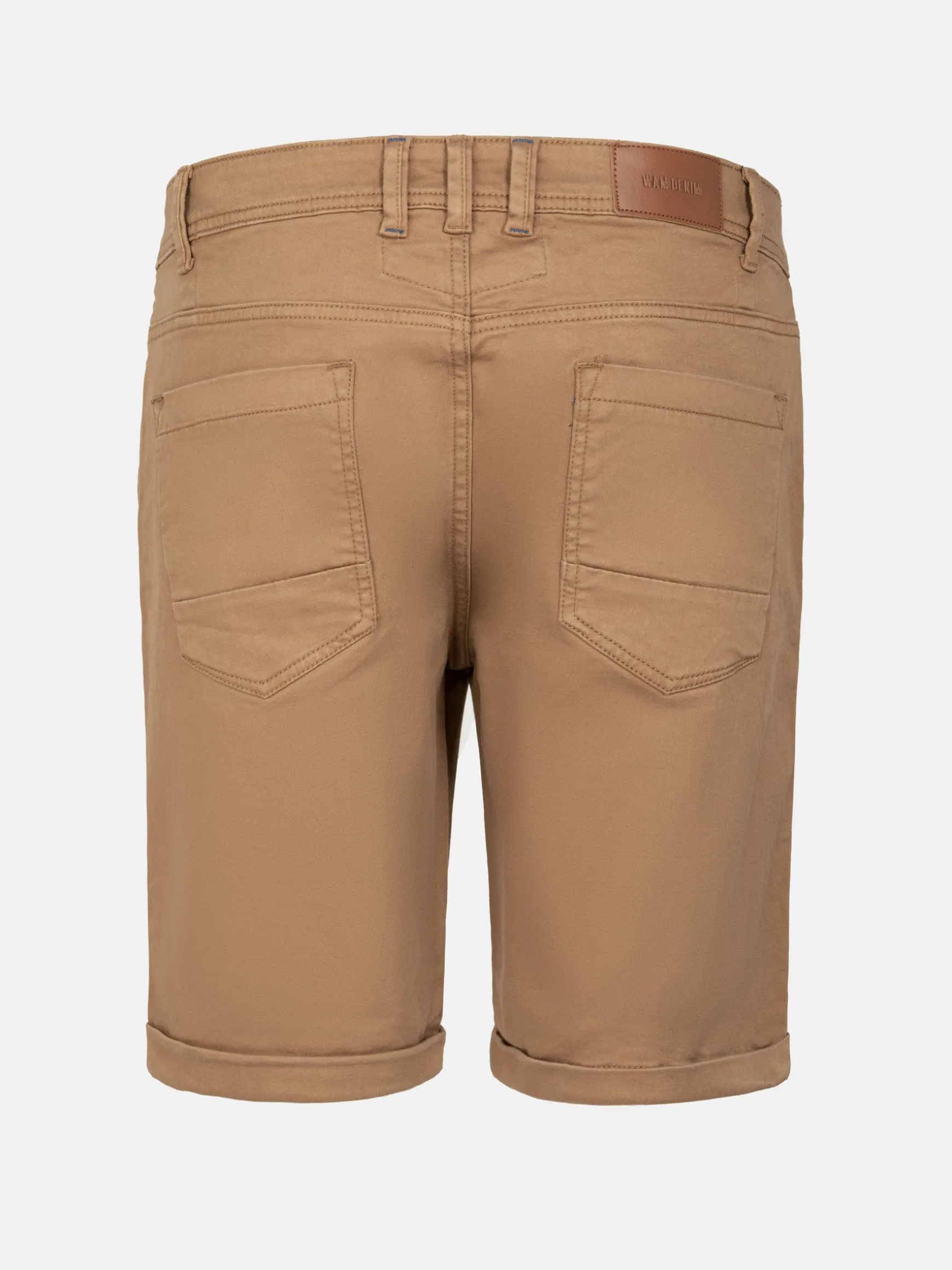 Fia Stretchy Beige Korte Broek. Deze Shorts is gemaakt van elastische stof en heeft een ritssluiting, vier zakken, waaronder een klein horlogezakje, en klinknagels om de spanningspunten te verstevigen. De diepe marineblauwe kleur voegt een modern tintje toe, waardoor hij perfect is voor elke gelegenheid.