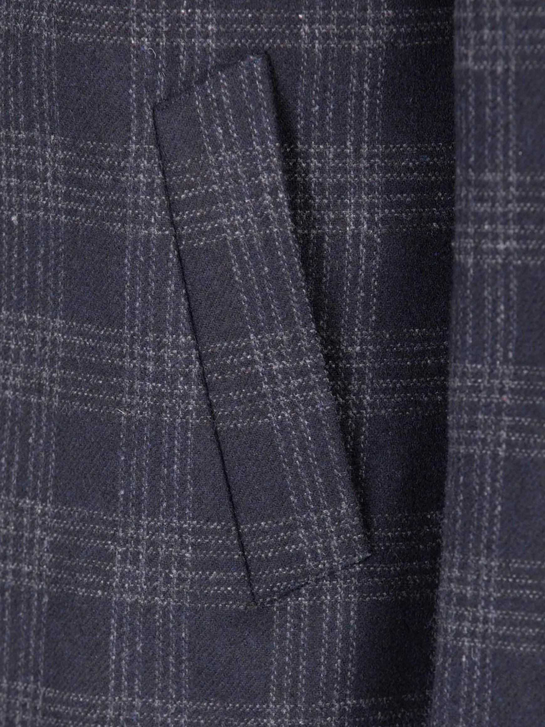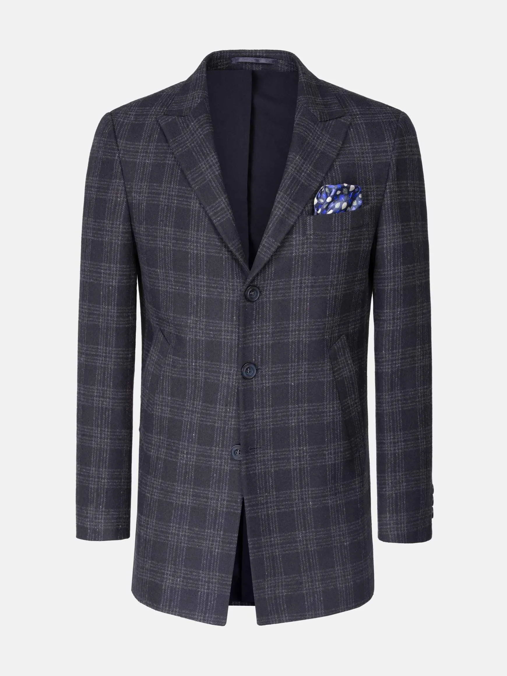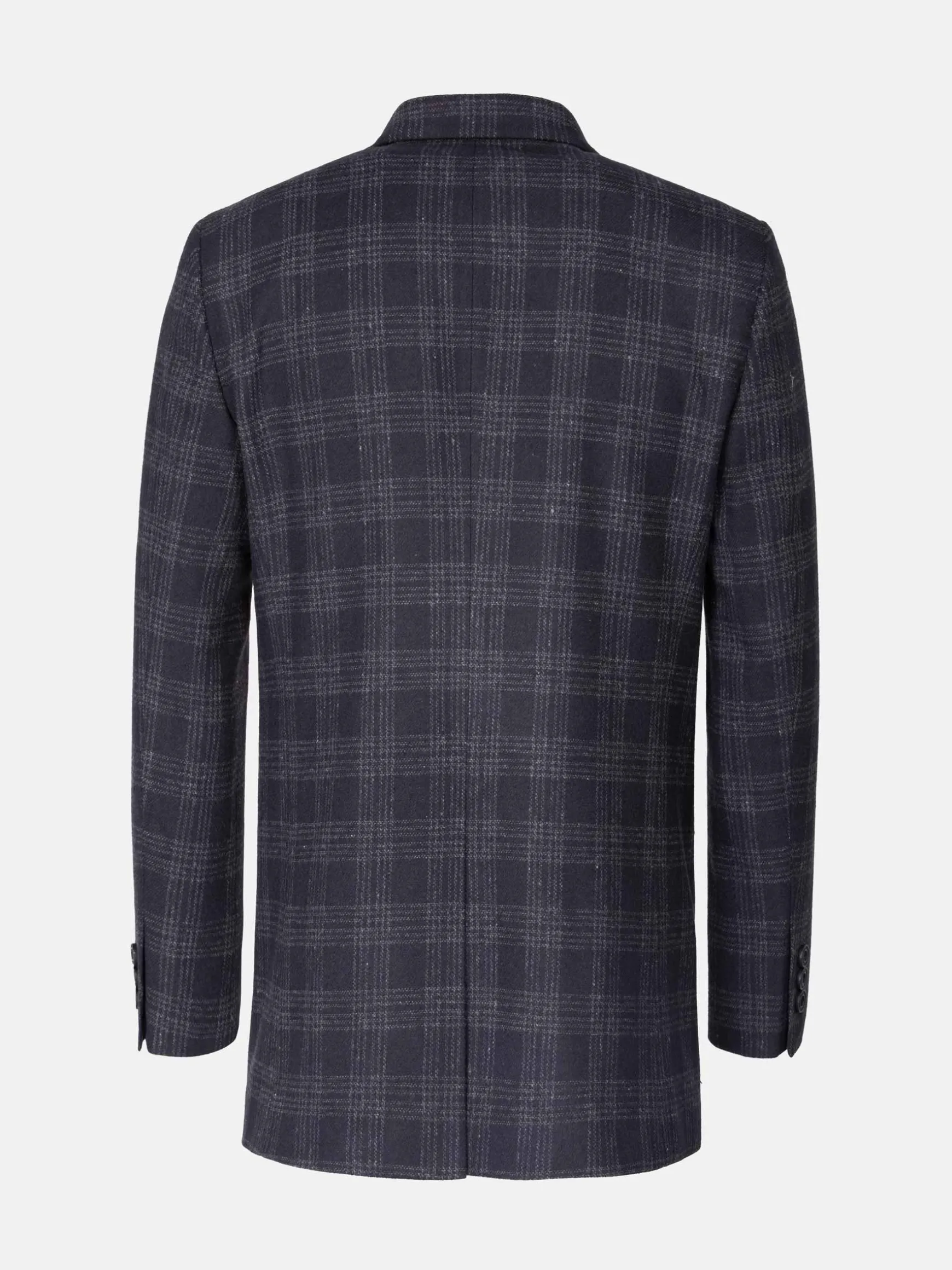 Stijlvolle trenchcoat met ruitpatroon. Deze jas heeft een mooie donkerblauwe kleur, afgewerkt met grote, blauwe knopen. Dit model past goed op een pantalon, maar ook op een nette jeans. De borstzak van het jasje kan, wanneer deze naar buiten wordt gedraaid, worden gepresenteerd als een extra accessoire in de vorm van een pochet van 100% polyester.