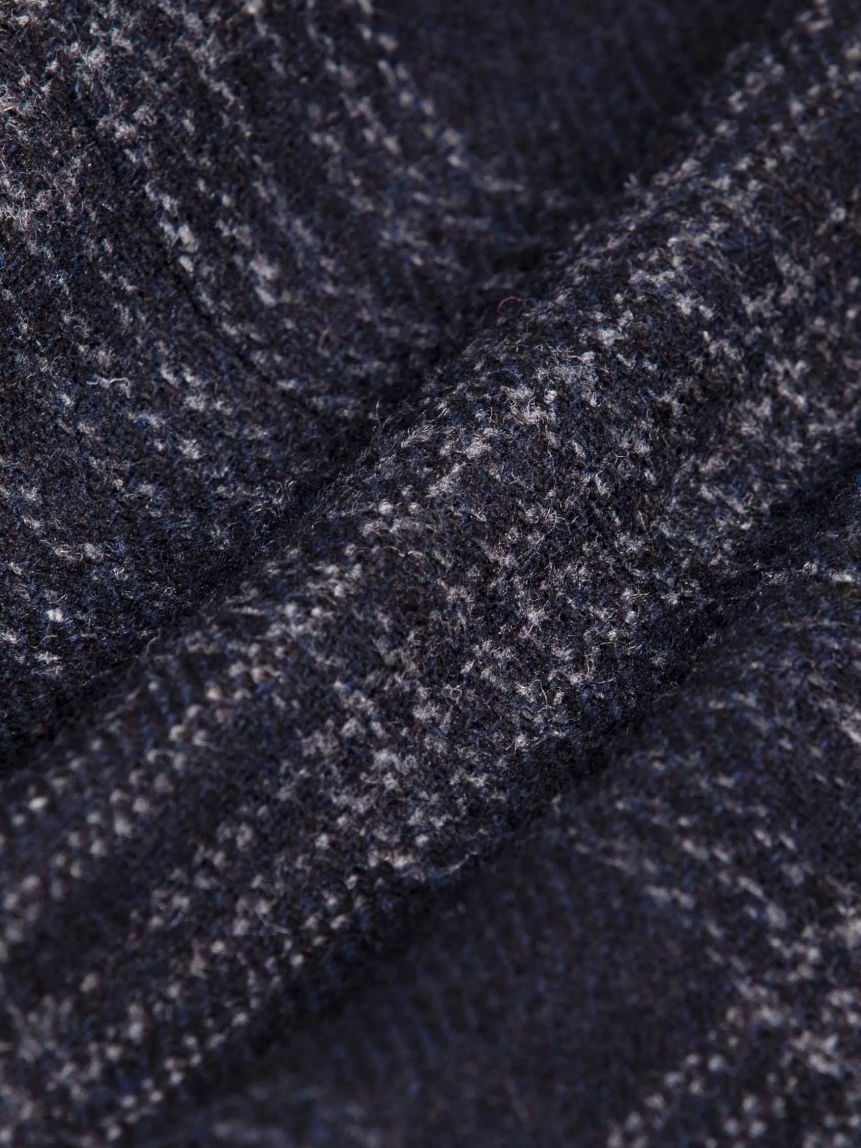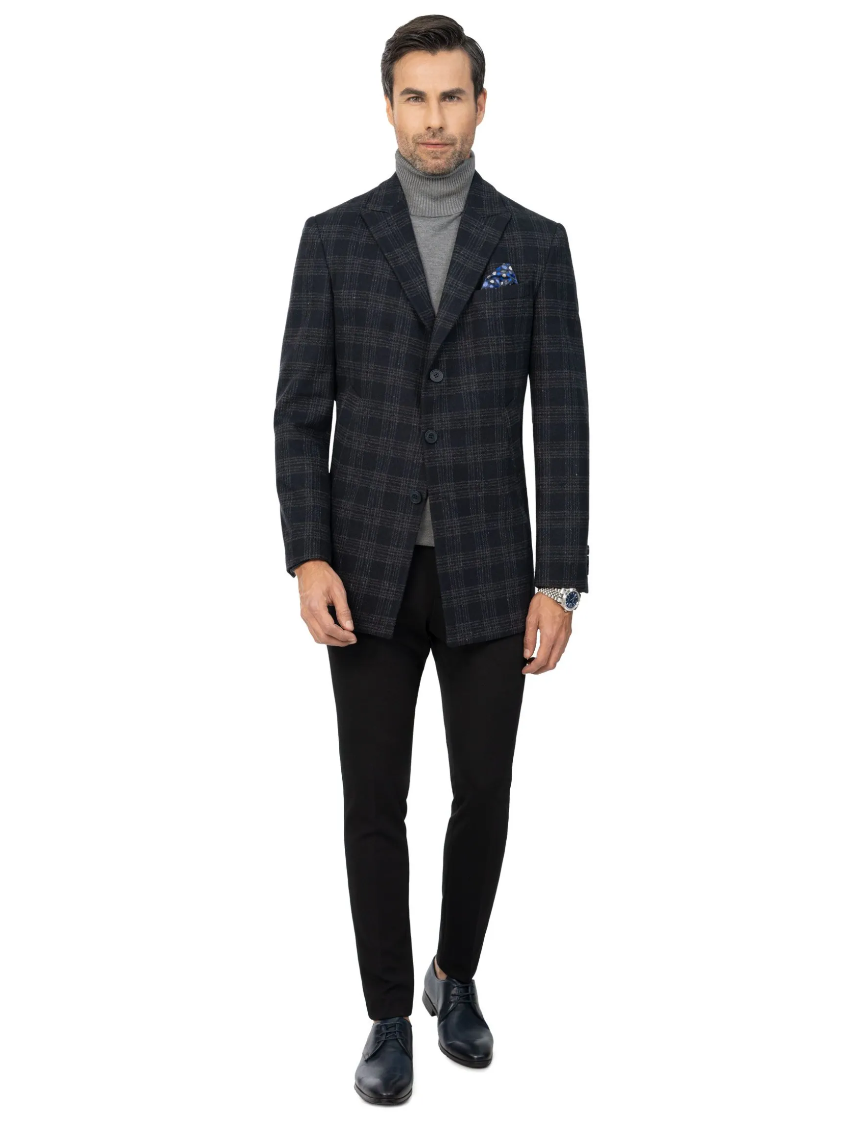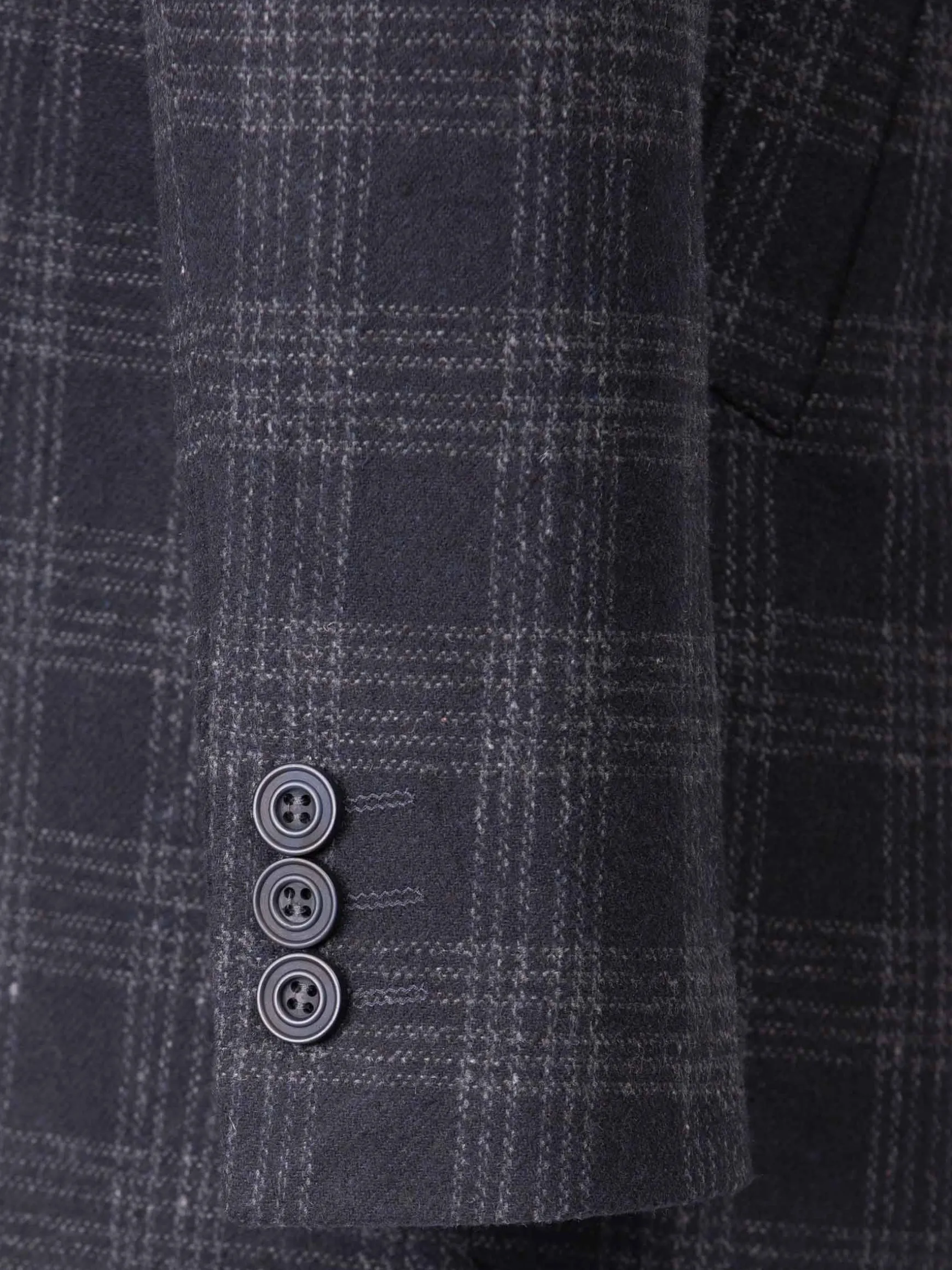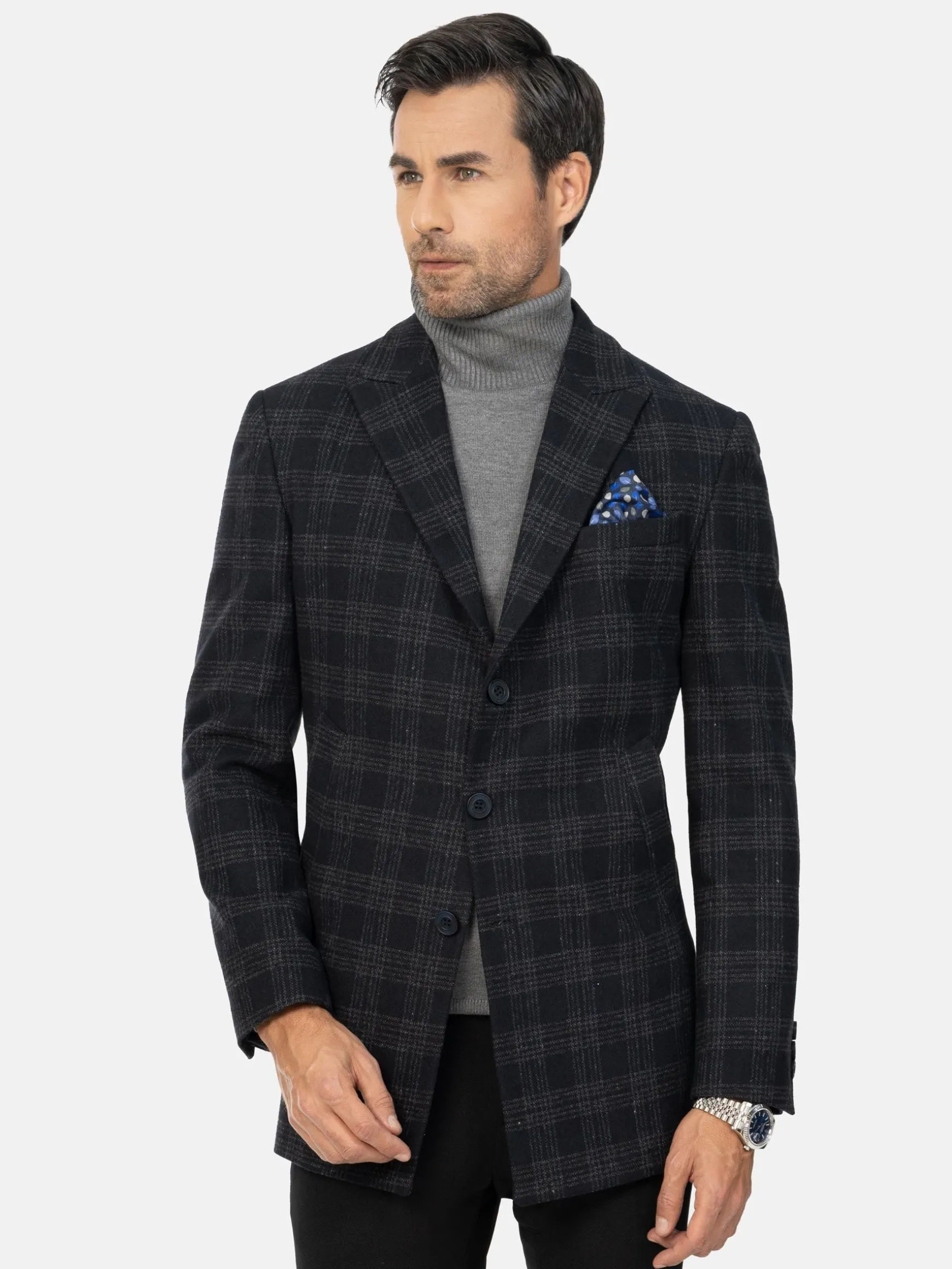 Stijlvolle trenchcoat met ruitpatroon. Deze jas heeft een mooie donkerblauwe kleur, afgewerkt met grote, blauwe knopen. Dit model past goed op een pantalon, maar ook op een nette jeans. De borstzak van het jasje kan, wanneer deze naar buiten wordt gedraaid, worden gepresenteerd als een extra accessoire in de vorm van een pochet van 100% polyester.