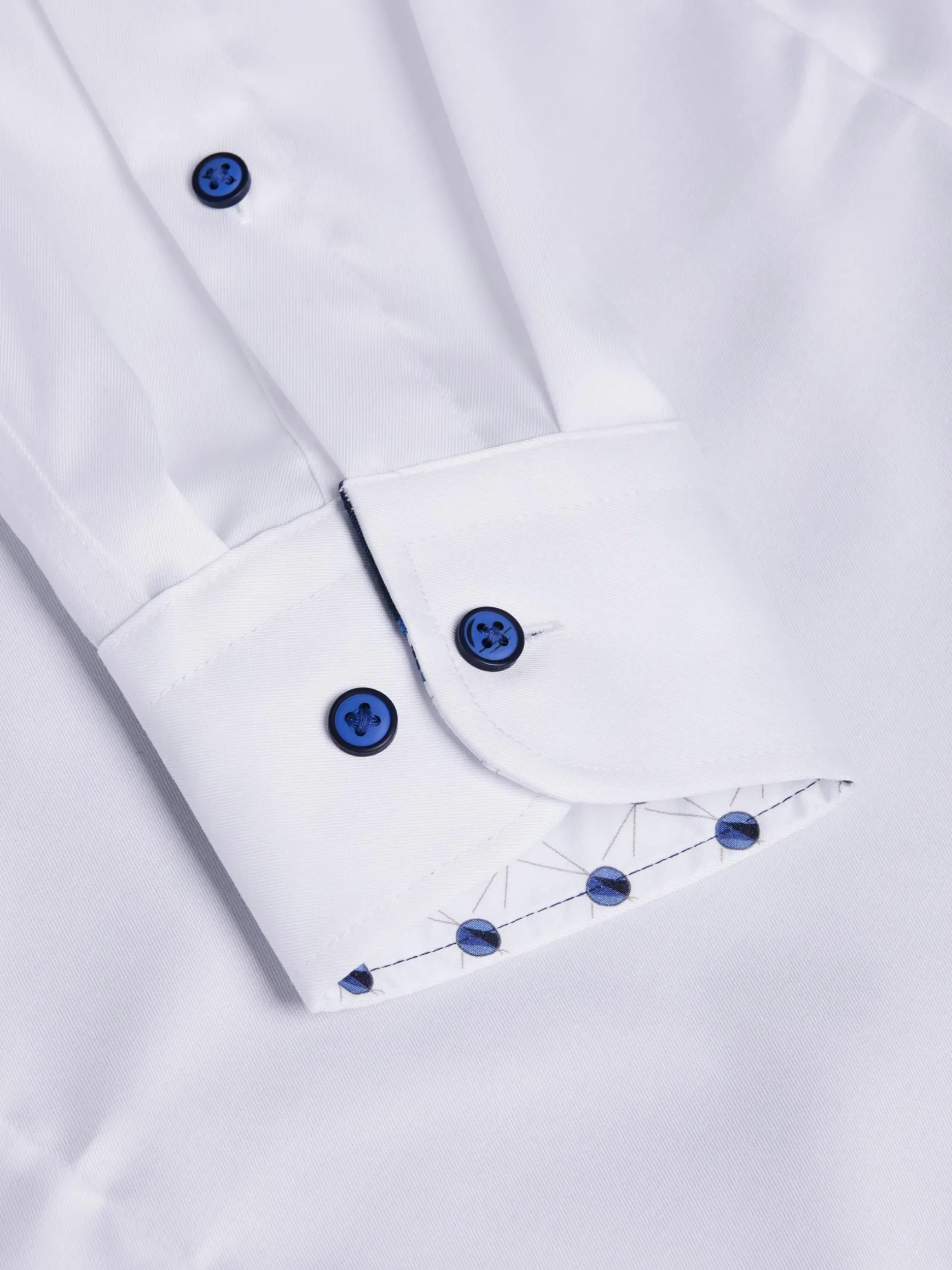 Een klassiek wit overhemd met een twist. De fraaie blauwe knopen geven dit ontwerp net iets extra’s en de binnen kant van de kraag en de manchet zijn speels vormgegeven. Eindeloos te combineren met kleuren en geschikt om te dragen voor veel verschillende gelegenheden. Een must voor iedere garderobe.