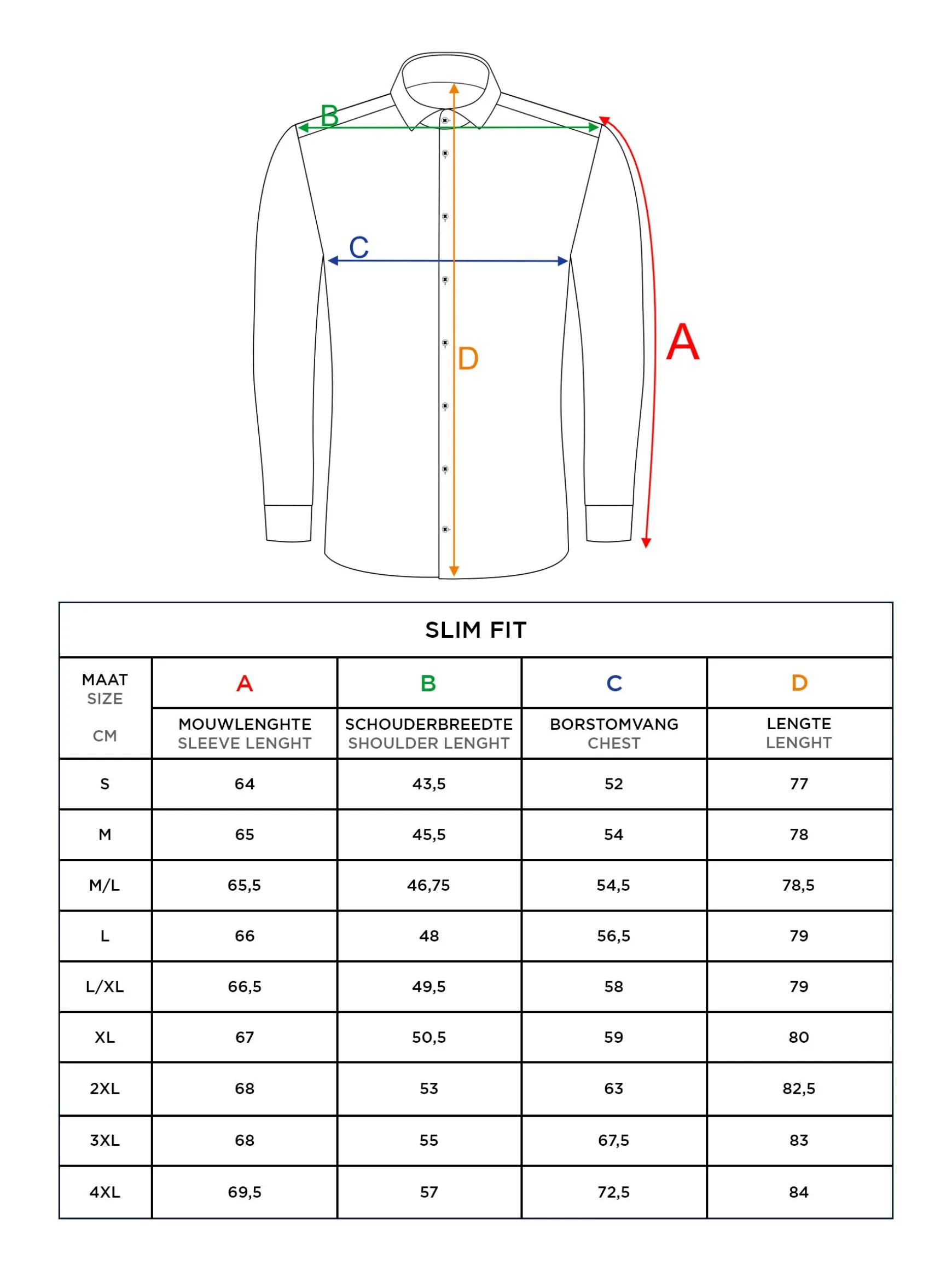 Bestaande uit 96% katoen, 4% lycra. Om de kwaliteit te behouden, raden we aan dit overhemd binnenstebuiten te wassen op 30°C. Niet bleken. Strijken op een temperatuur van 110°C. Niet geschikt voor de droger.