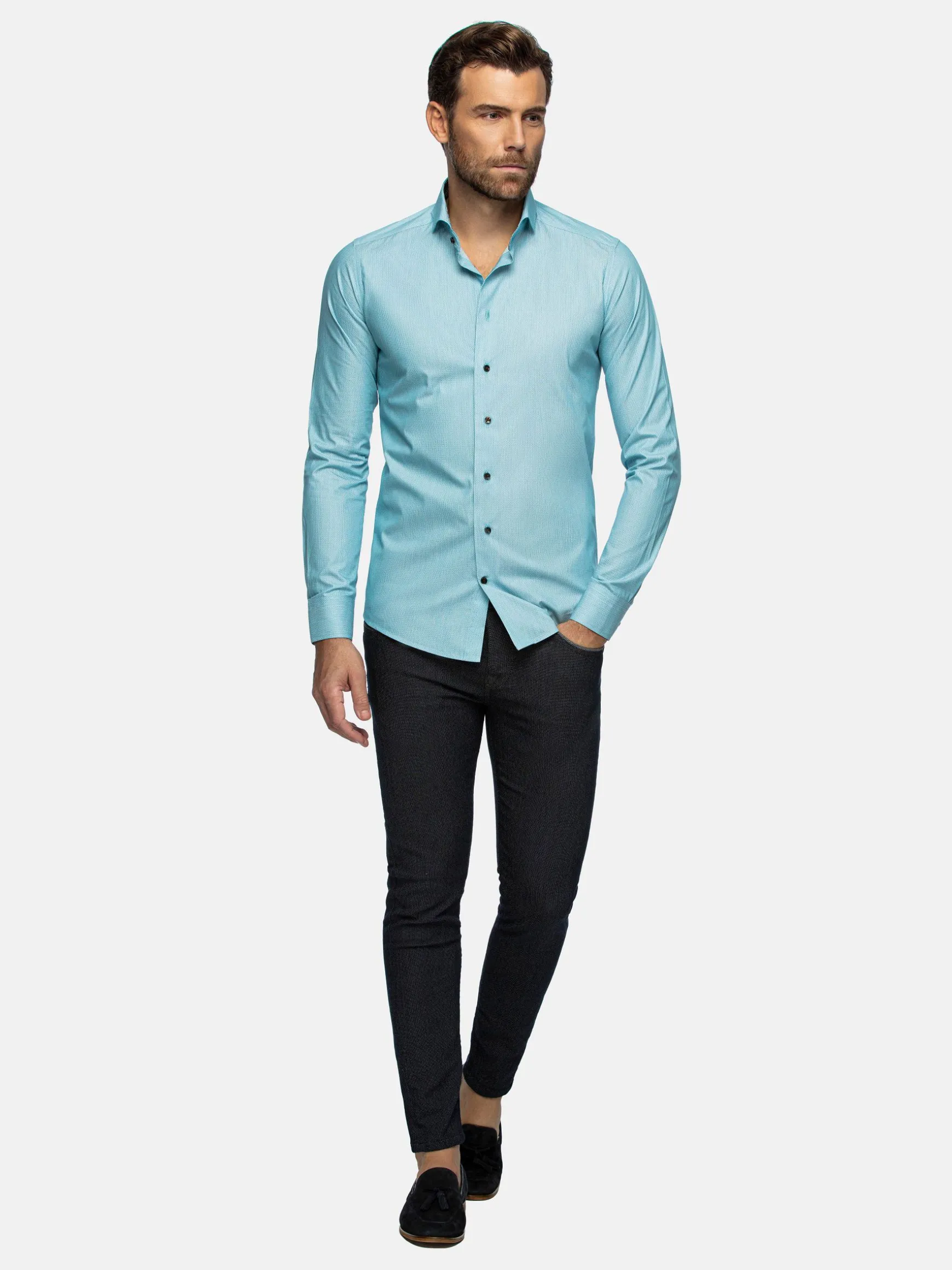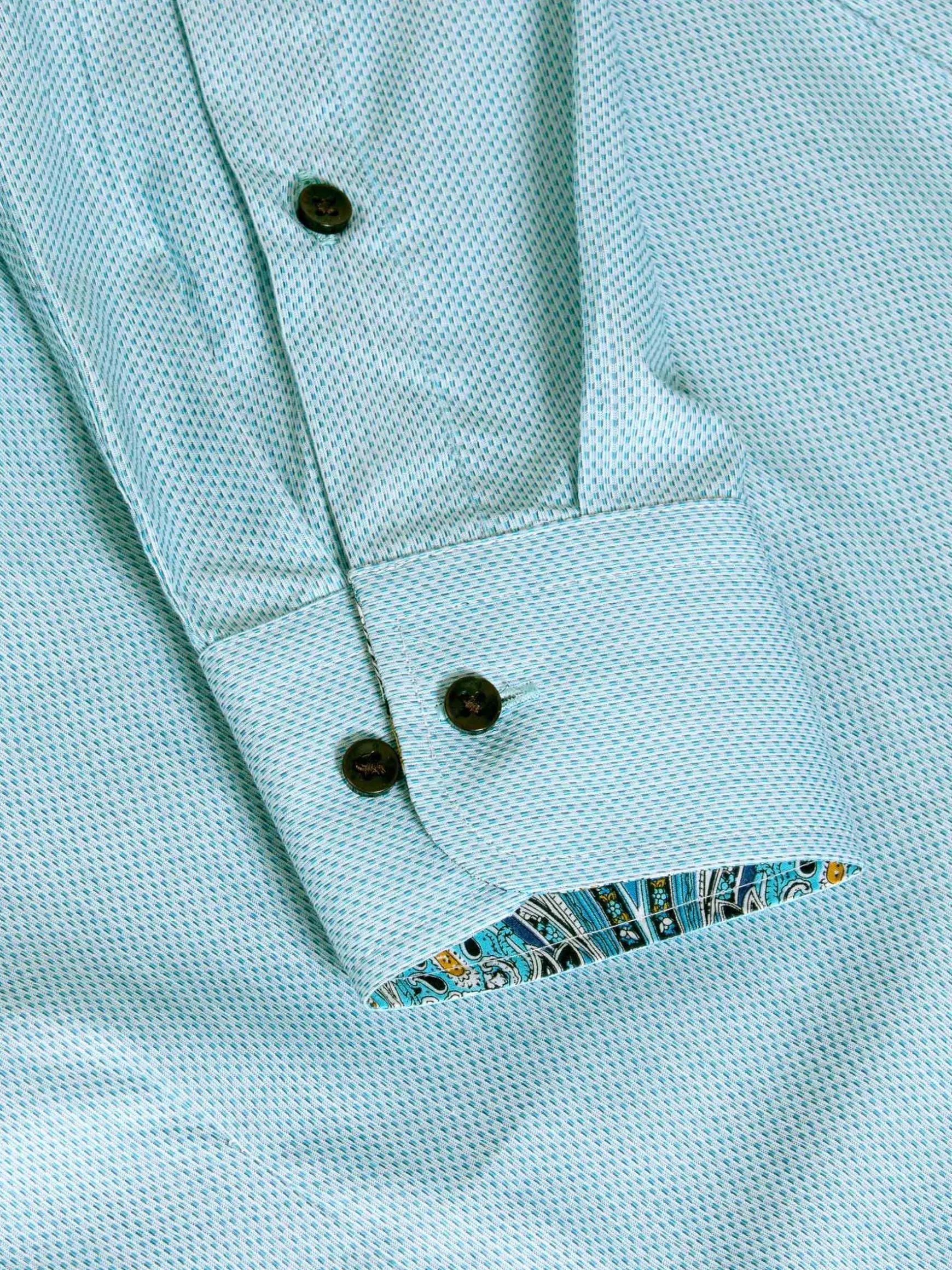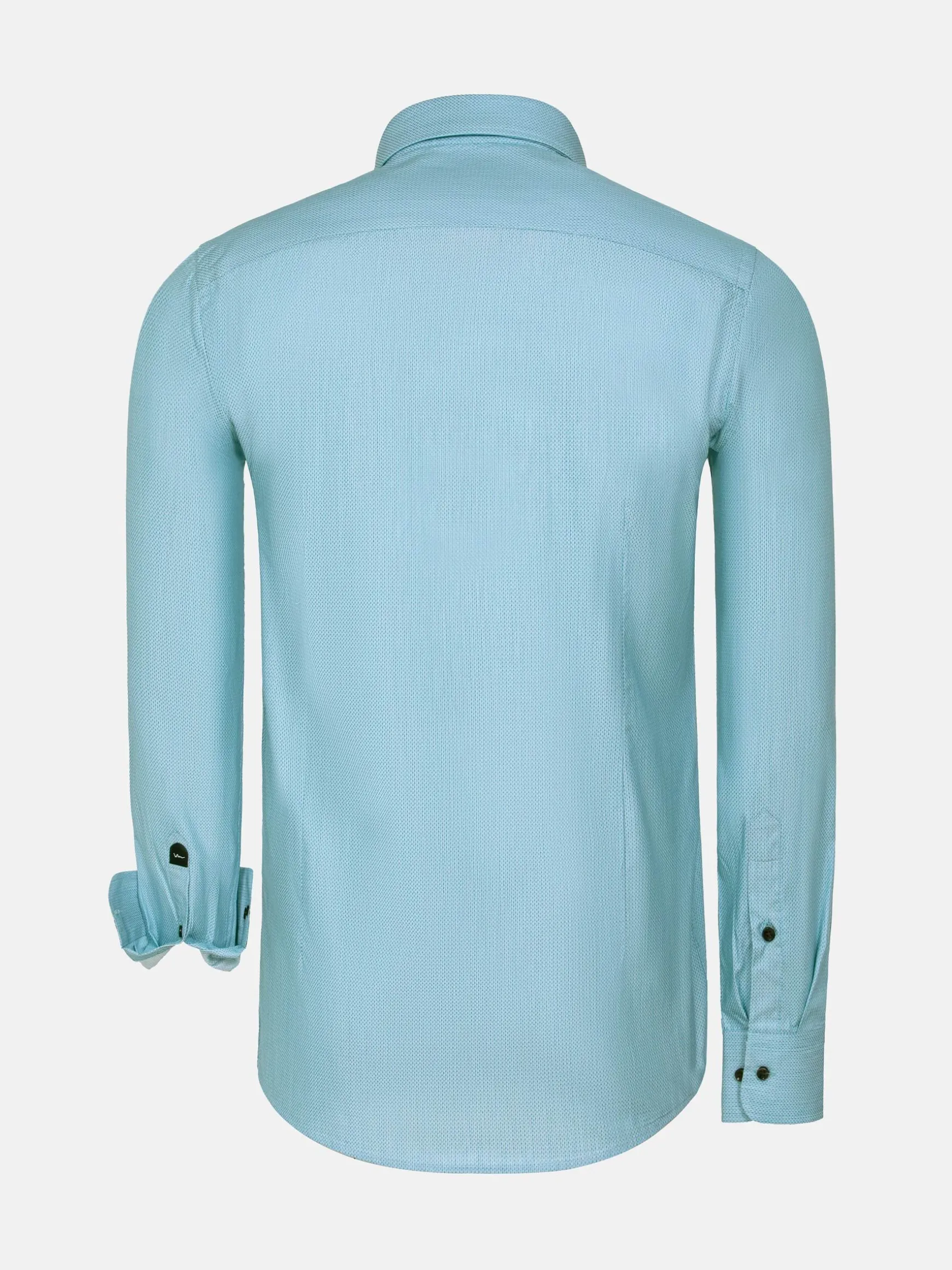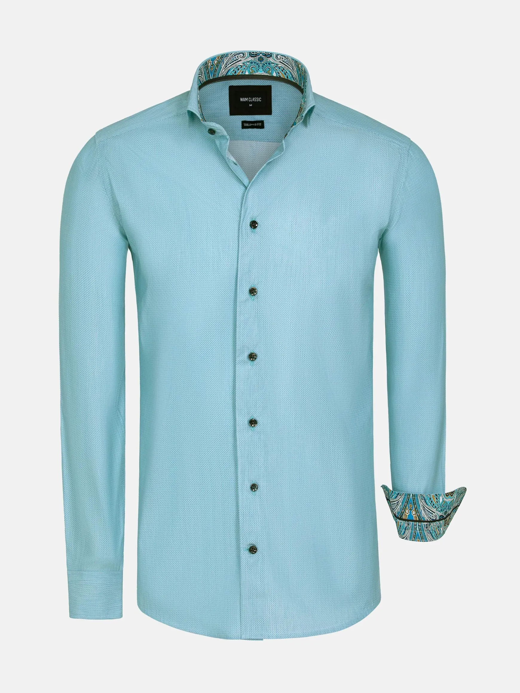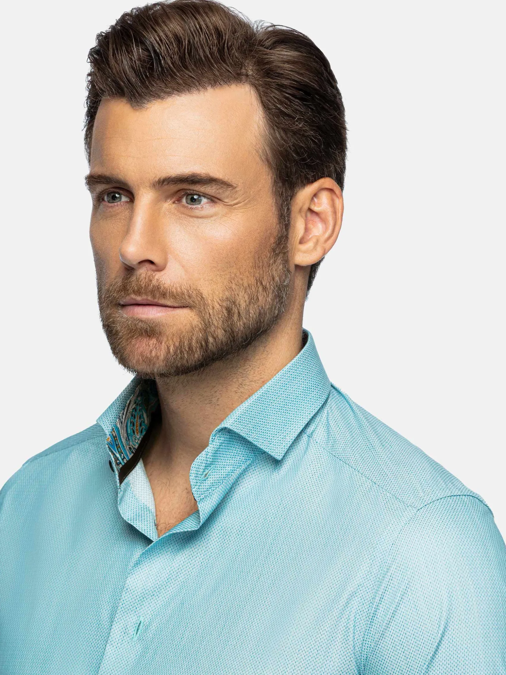 Getailleerd overhemd in een mooie kleur turquoise. Dit model loopt van onderen licht rond af en is afgewerkt met donkere knopen. De manchet heeft een kleurrijke binnenzijde. Bij het omslaan van de manchet creëer je daarmee een mooi effect. Naast deze kleur is er een ook een licht turquoise kleur verkrijgbaar.