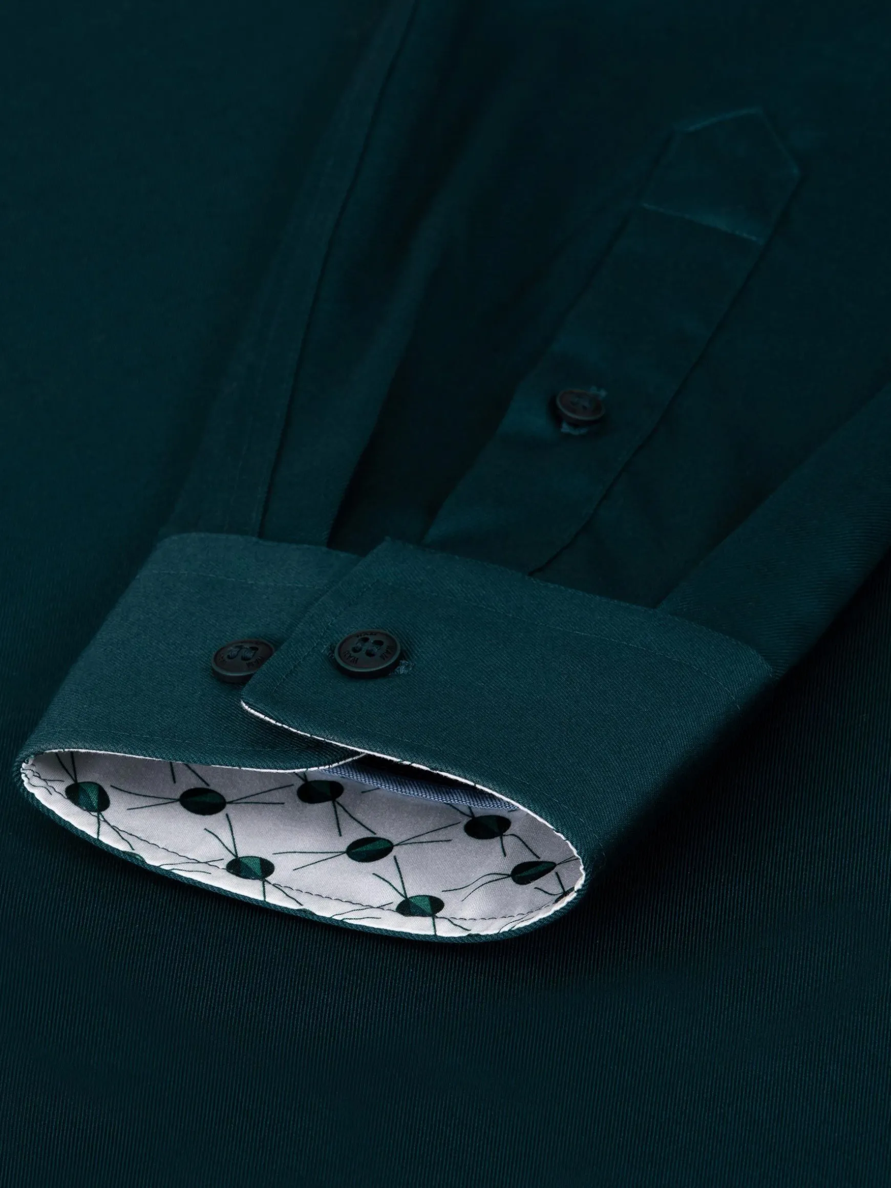 Petrol overhemd met cognackleurige knopen en doorlopende bies. Het overhemd heeft een mooie glans en verschillende details. De binnenkant van de kraag en manchet heeft een leuk stippenpatroon.