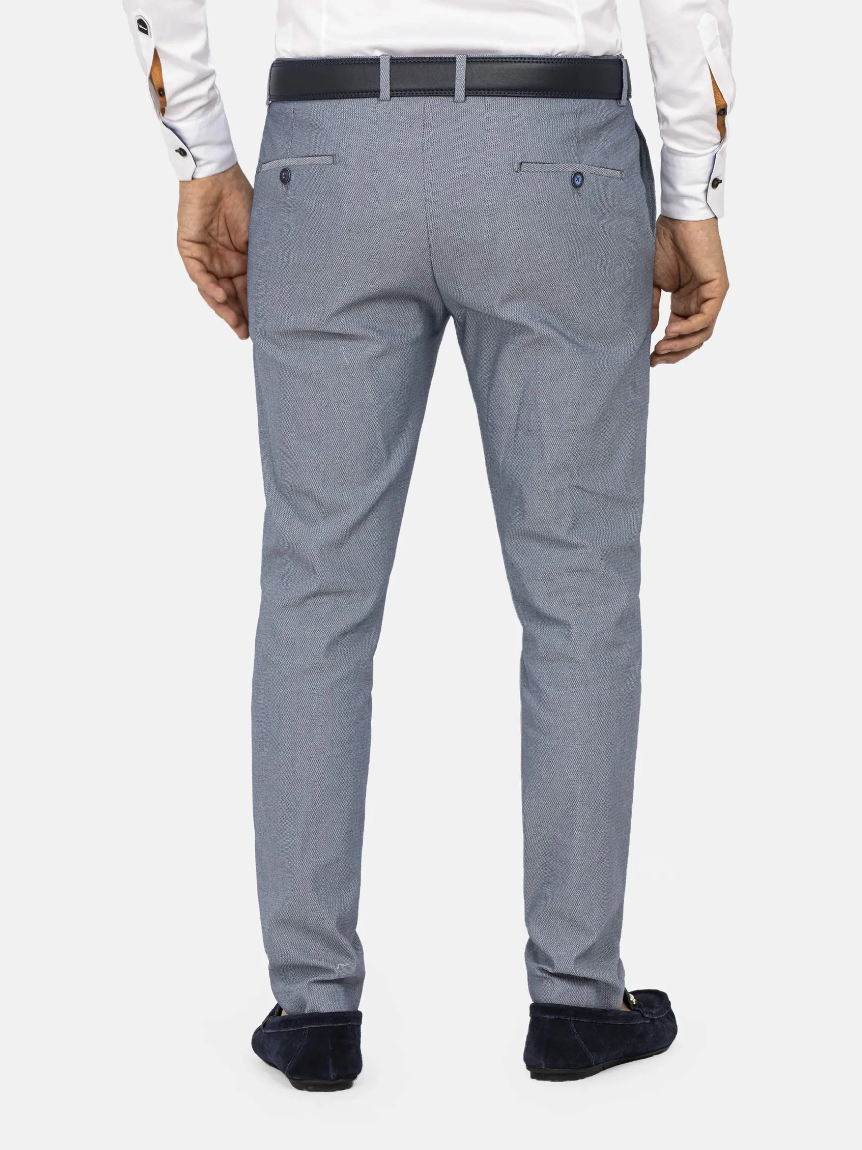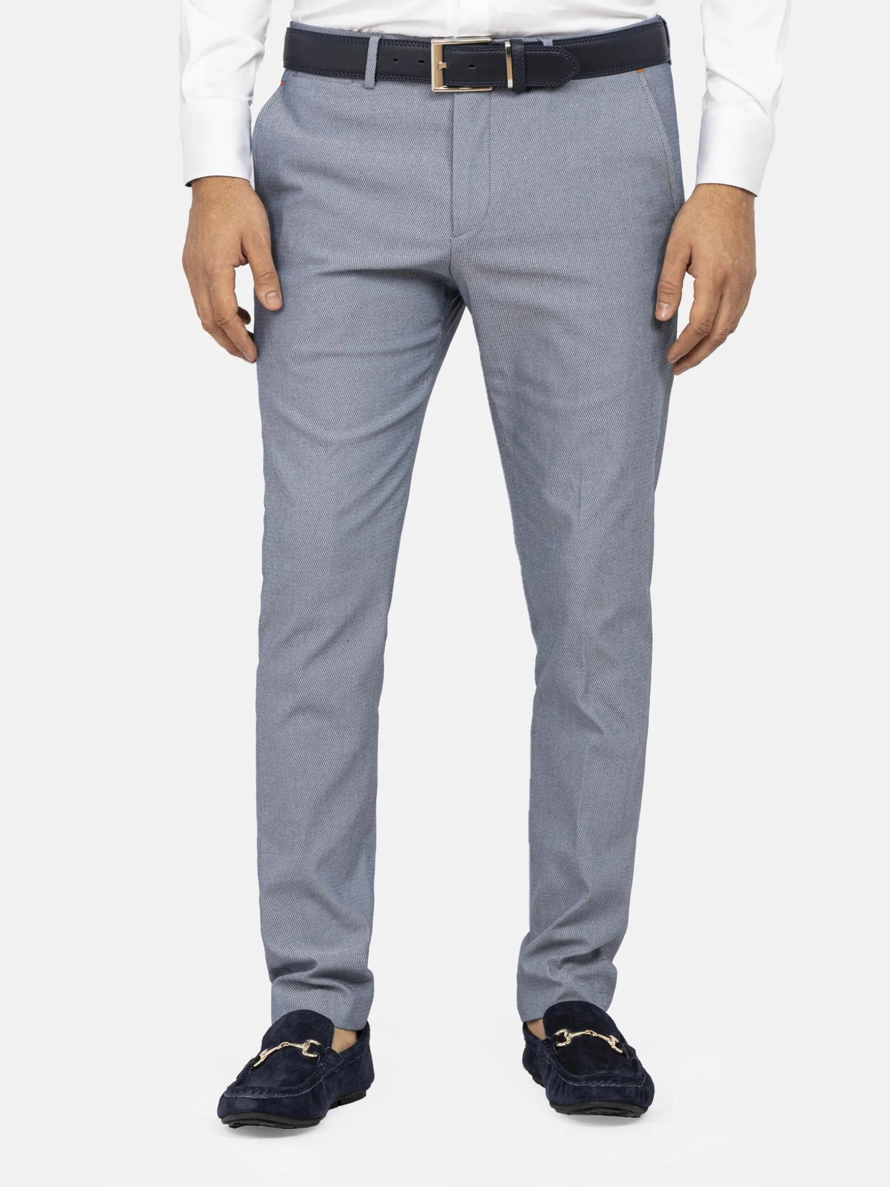 Blauwe pantalon met ritsluiting. Deze pantalon is de basis voor een chique outfit. Combineer met een overhemd met bijvoorbeeld bloemenmotief. Maak de outfit af met een mooi getailleerd colbert.