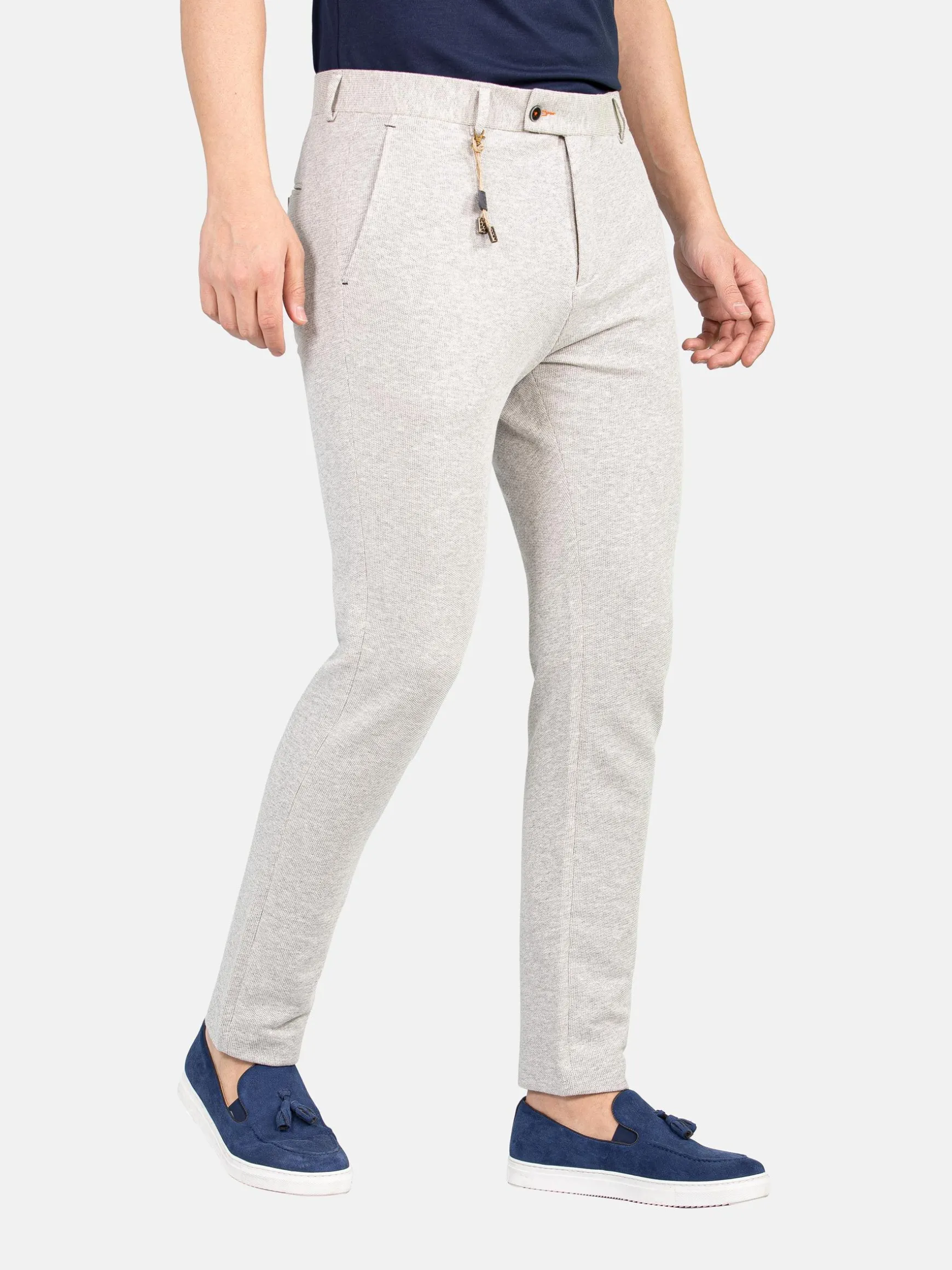 Stijlvolle, grijze pantalon met ritssluiting. Door de stof voelt de pantalon heel zacht aan. Dit ontwerp heeft aflopende pijpen en twee steekzakken aan de voor- en achterzijde.