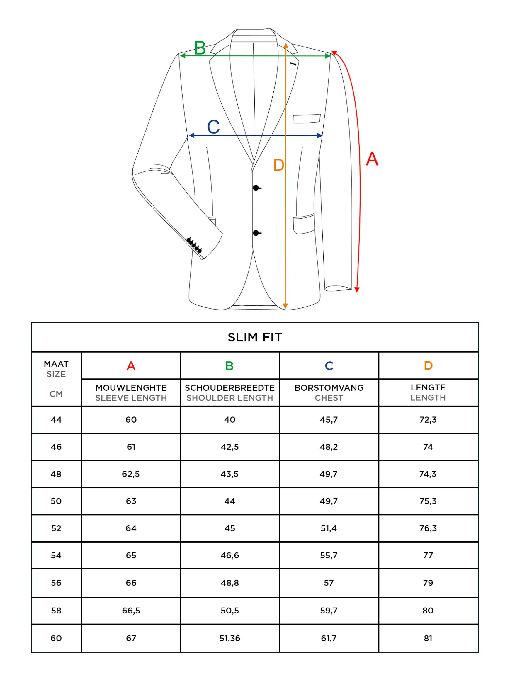 Bestaat uit 52% Katoen 44% Polyester 04% Elastaan. Om de kwaliteit te behouden, adviseren wij chemisch reinigen. Niet bleken. Strijken op een temperatuur van 150 °C. Niet geschikt voor de droger.