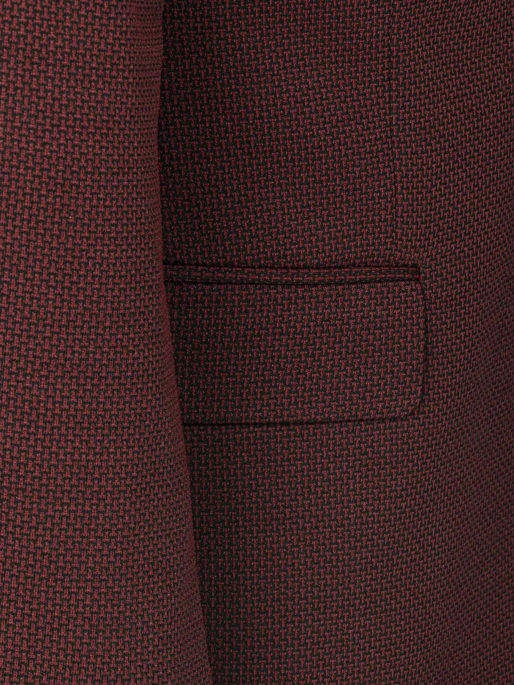 Franco donkerrode blazer, met een kenmerkende textuur van spijkerkopstof. Deze slim-fit blazer biedt een gestroomlijnde look met een single-breasted ontwerp en Peak revers. Het heeft praktische details zoals binnen- en klepzakken, samen met een paspelzak op de borst voor extra raffinement. Compleet met vijf hoornen knopen en twee zijopeningen aan de achterkant, combineert deze blazer elegantie met functionaliteit voor een opvallend ensemble. Perfect voor elke gelegenheid.