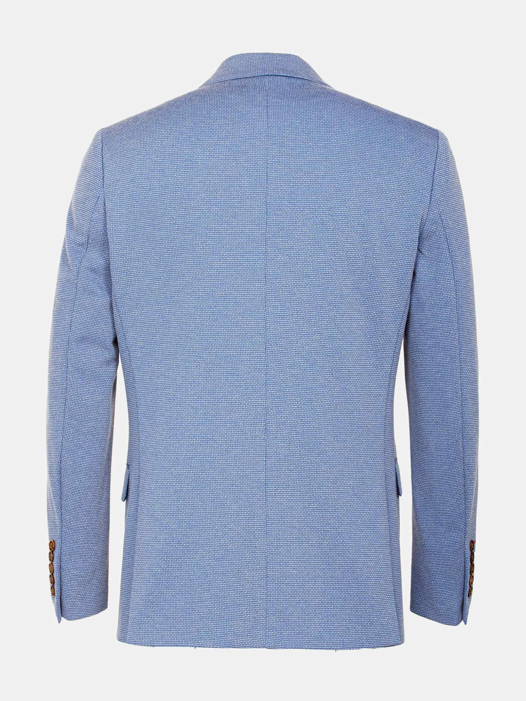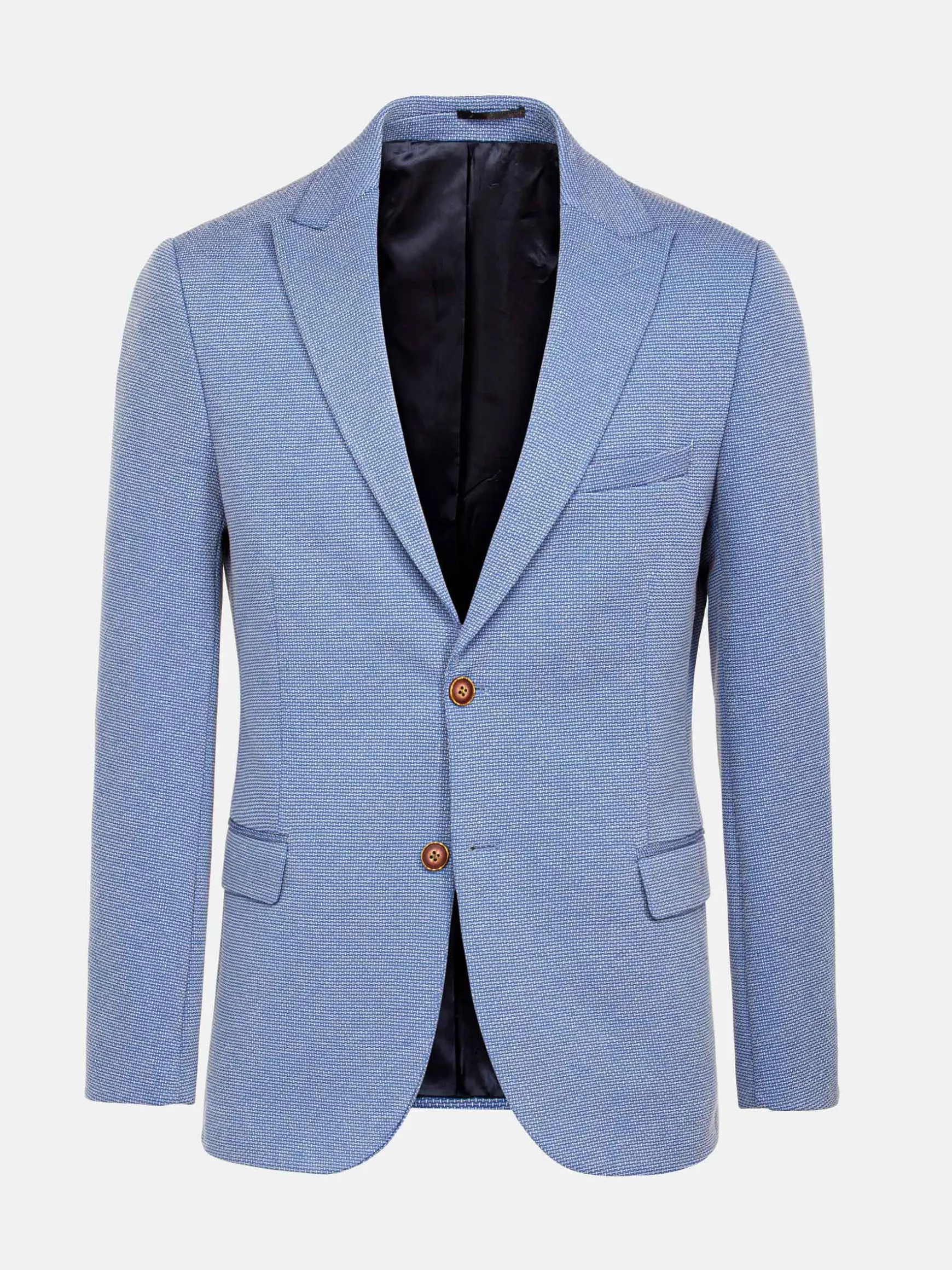 Blauwe blazer van Niklaus, met een kenmerkende textuur van spijkerkopstof. Deze slim-fit blazer biedt een gestroomlijnde look met een single-breasted ontwerp en Peak revers. Het heeft praktische details zoals binnen- en klepzakken, samen met een paspelzak op de borst voor extra raffinement. Compleet met vijf hoornen knopen en twee zijopeningen aan de achterkant, combineert deze blazer elegantie met functionaliteit voor een opvallend ensemble. Perfect voor elke gelegenheid.