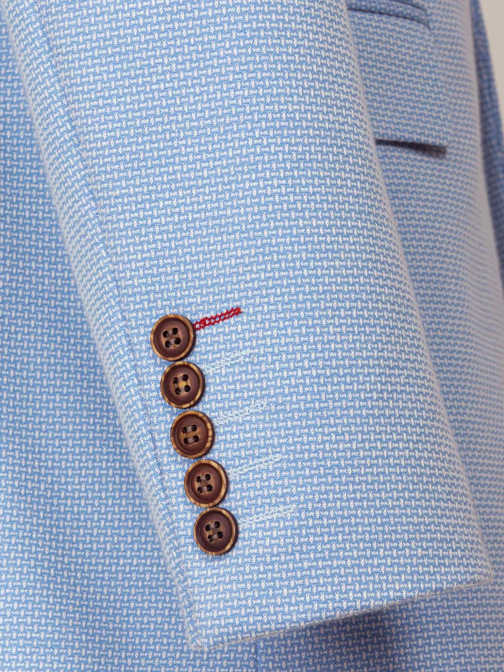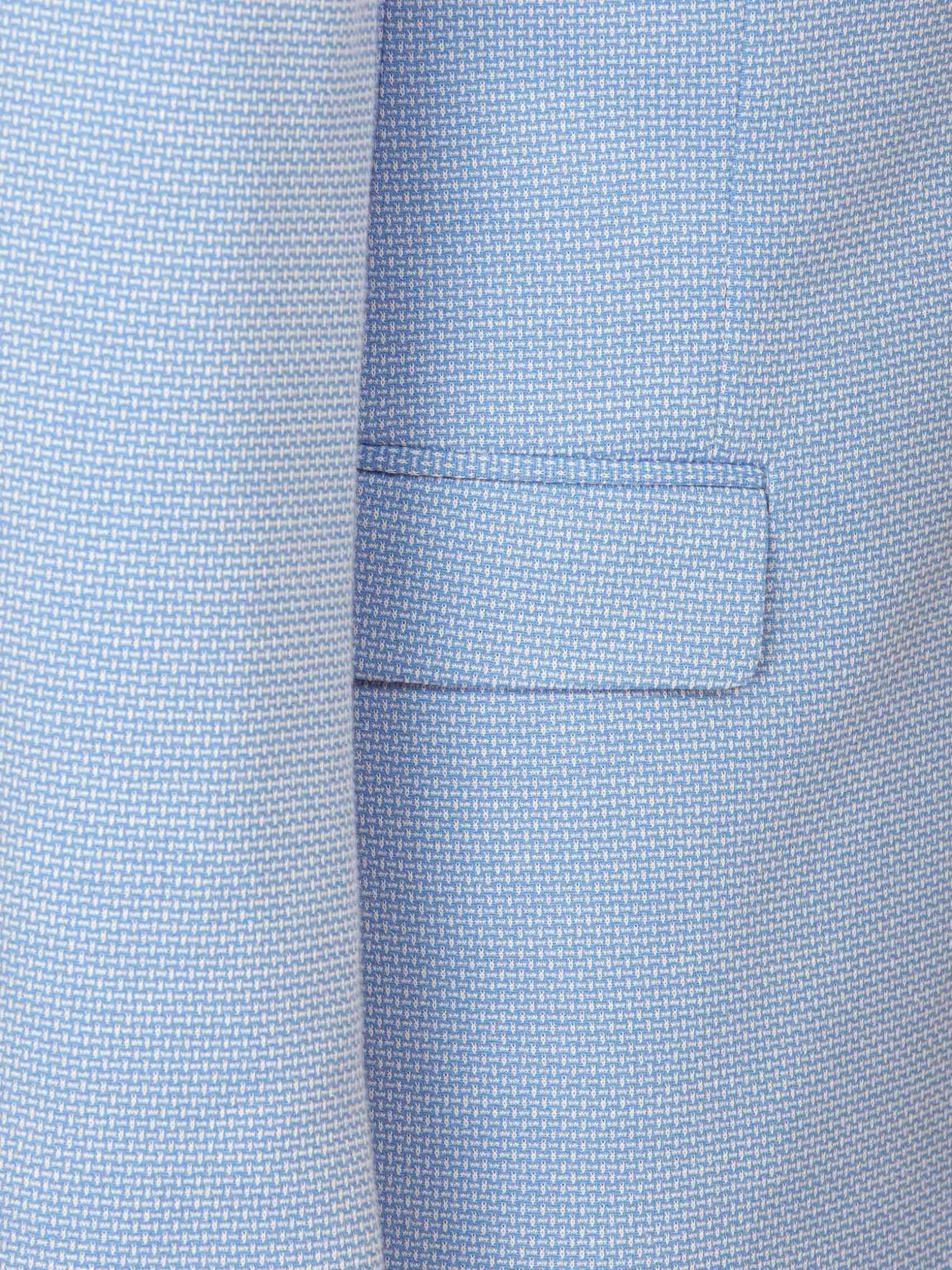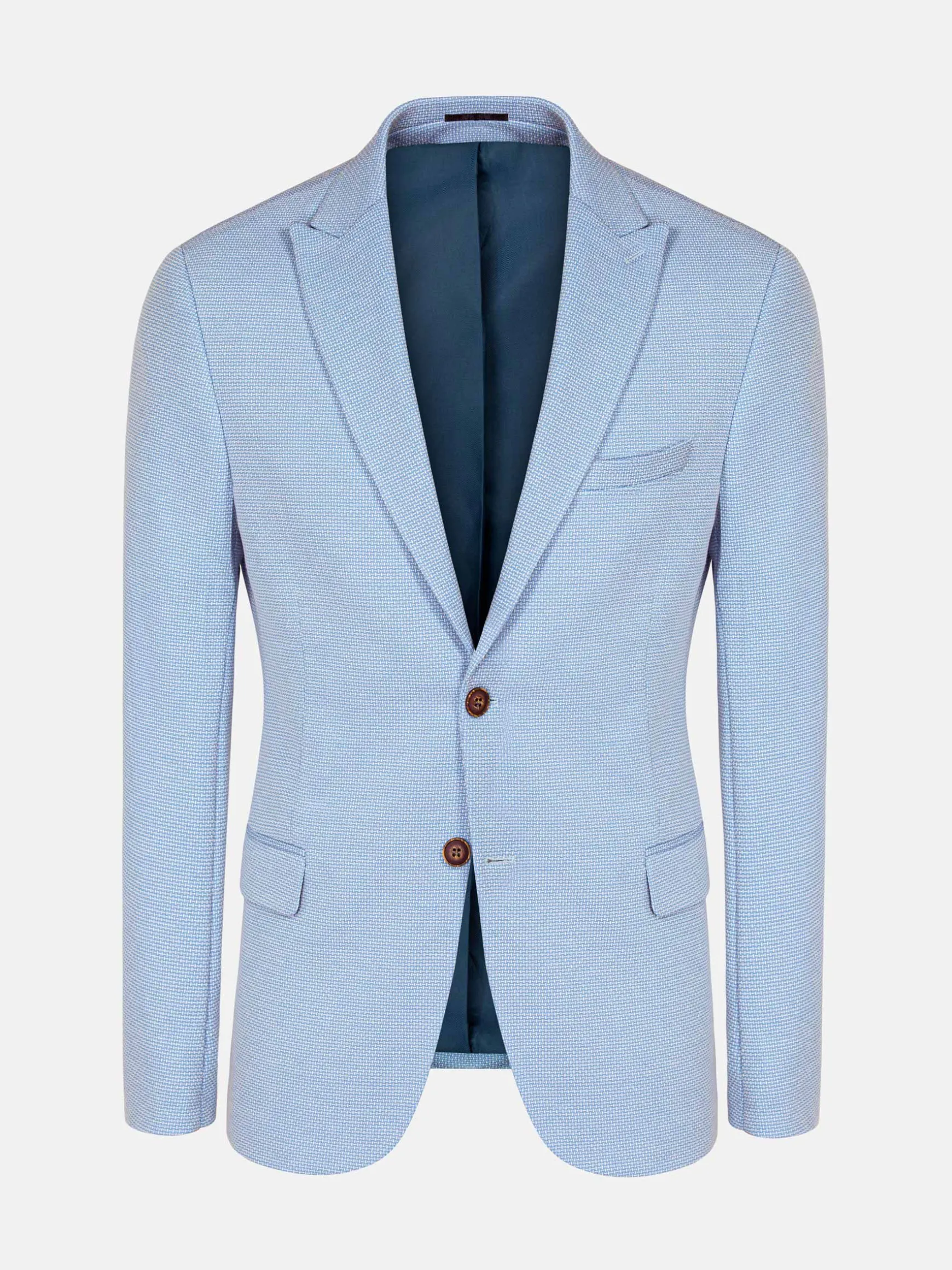 Niklaus Light Blue Colbert, met een kenmerkende textuur van spijkerkopstof. Deze slim-fit blazer biedt een gestroomlijnde look met een single-breasted ontwerp en Peak revers. Het heeft praktische details zoals binnen- en klepzakken, samen met een paspelzak op de borst voor extra raffinement. Compleet met vijf hoornen knopen en twee zijopeningen aan de achterkant, combineert deze blazer elegantie met functionaliteit voor een opvallend ensemble. Perfect voor elke gelegenheid.