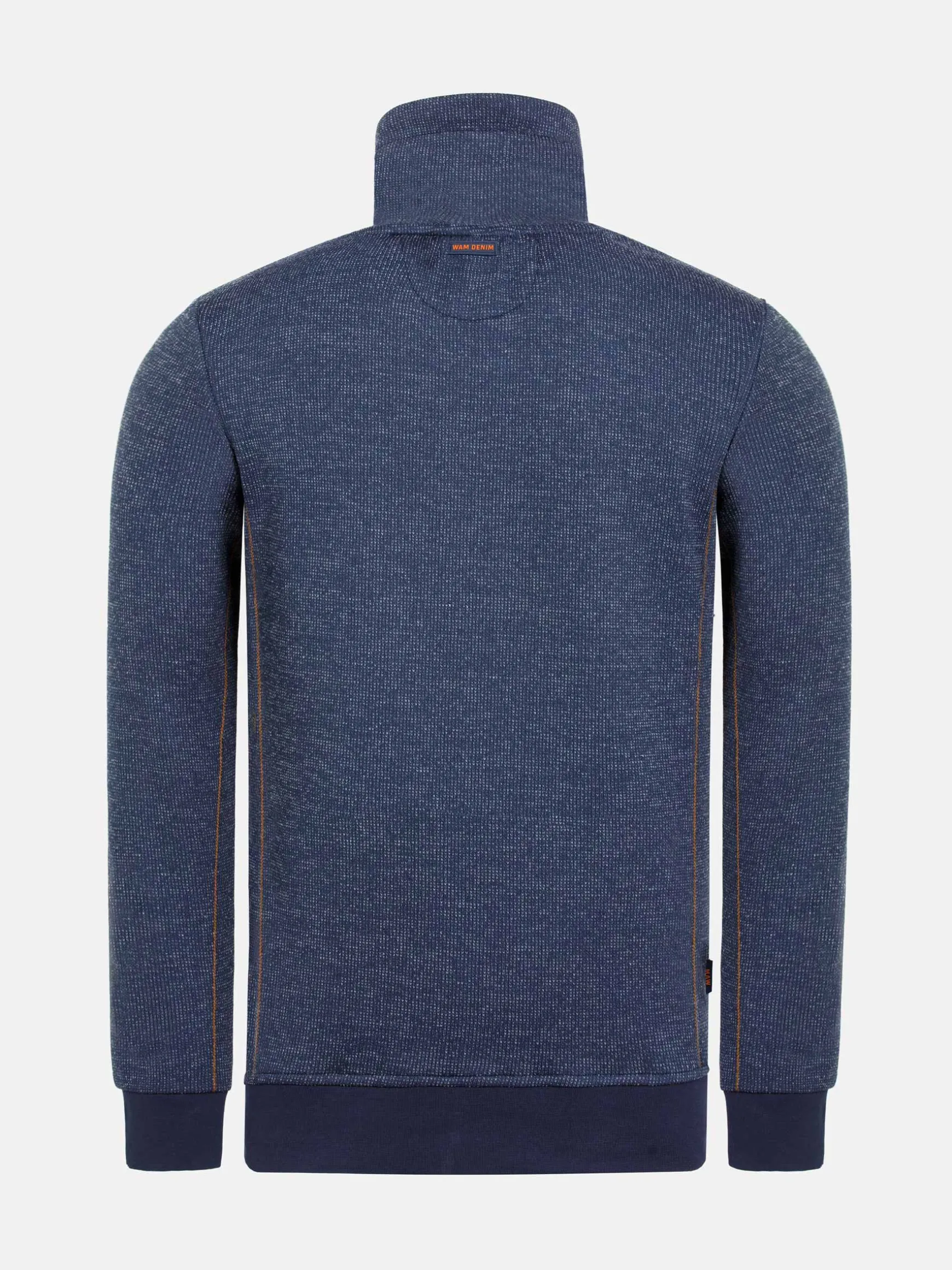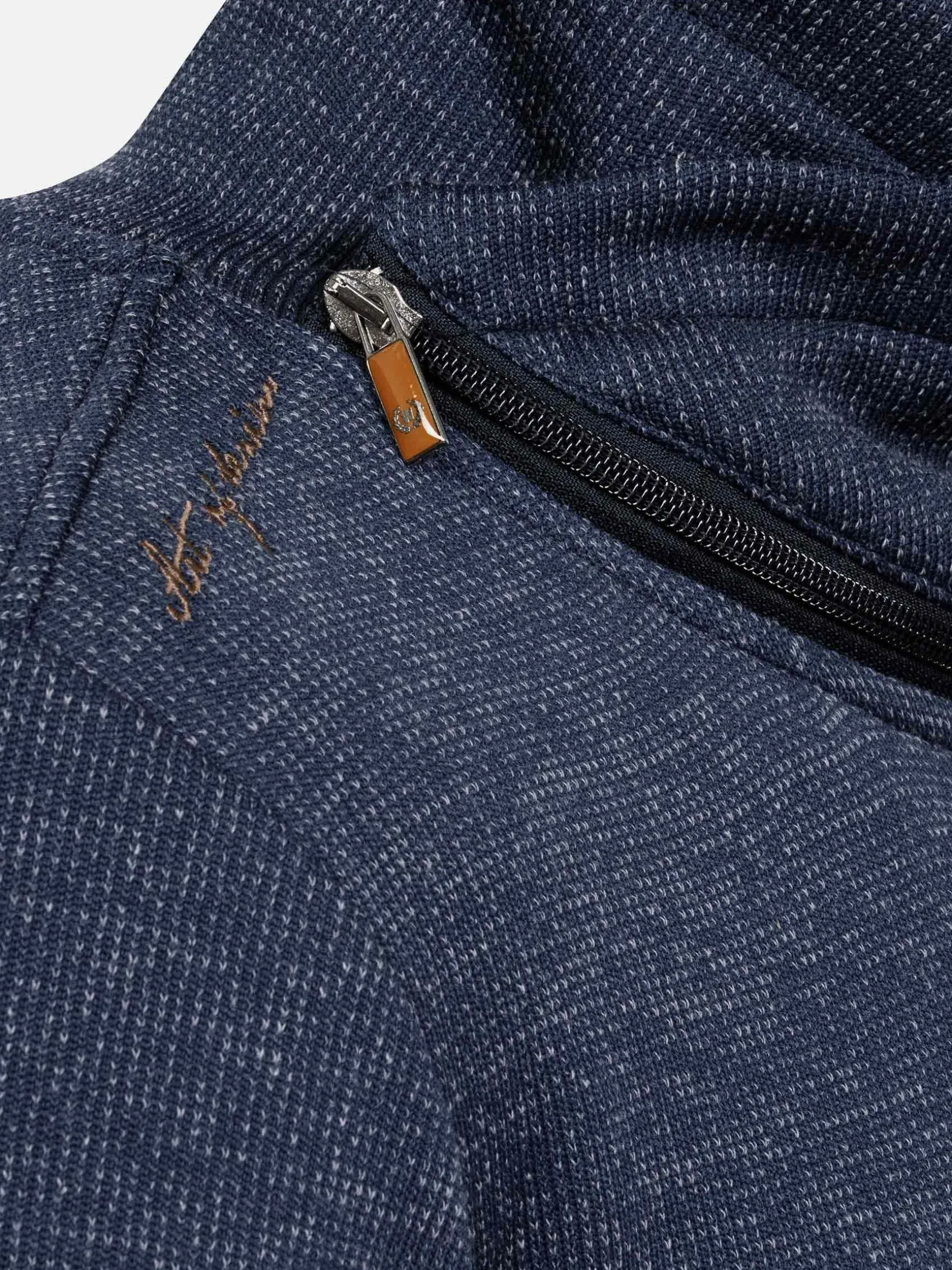 De Cain High Neck Navy Sweater heeft een gestroomlijnde geometrische textuur, een hoge hals met gedeeltelijke rits voor aanpasbaar comfort en contrasterende bruine schouders voor een sportieve touch. Hij is gemaakt van stretchstof met geribde zoom en manchetten en biedt warmte, ademend vermogen en een verfijnde look.