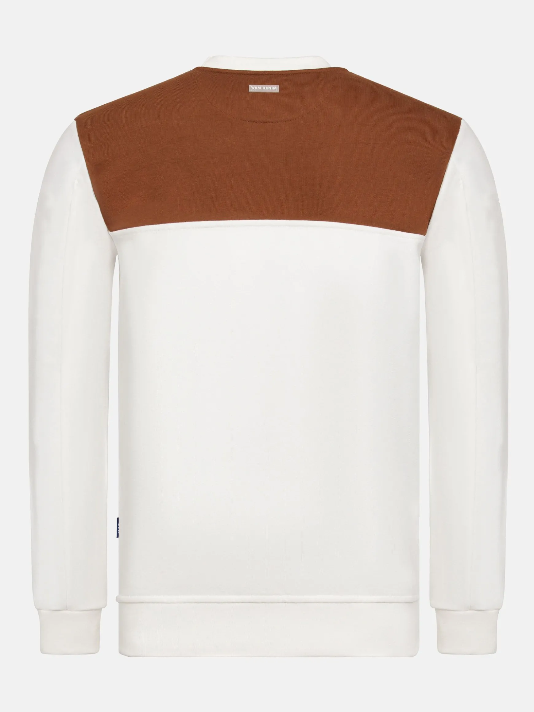 Emory Slim Fit Off White Sweater combineert stijl en functie met zijn slim fit, stretchstof en dubbele kleurencombinatie. Kenmerken zijn een klassieke kraag met ronde hals, een armzak voor extra gemak en geribde manchetten en zoom voor een verfijnde afwerking.