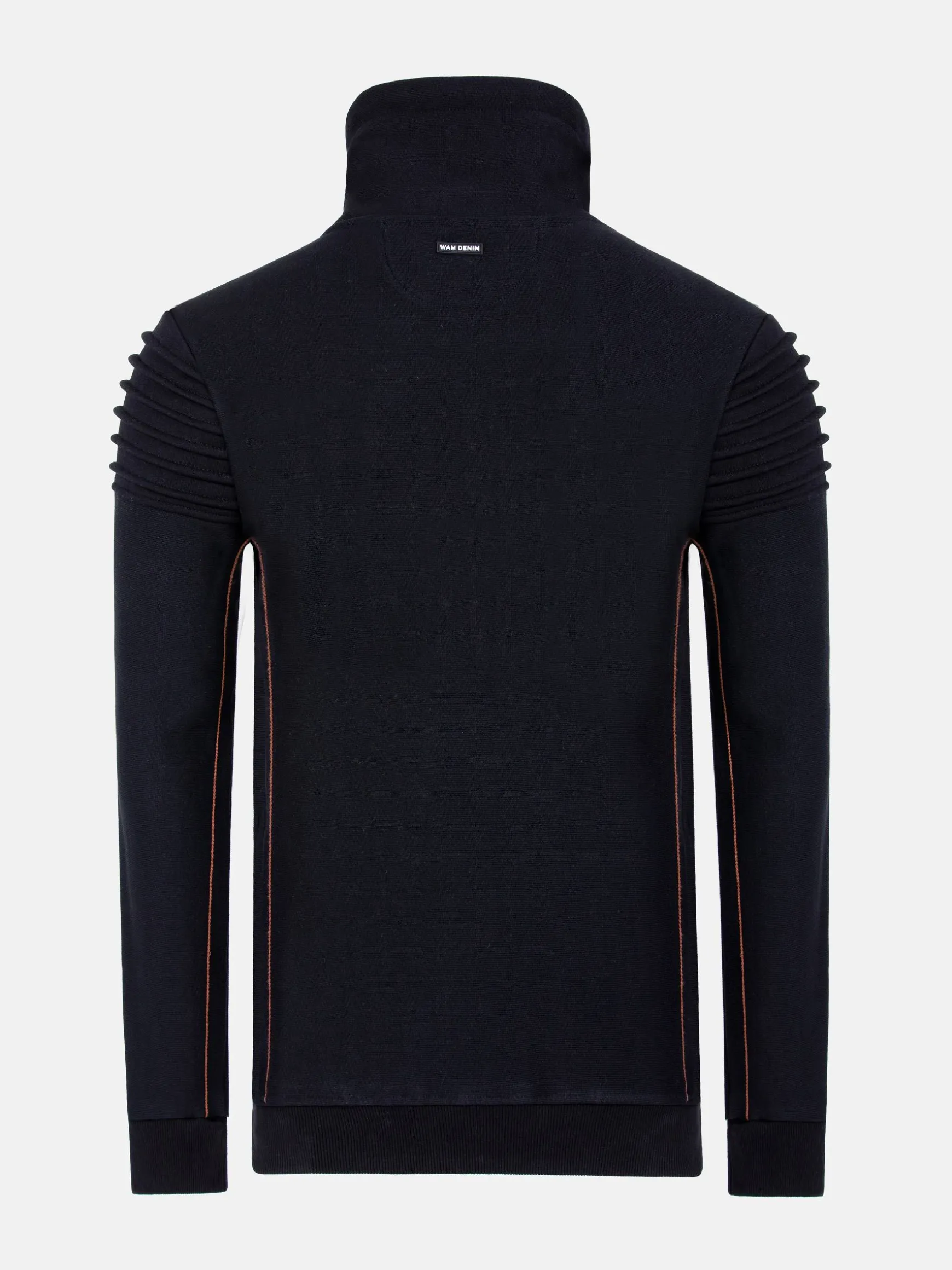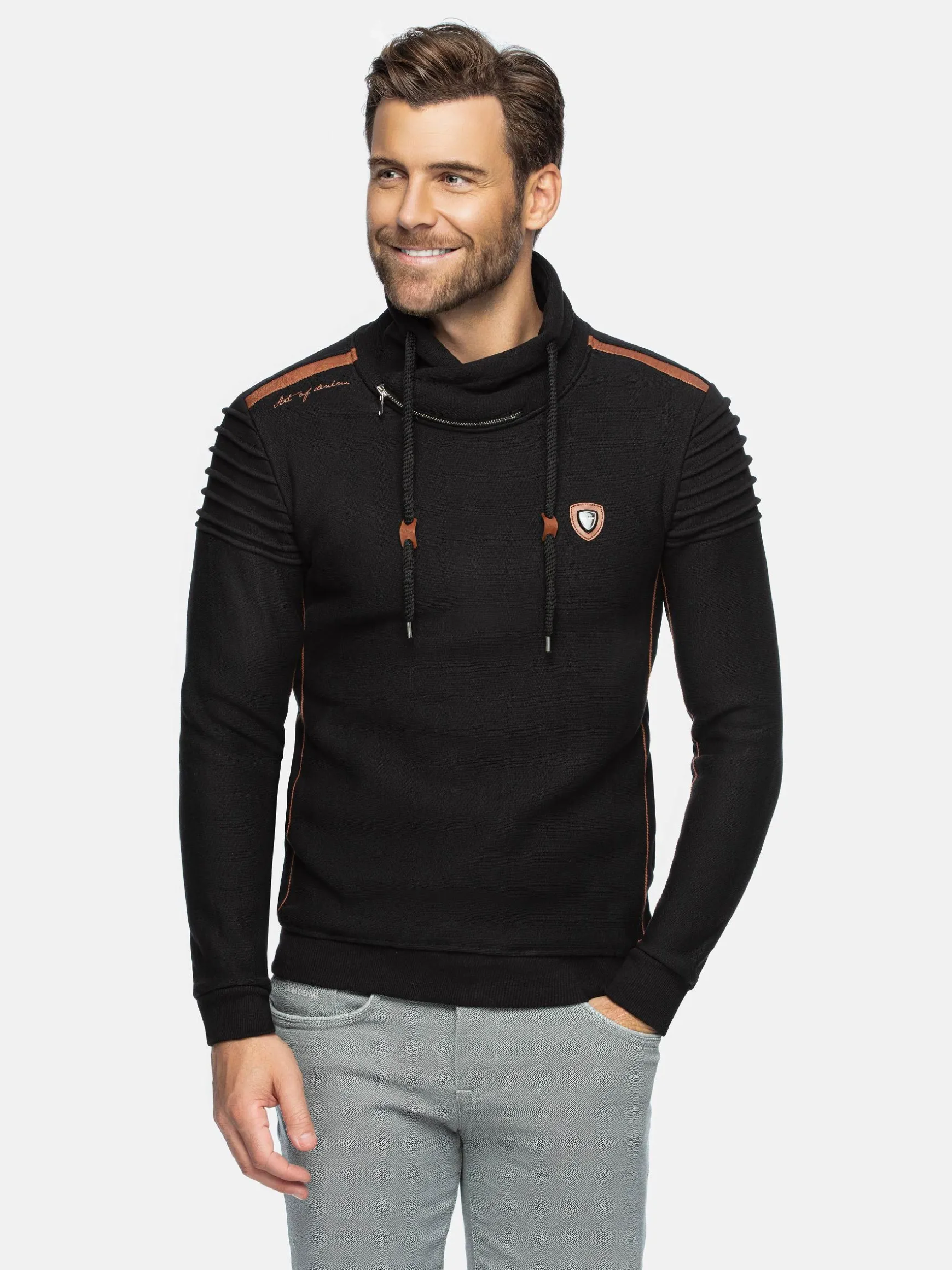 Zwarte sweater met bruine elementen, een opstaande kraag, trekkoord en een decoratieve ritssluiting in de hals. Op de linkerborst heeft deze sweater een merkembleem. De elastische zoom en manchetten sluiten perfect. Een modieuze, warme sweater voor de koude dagen.