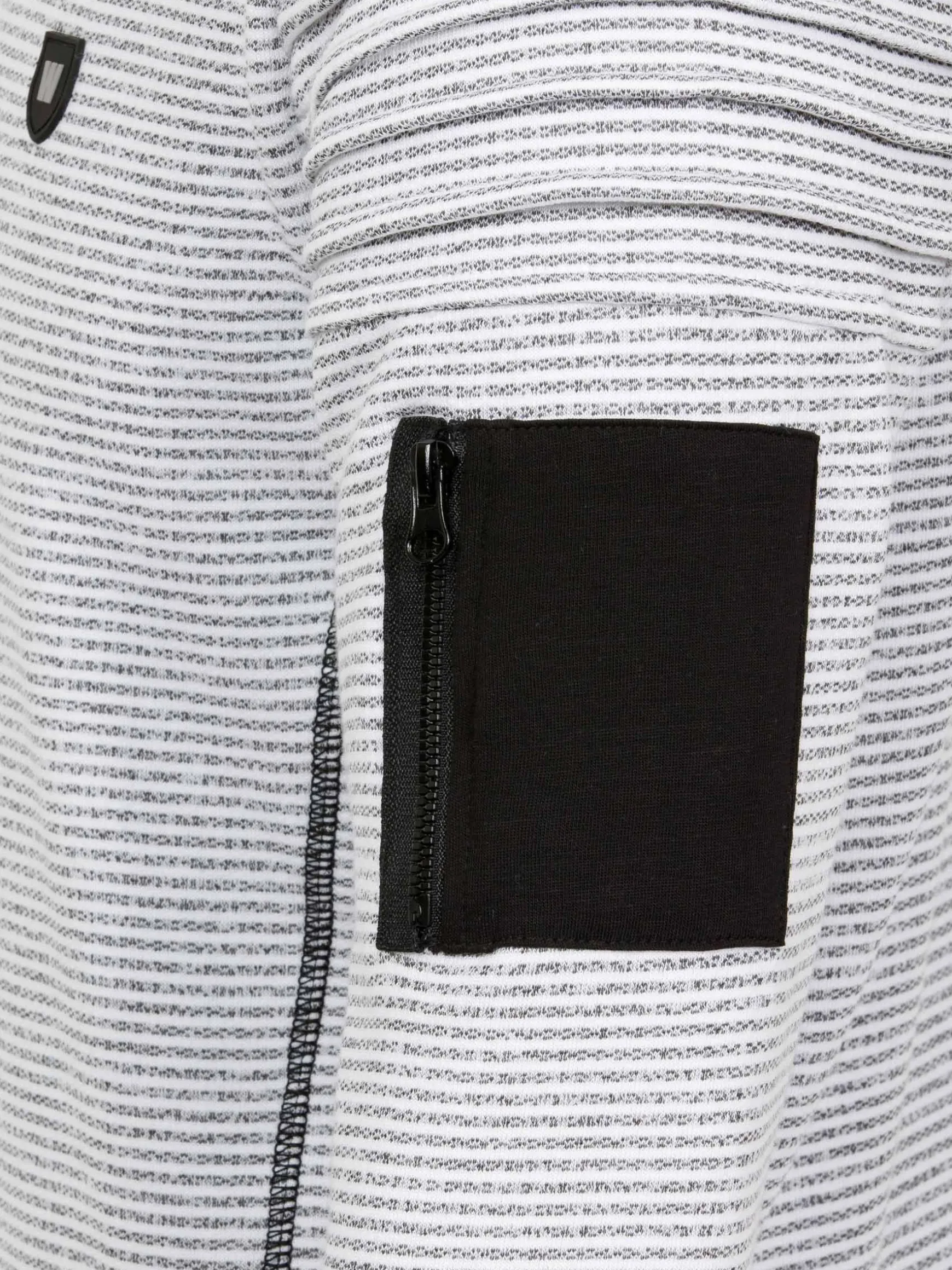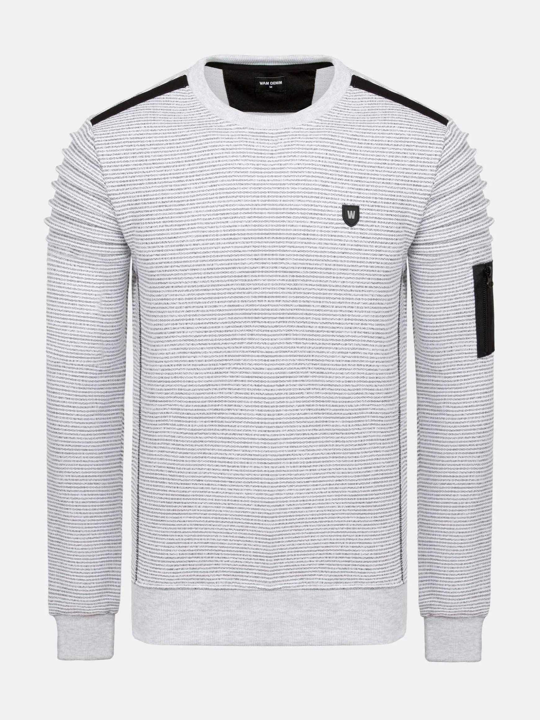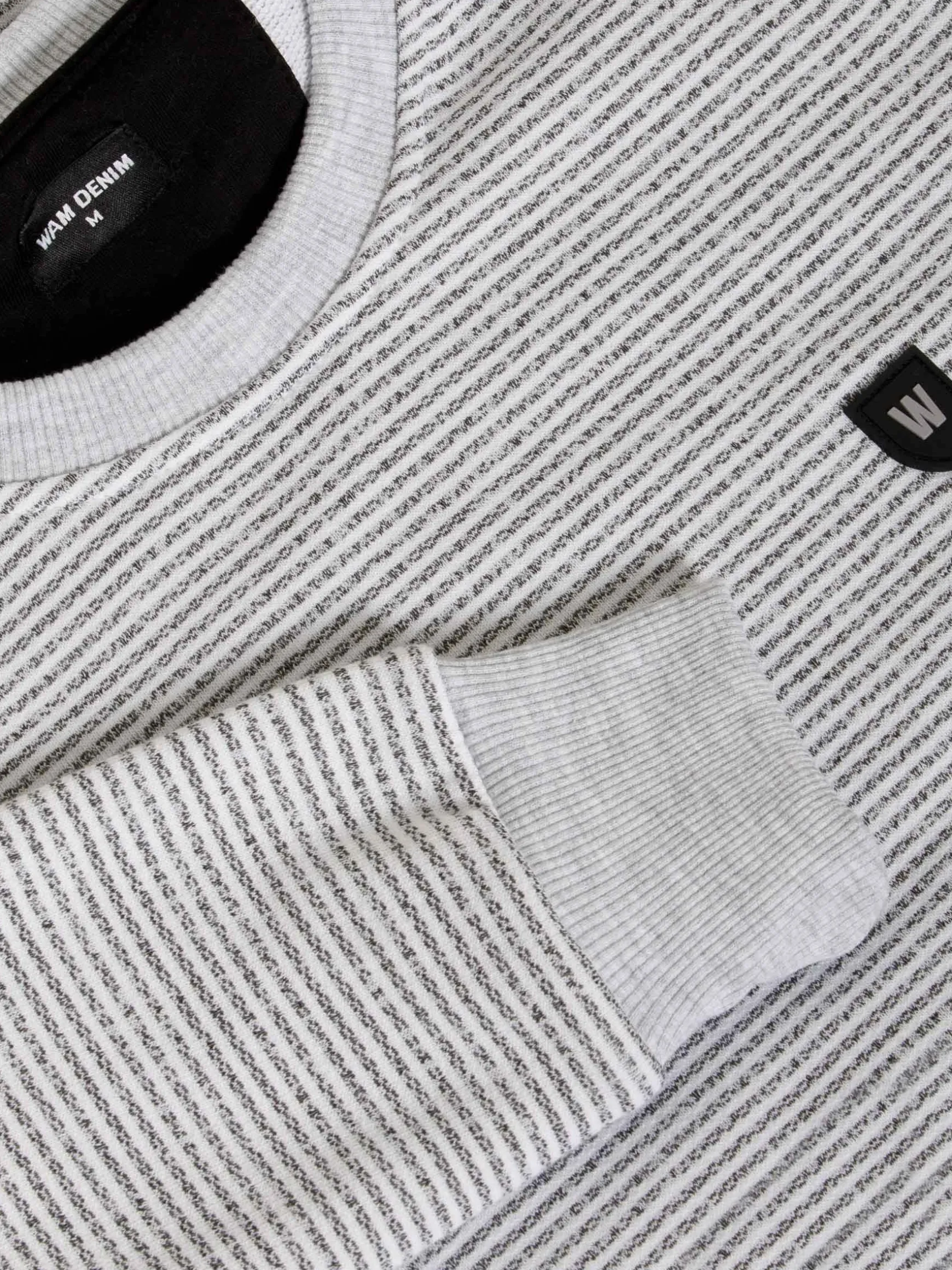 De Karter Crew Neck Grey Sweater heeft een unieke structuurstof, subtiele zwarte accenten op de schouders, fijne horizontale strepen en een klein geborduurd logo. De slanke pasvorm en het stretchmateriaal bieden comfort met stijl. Perfect voor casual tot semi-formeel gebruik.