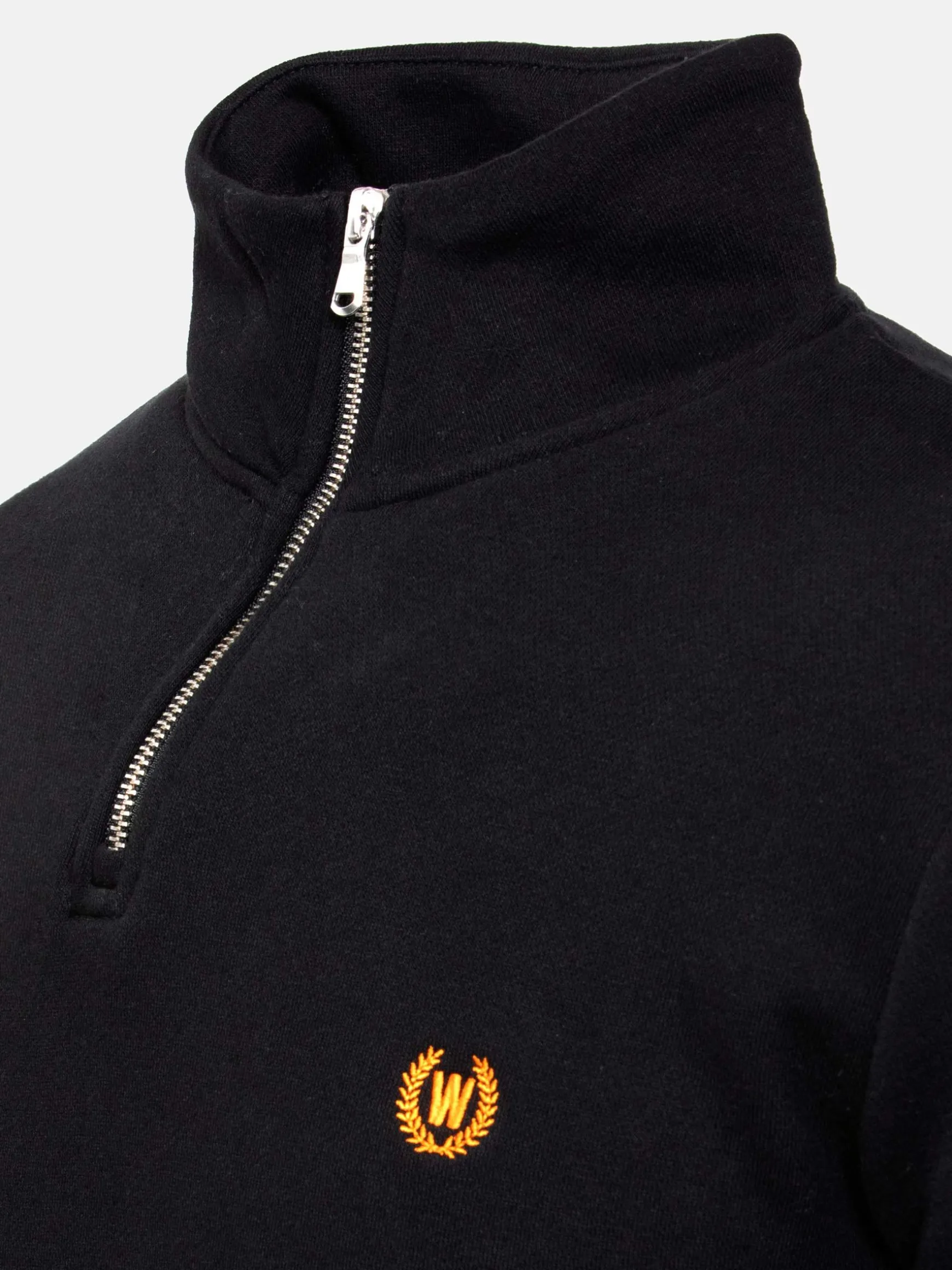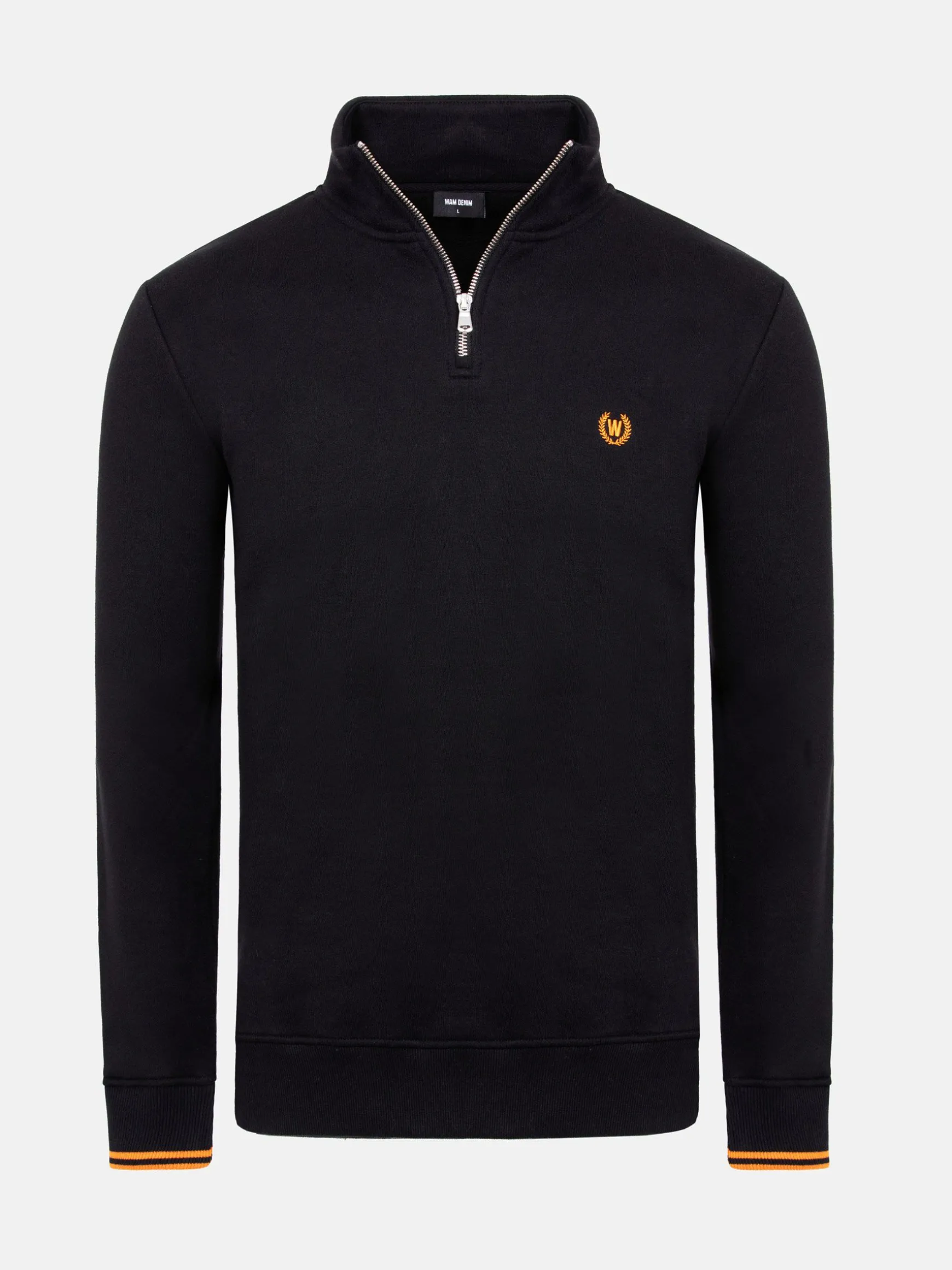 De Santos Black High Neck Sweater is een strak, modern ontwerp met een slanke pasvorm en een hoge hals. Het heeft een functionele halve rits, rekbare stof, een subtiel borstlogo en een contrasterende oranje streep op de geribde boorden en zoom. De klassieke zwarte kleur is veelzijdig en geschikt voor zowel casual als semi-formele gelegenheden.