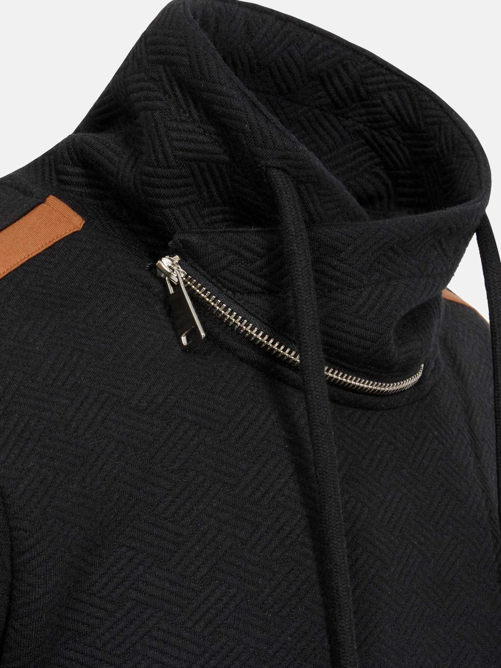 De Solstice Slim Fit Black Sweater heeft een gestroomlijnde geometrische textuur, een hoge hals met gedeeltelijke rits voor aanpasbaar comfort en contrasterende bruine schouders voor een sportieve touch. Hij is gemaakt van stretchstof met geribde zoom en manchetten en biedt warmte, ademend vermogen en een verfijnde look.