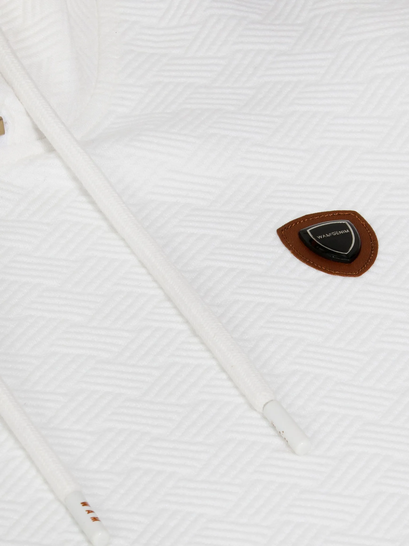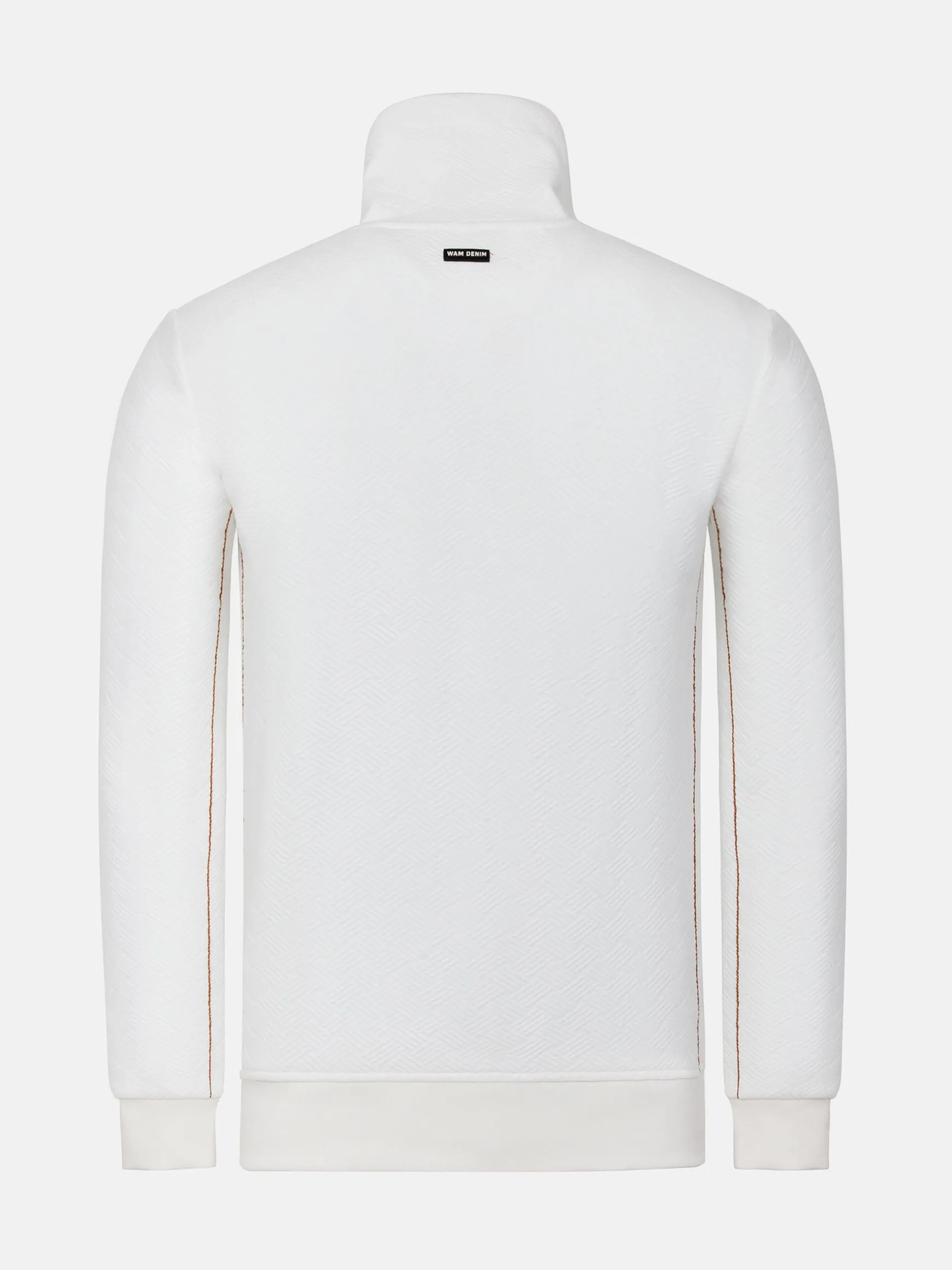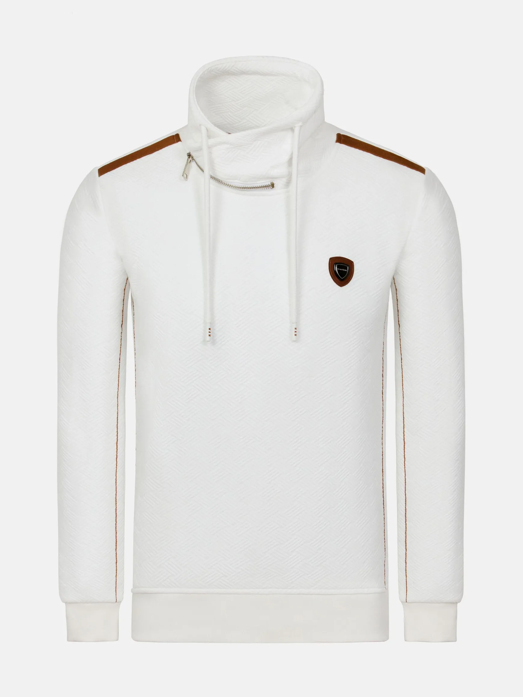 De Solstice Slim Fit Off White Sweater heeft een gestroomlijnde geometrische textuur, een hoge hals met gedeeltelijke rits voor aanpasbaar comfort en contrasterende bruine schouders voor een sportieve touch. Hij is gemaakt van stretchstof met geribde zoom en manchetten en biedt warmte, ademend vermogen en een verfijnde look.
