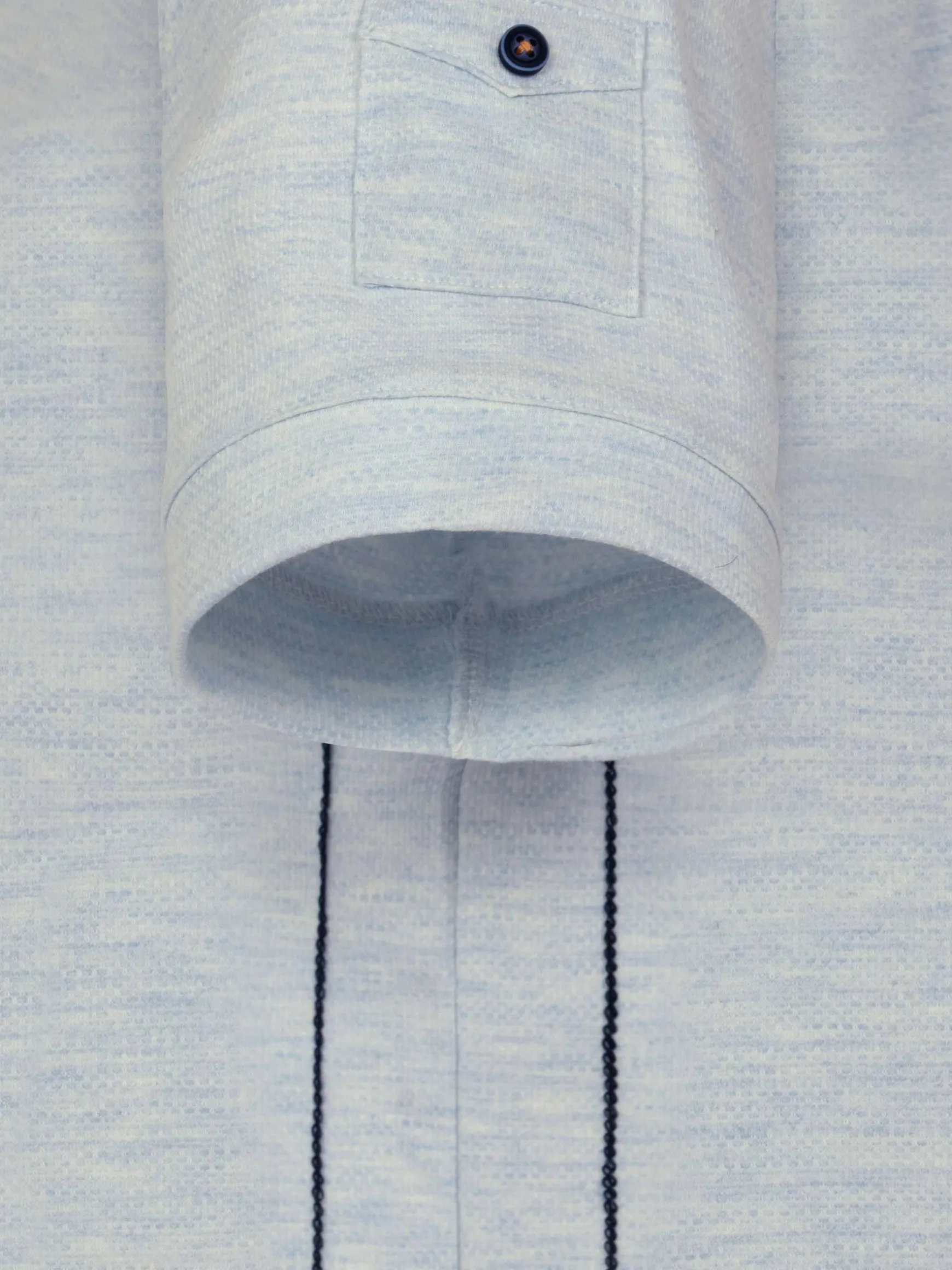 Het Oberursel Slim Fit Stretched Blue T-shirt is een stijlvol en comfortabel stuk, met een strakke ronde hals met knoopsluiting en een getailleerde pasvorm. De slanke pasvorm en het unieke miniginghampatroon voegen individualiteit toe, terwijl het zwarte contrast op de schouders de visuele aantrekkingskracht vergroot.