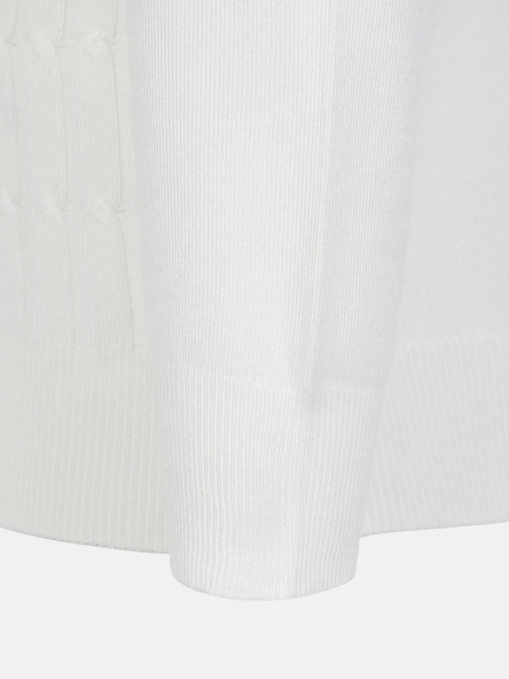The Ruth Crew Neck Pullover combines simplicity with refined style. Designed in a timeless crew neck silhouette, this Off White pullover features an elegant textured knit pattern on the front, adding depth and dimension to its minimalistic design. The soft, high-quality fabric offers comfort and warmth, making it perfect for cooler days. Ribbed detailing on the cuffs and hem ensures a snug fit, while the versatile Off White shade makes it an essential layering piece for any occasion.