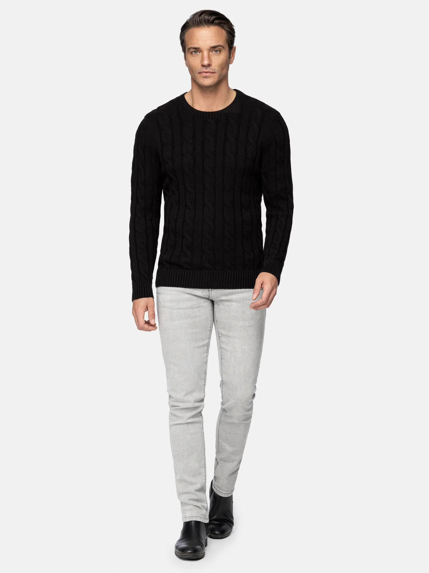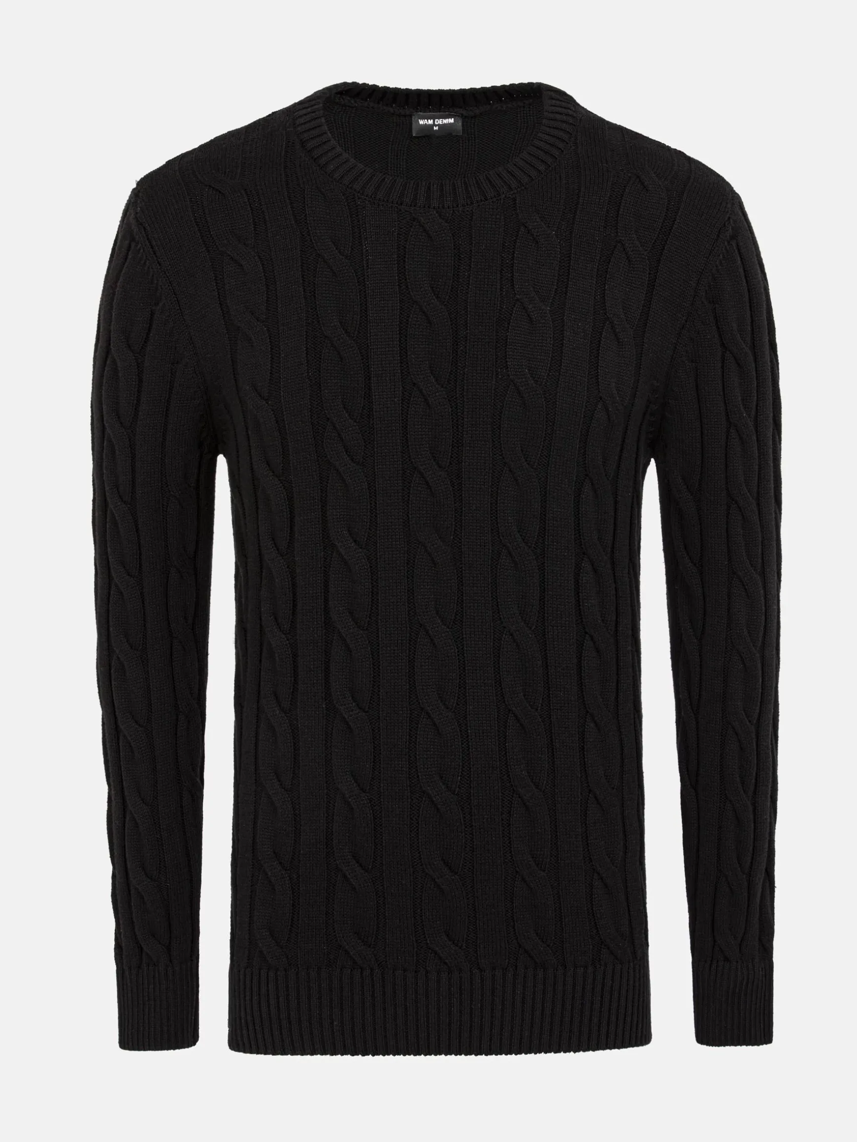 Een zachte trui in een glanzend zwarte kleur met een ronde hals en geribde boorden. De textuur van de stof voegt een elegante stijl toe. Perfect te dragen bij een jeans voor een smart casual style.