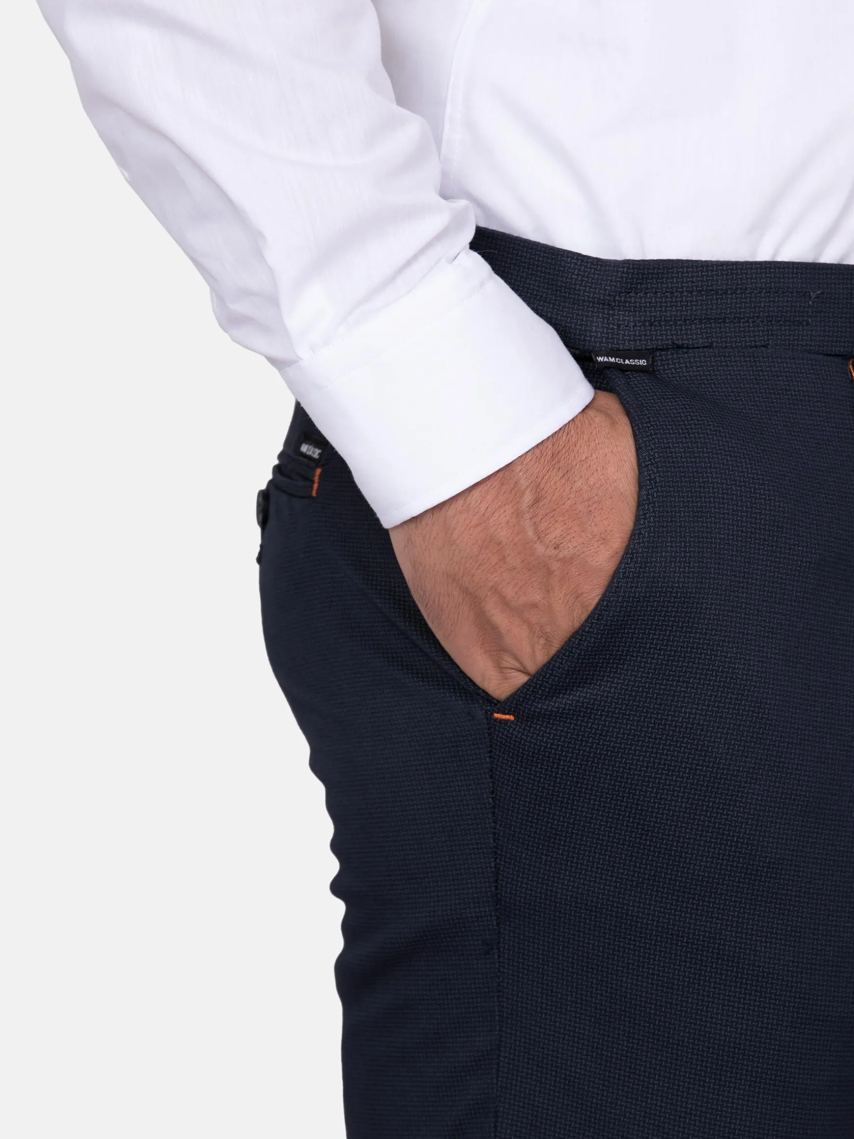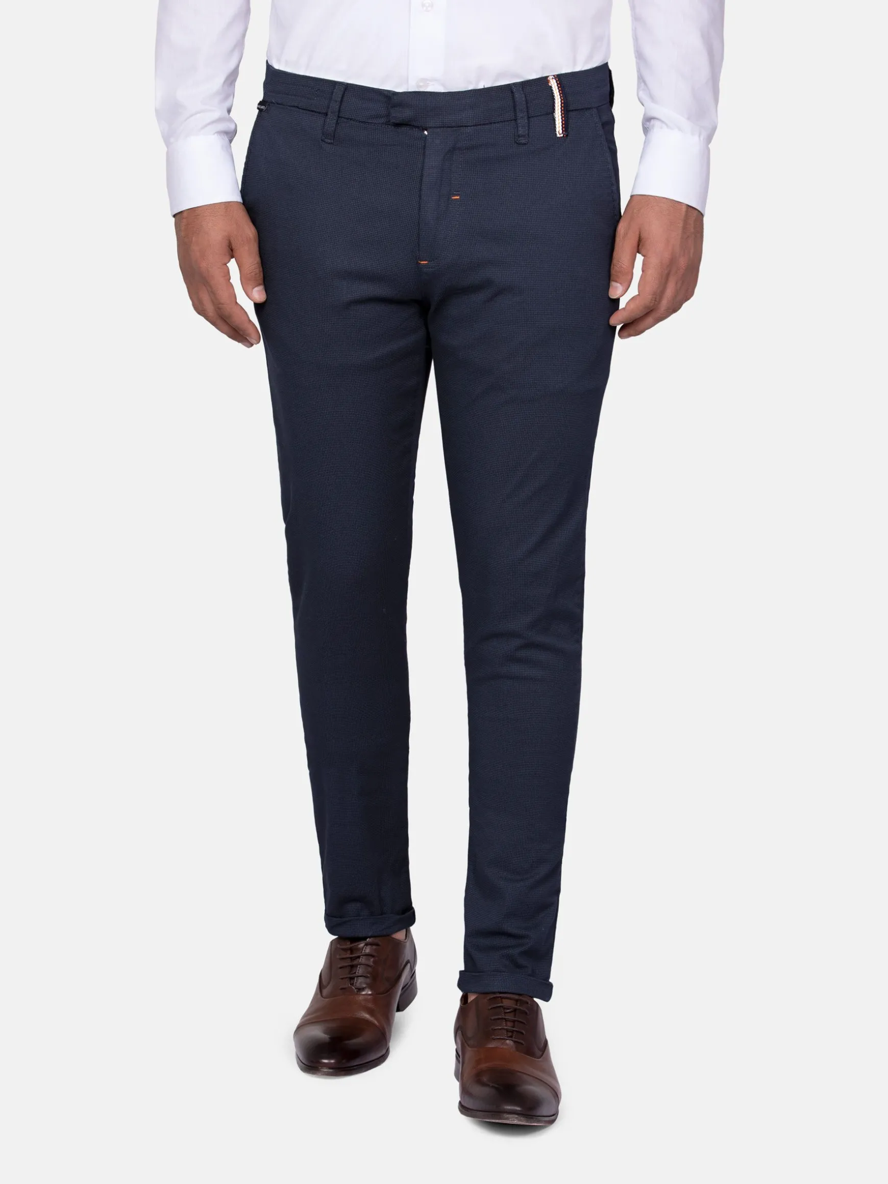 Modieuze en nette chino in een prachtige donkerblauwe kleur. Staat mooi met bijvoorbeeld een wit of lichtblauw overhemd. Deze chino is zeer geschikt voor kantoor of gelegenheden waar je er een beetje netjes uit wilt zien. De broek heeft twee steekzakken en twee achterzakken met knoopsluiting. Op de taille zit een donker embleem.