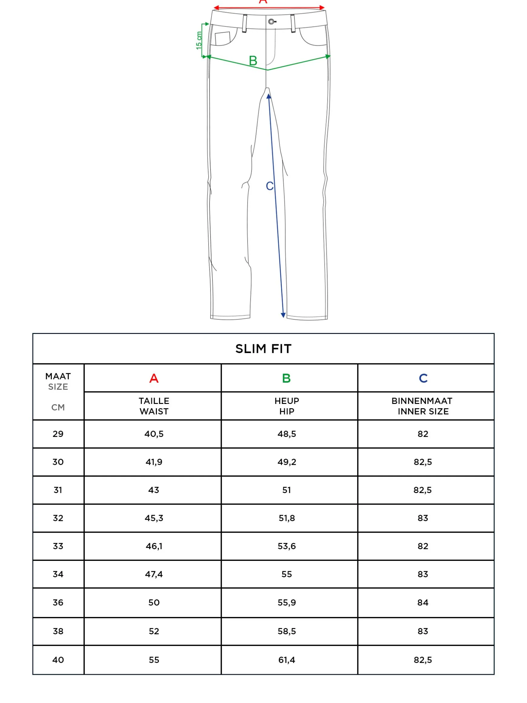 Bestaat uit 97% katoen en 3% elastaan. Om de kwaliteit te behouden raden we aan om deze chino te wassen op 40°C. Niet bleken. Strijken op een temperatuur van 110° C. Niet geschikt voor de droger.