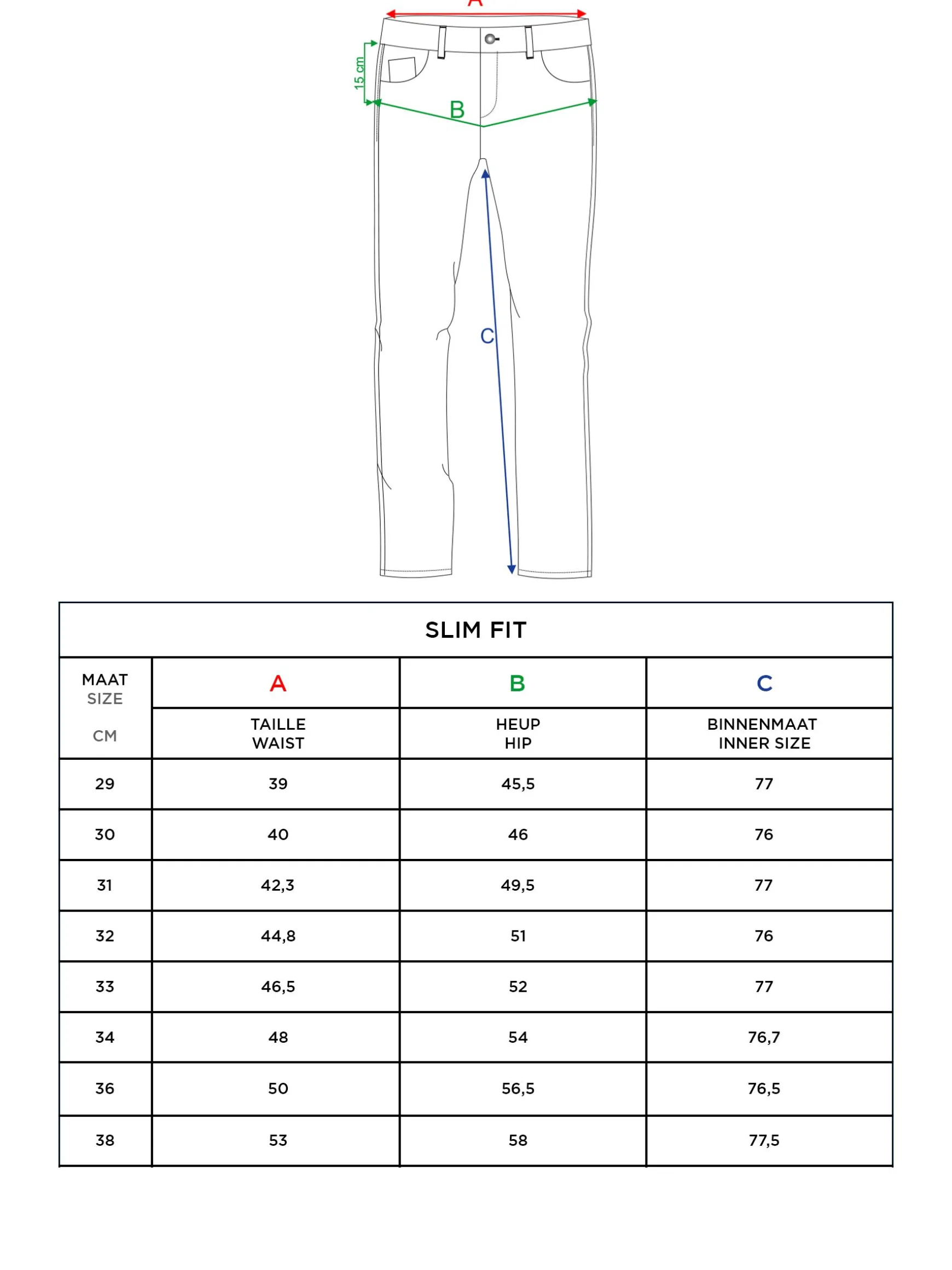 Bestaat uit 64% katoen, 33% polyester en 03% elastaan. Om de kwaliteit te behouden, raden we aan deze Chino te wassen op 30° C gevoeligheid. Niet bleken. Strijken op een temperatuur van 150°C. Niet geschikt voor de droger.