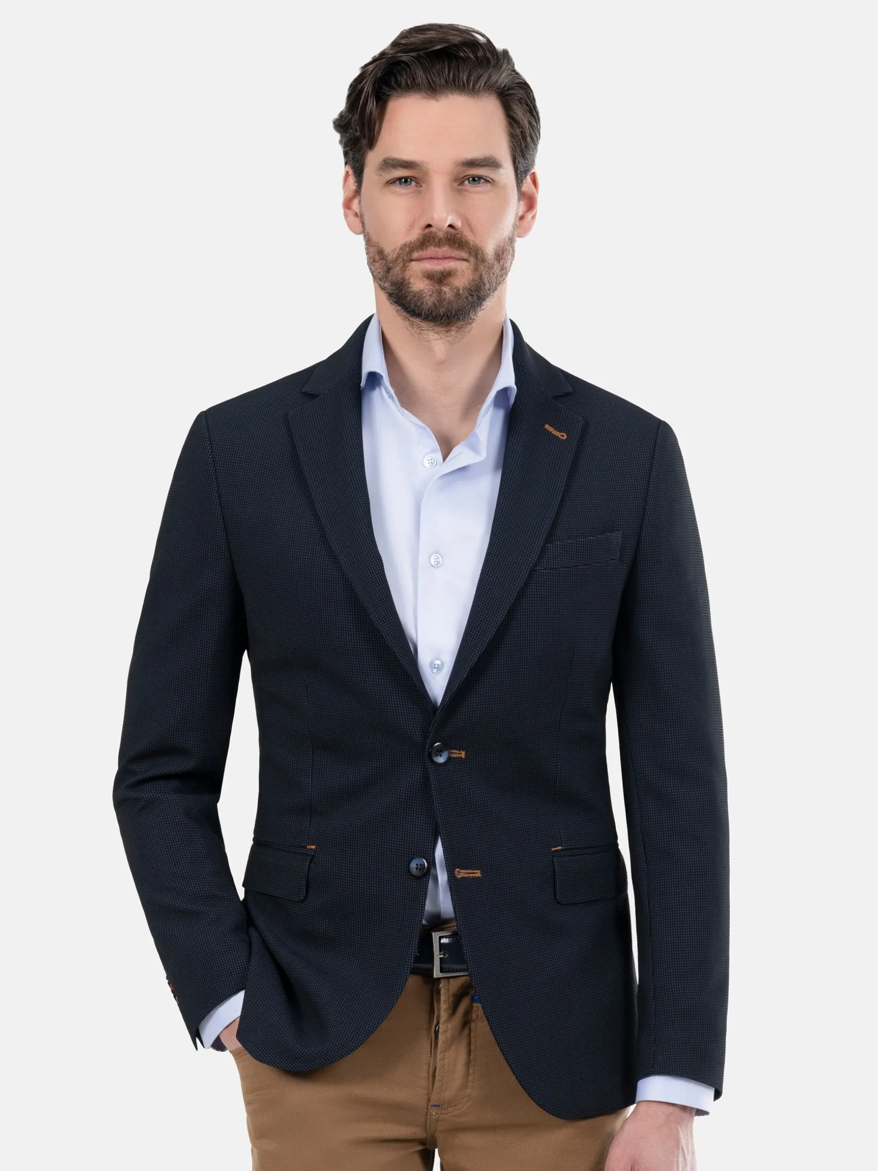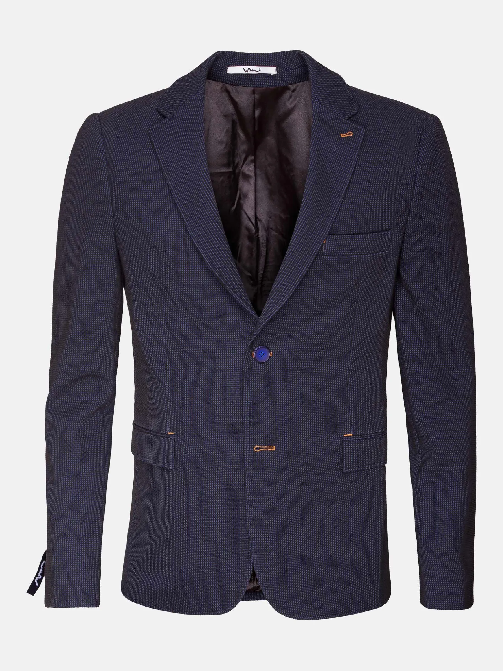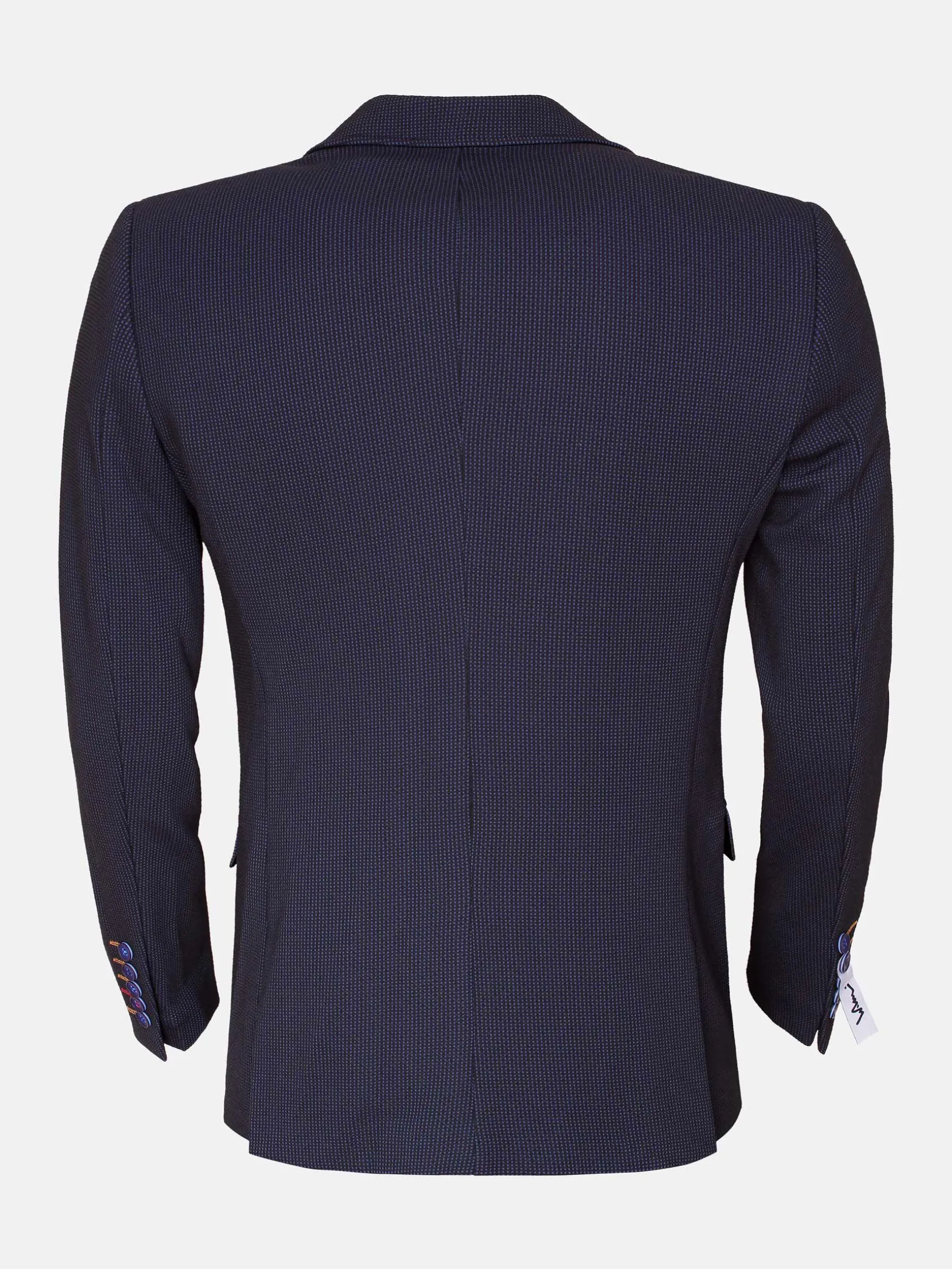 Italy Stretch Poly Light Indigo Cobert is een tijdloos stuk dat klassieke elegantie combineert met moderne verfijning. Het is gemaakt van een eersteklas mix van viscose, polyester en elastaan en biedt duurzaamheid, comfort en krasvastheid. Het heeft een brede revers, een moderne pasvorm en een eenborstig ontwerp met twee knopen. De blazer heeft ook klepzakken op de borst en een miniruit met stippen, waardoor het een veelzijdige keuze is voor verschillende gelegenheden.
