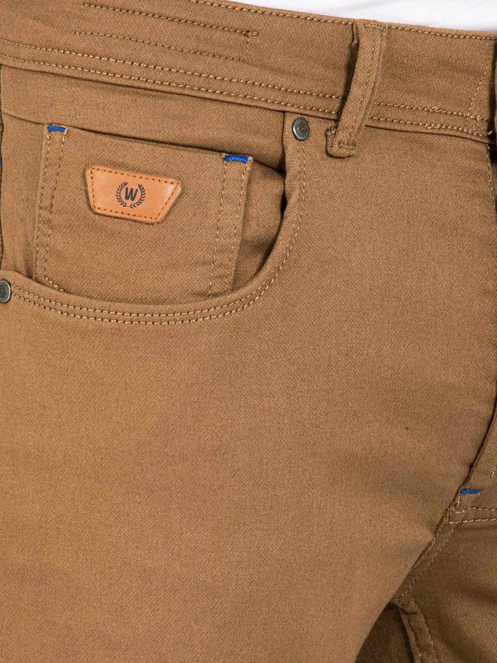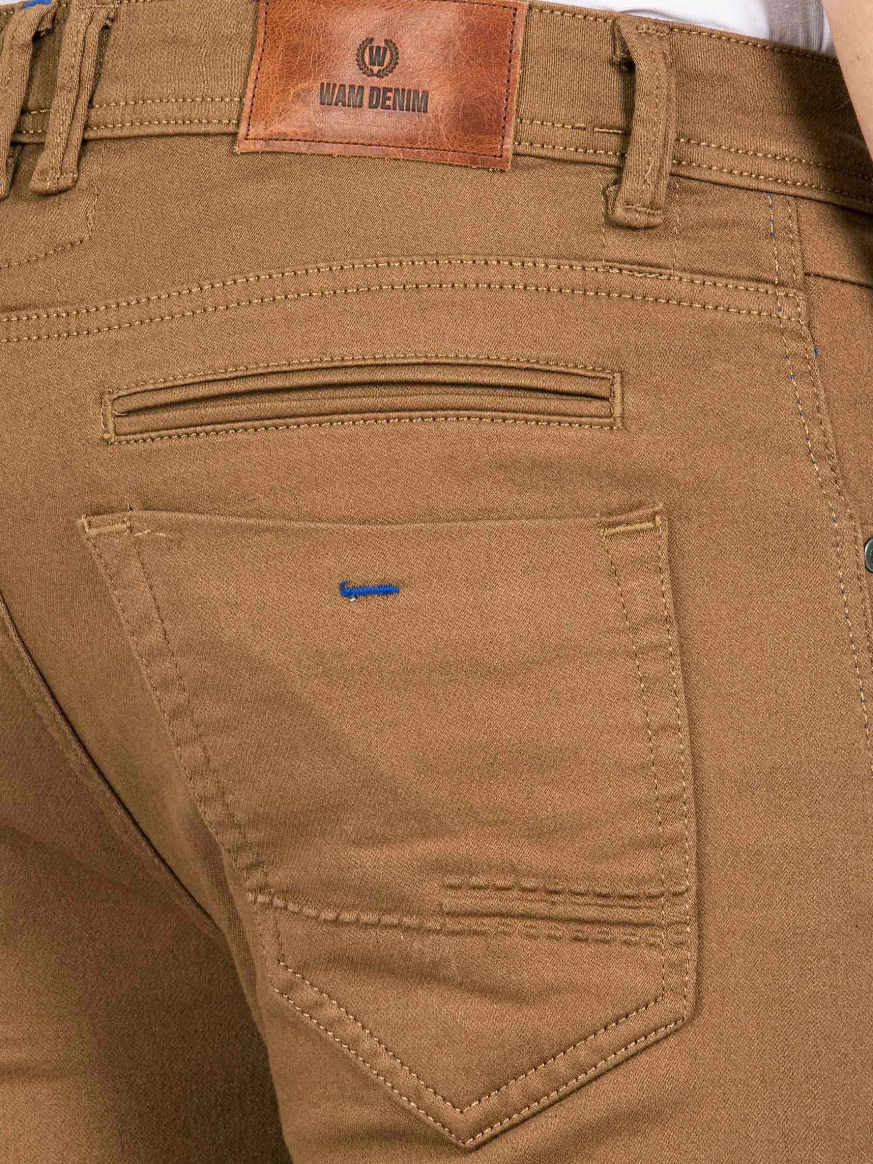 Peru kleurige jeans met knoopsluiting. Deze effen jeans staat goed met een sweater of T-shirt voor een casual look. Voor een meer nette look combineer je deze jeans met een overhemd. Boven de rechter achterzak is een merkembleem bevestigd.