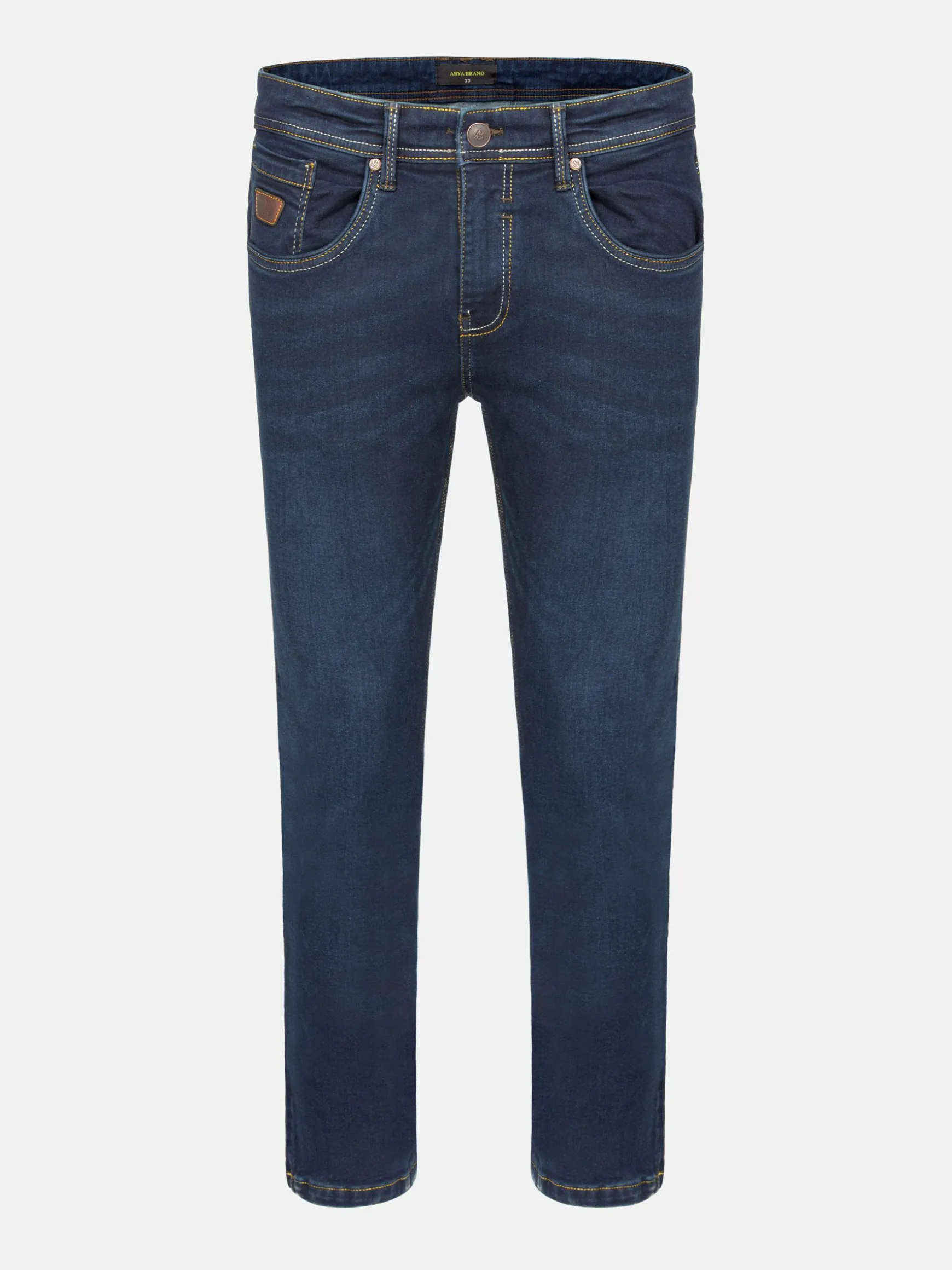 Brando Slim Fit Dark Navy Jeans. Deze jeans is gemaakt van elastische stof en heeft een ritssluiting, vier zakken, waaronder een klein horlogezakje, en klinknagels om de spanningspunten te verstevigen. De diepe marineblauwe kleur voegt een modern tintje toe, waardoor hij perfect is voor elke gelegenheid.