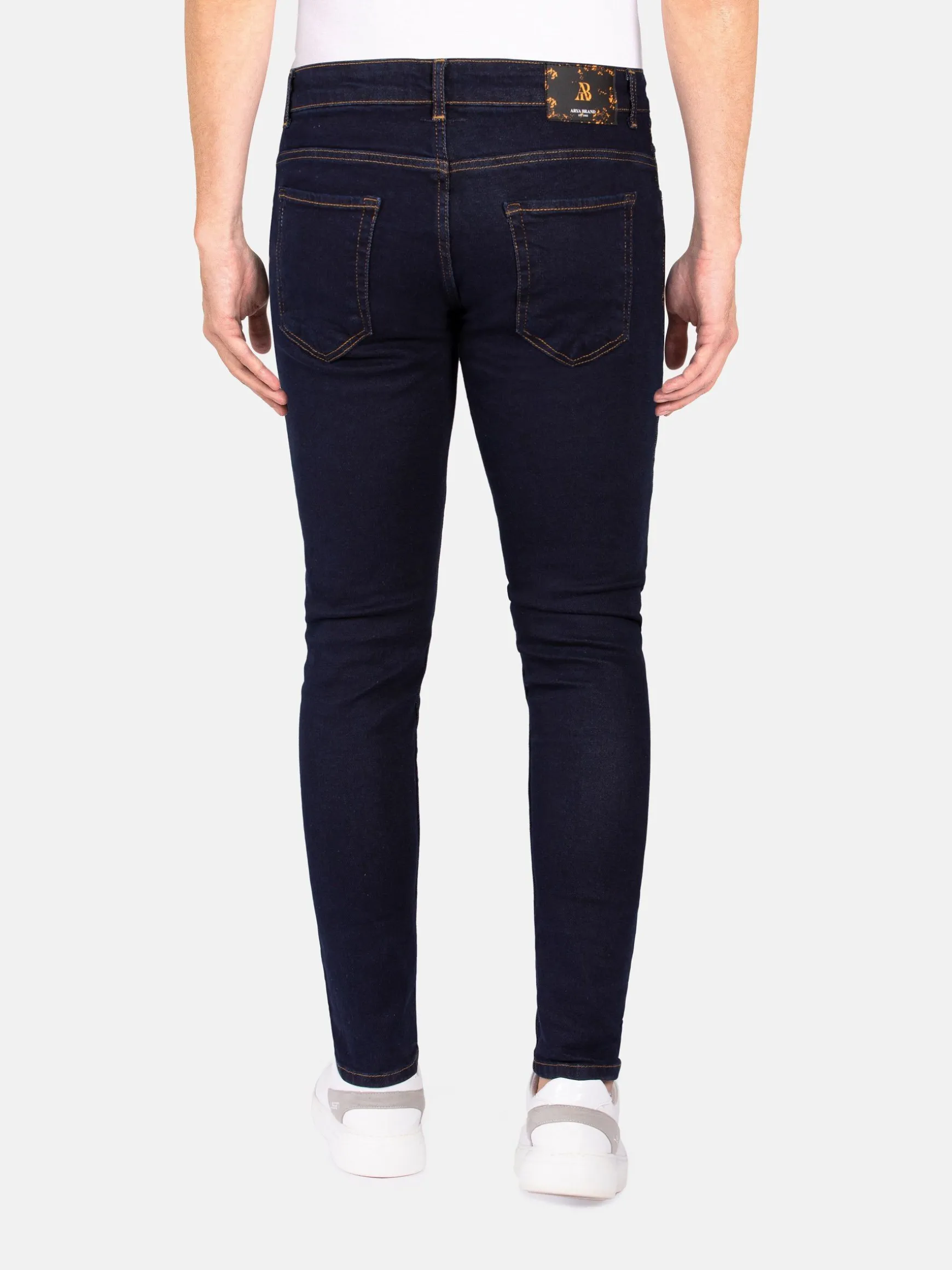 Donkerblauwe jeans met met een perfecte pasvorm door de stretch die in de stof is verwerkt. De broek heeft twee achterzakken en twee voorzakken.