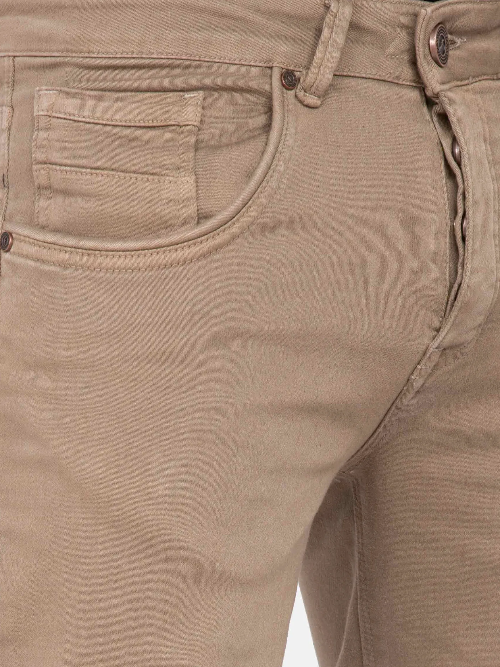 Beige kleurige jeans met een getailleerde pasvorm. Dit model heeft een knoopsluiting en een bruin embleem op de achterkant, boven de rechterzak.