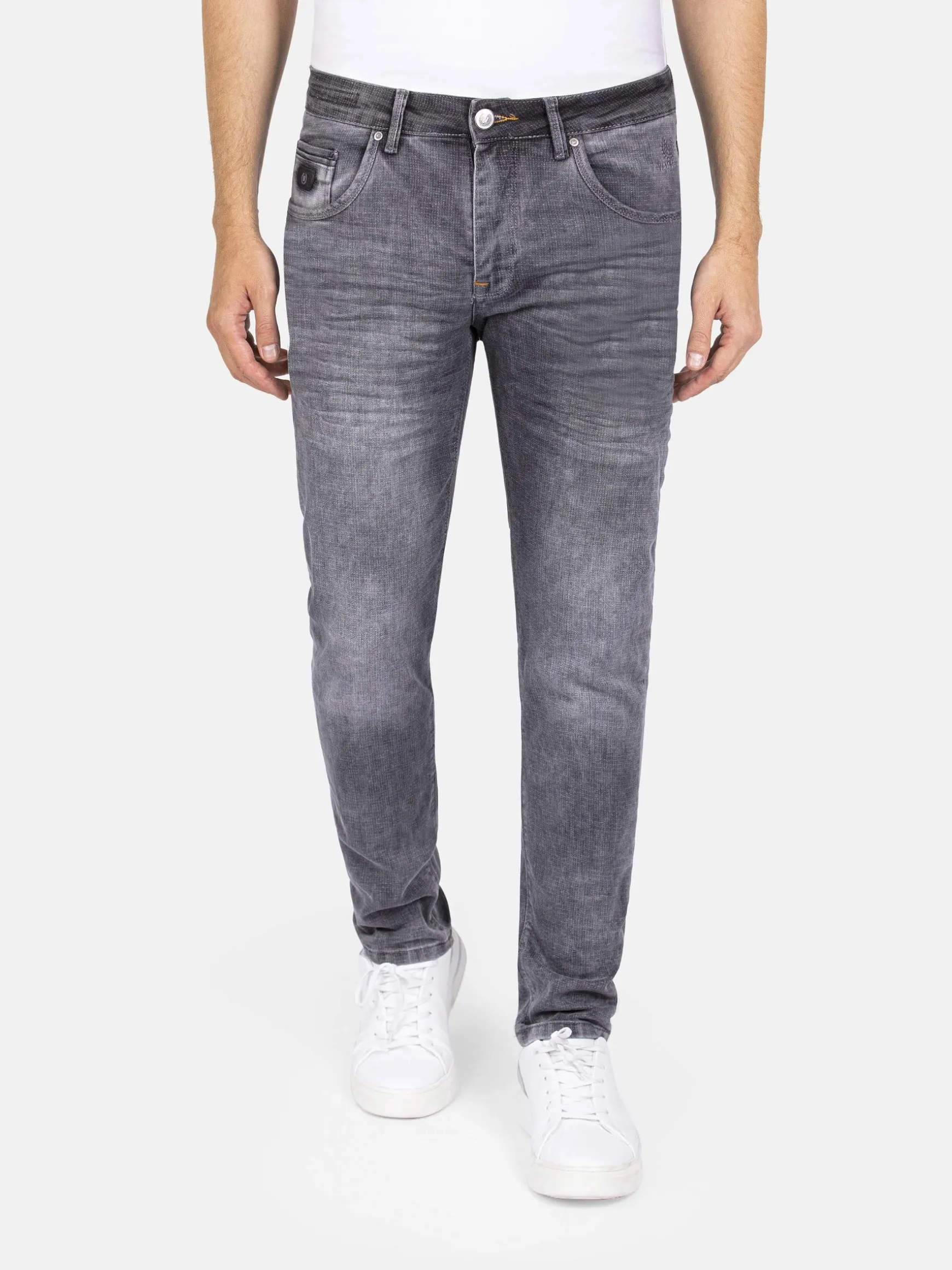 Zwarte jeans met een stonewash. Boven de rechterachterzak is een merkembleem opgestikt. Deze jeans past heel goed bij een casual look met een overhemd of trui en een paar sneakers.
