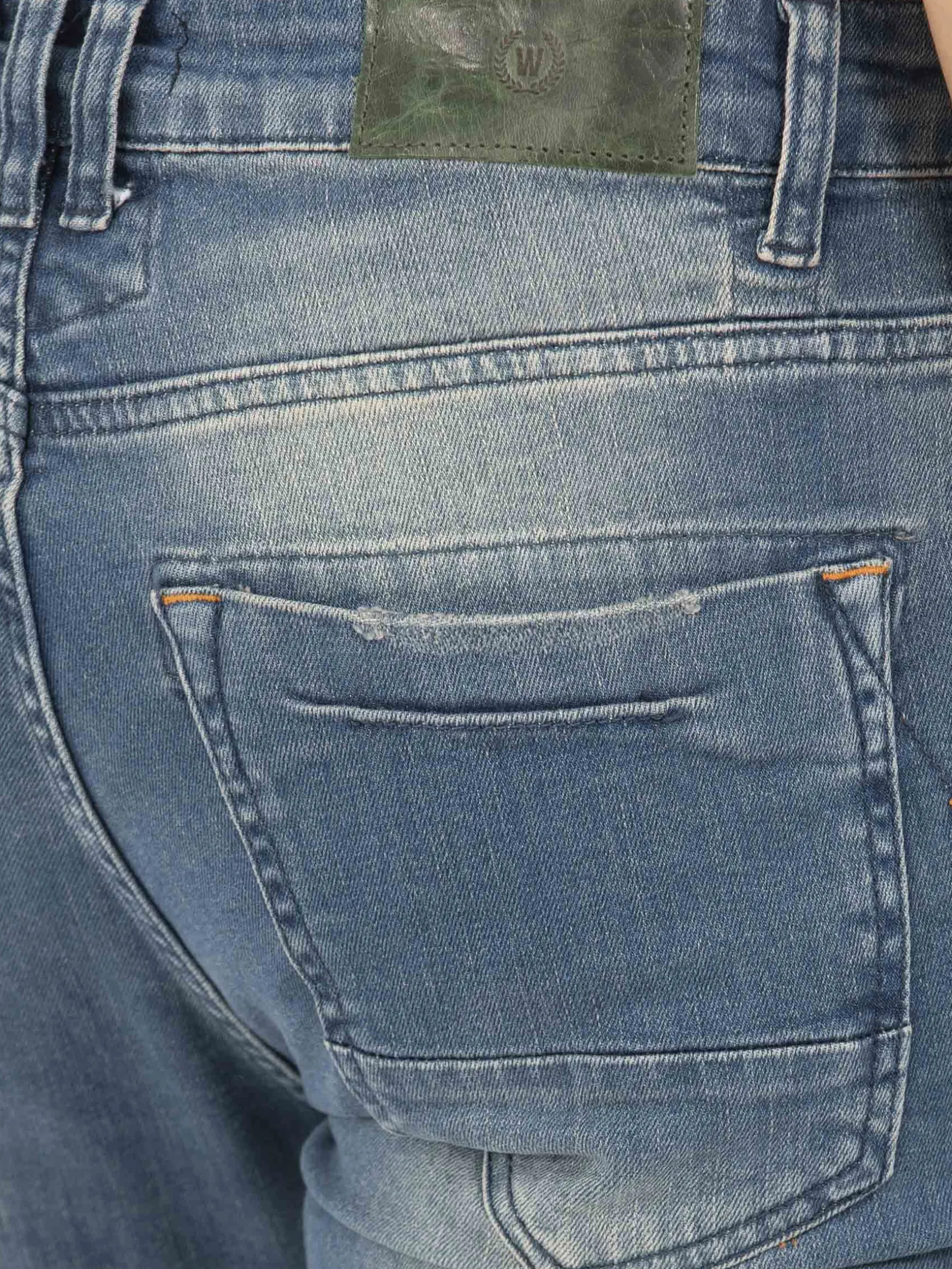 Blauwe jeans met een getailleerde taille en smalle broekspijpen. De jeans heeft een knoopsluiting en is afgewerkt met een groen merklabel boven de rechter achterzak.