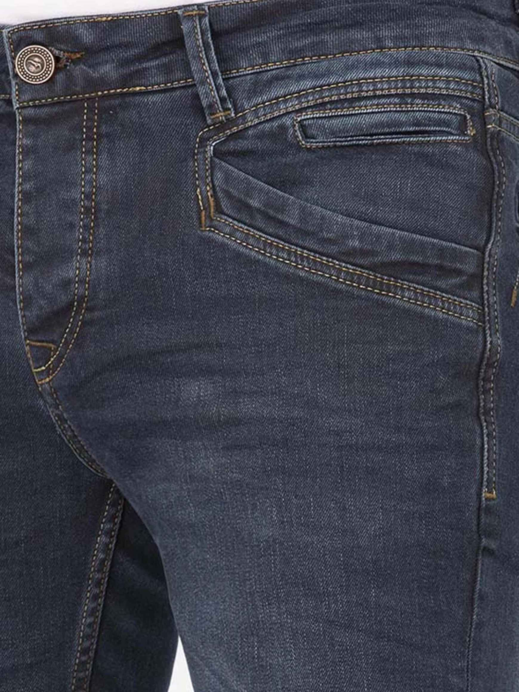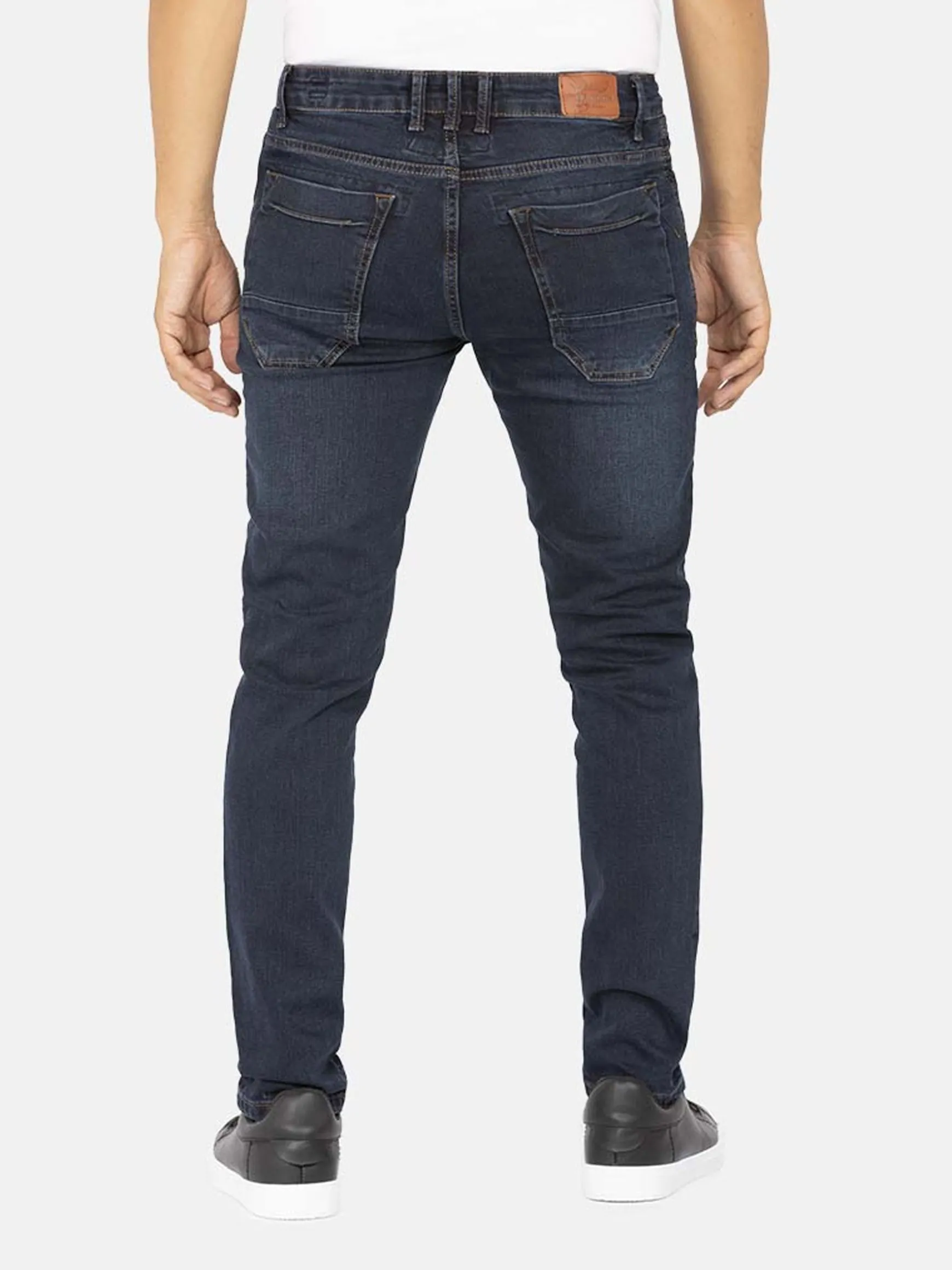 Mooie donkerblauwe jeans met knoopsluiting. Boven de rechter achterzak is een merkembleem bevestigd. Voor een casual look past deze jeans heel goed met een sweater of T-shirt en met een overhemd voor een wat nettere uitstraling.