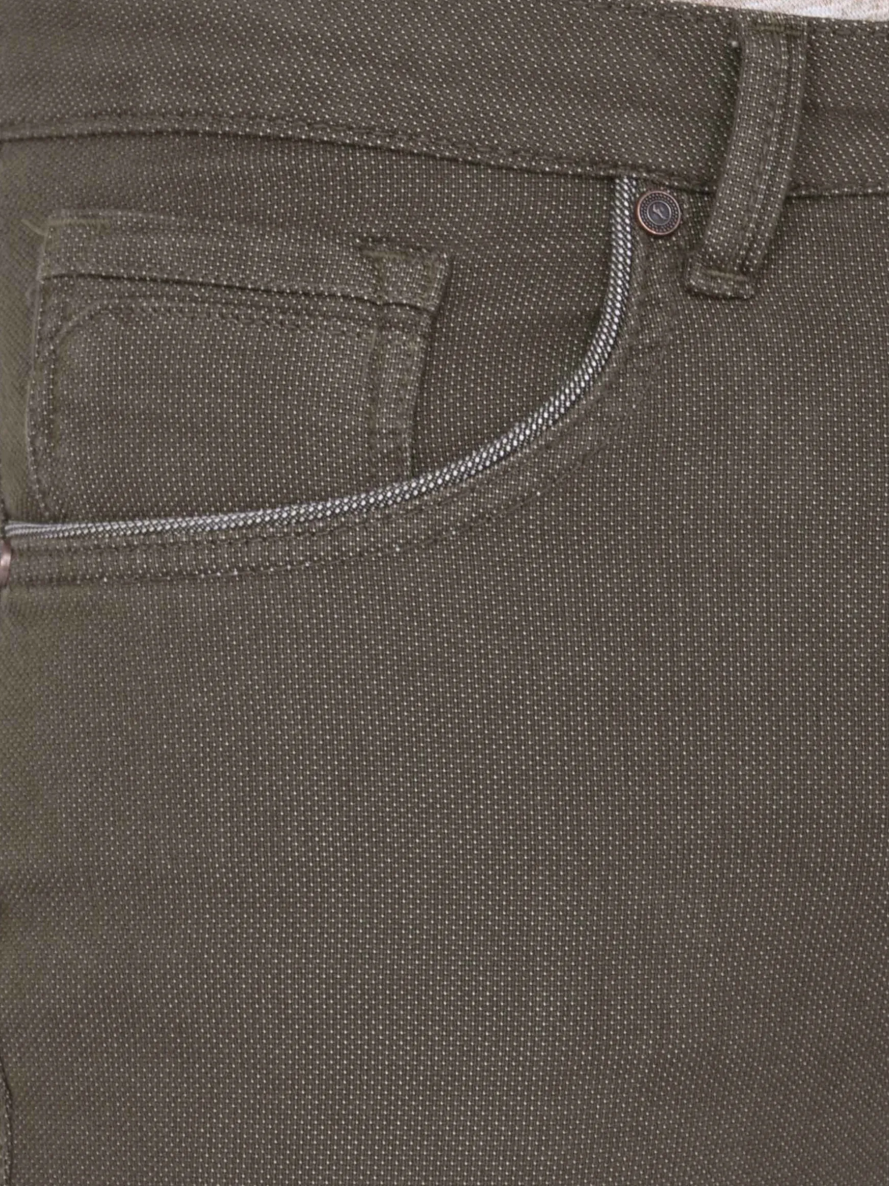 Khaki kleurige jeans met knoopsluiting. De zakken aan de voorzijde zijn fraai afgewerkt met een beige kleurige rand. Deze jeans heeft een perfecte pasvorm en is voor een casual outfit zeer geschikt om te combineren met een sweater of overhemd.