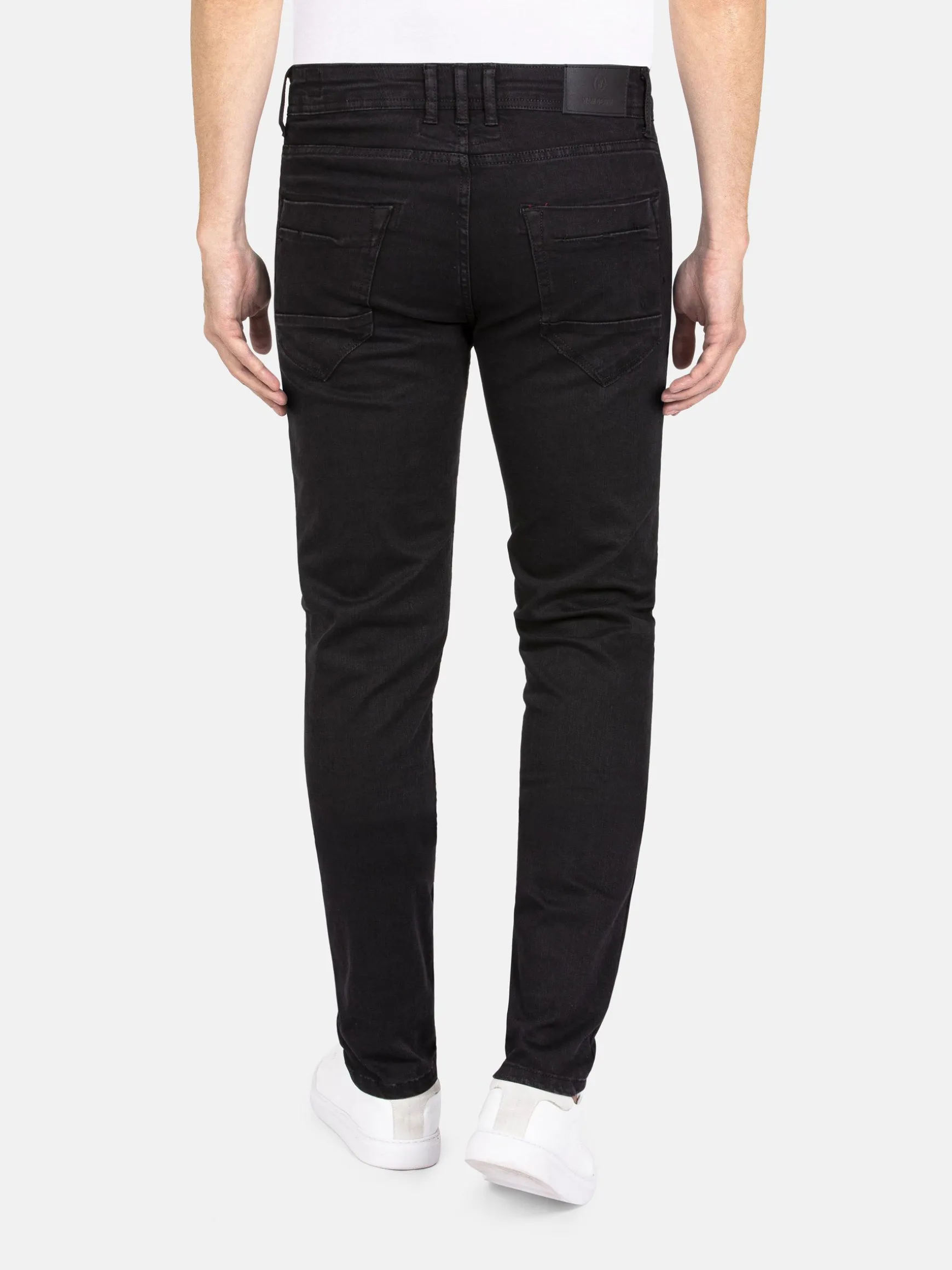Slim fit jeans met een zwarte effen kleur. Gemaakt van hoogwaardige materialen met een rechte pijp. Leer borduurwerk op de tailleband. Klassieke jeans die makkelijk te combineren is voor elke stijlvolle casual outfit.