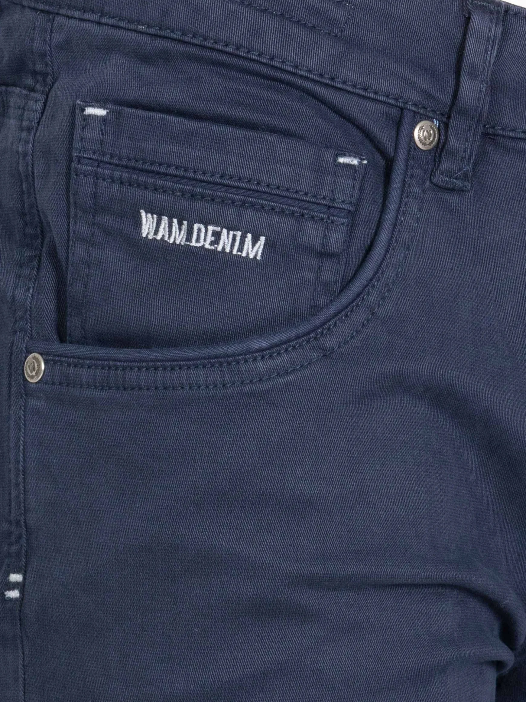 Geon Slim Fit Navy Jeans. Deze jeans is gemaakt van elastische stof en heeft een ritssluiting, vier zakken, waaronder een klein horlogezakje, en klinknagels om de spanningspunten te verstevigen. De diepe Navy kleur voegt een modern tintje toe, waardoor hij perfect is voor elke gelegenheid.