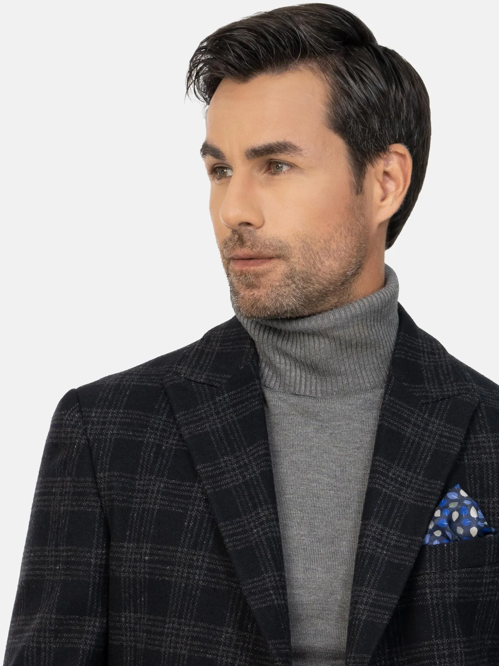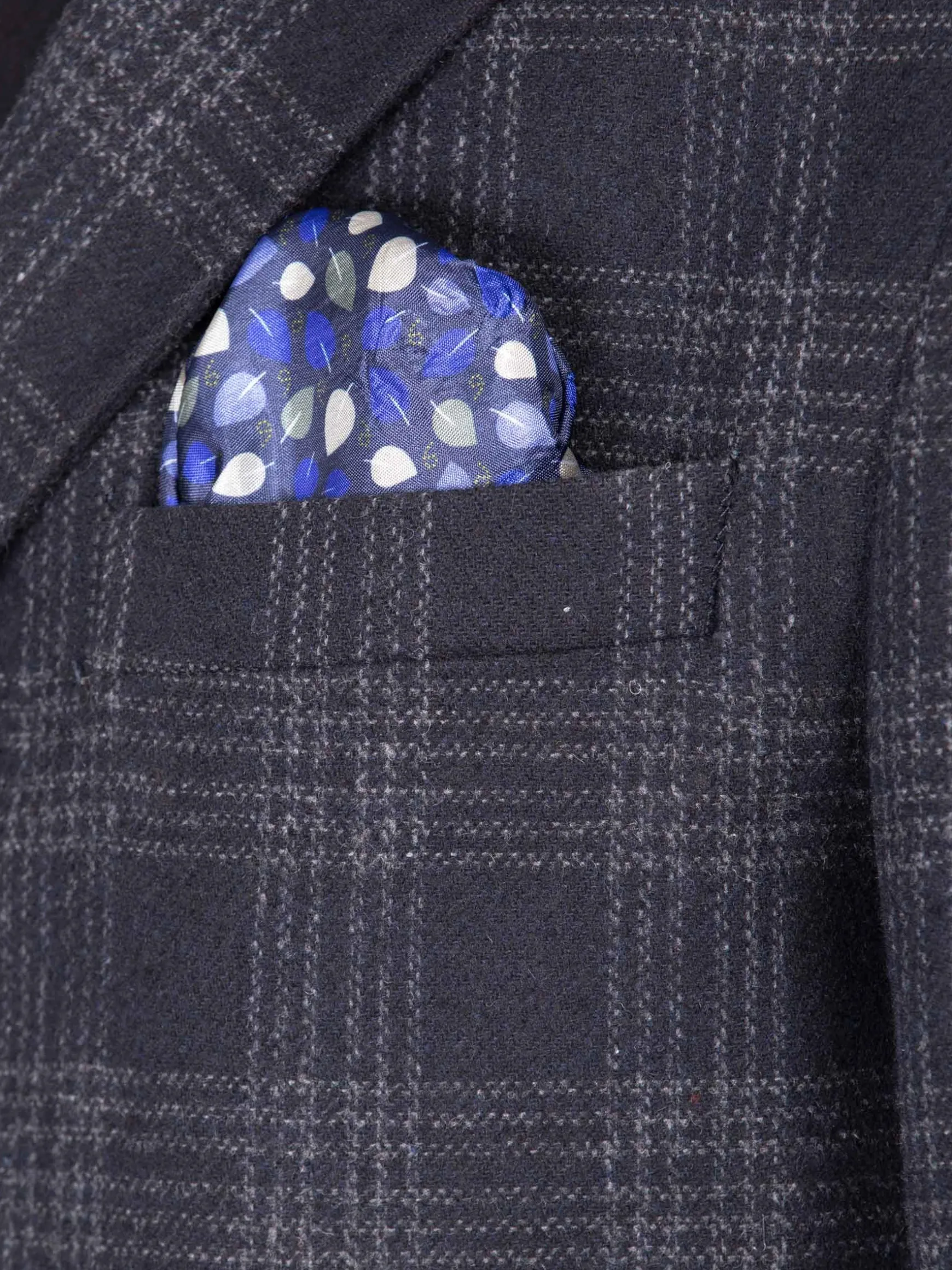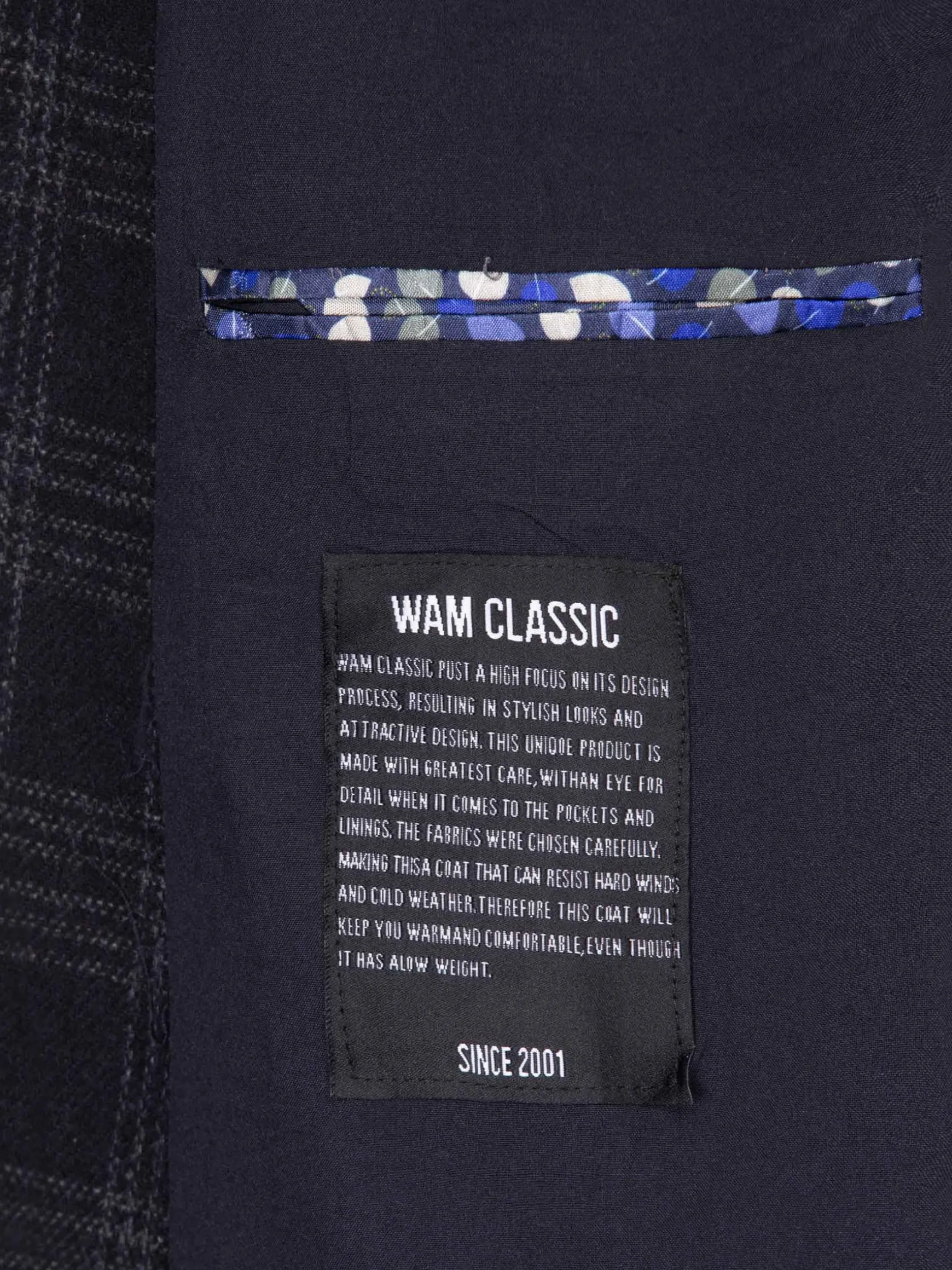 Stijlvolle trenchcoat met ruitpatroon. Deze jas heeft een mooie donkerblauwe kleur, afgewerkt met grote, blauwe knopen. Dit model past goed op een pantalon, maar ook op een nette jeans. De borstzak van het jasje kan, wanneer deze naar buiten wordt gedraaid, worden gepresenteerd als een extra accessoire in de vorm van een pochet van 100% polyester.