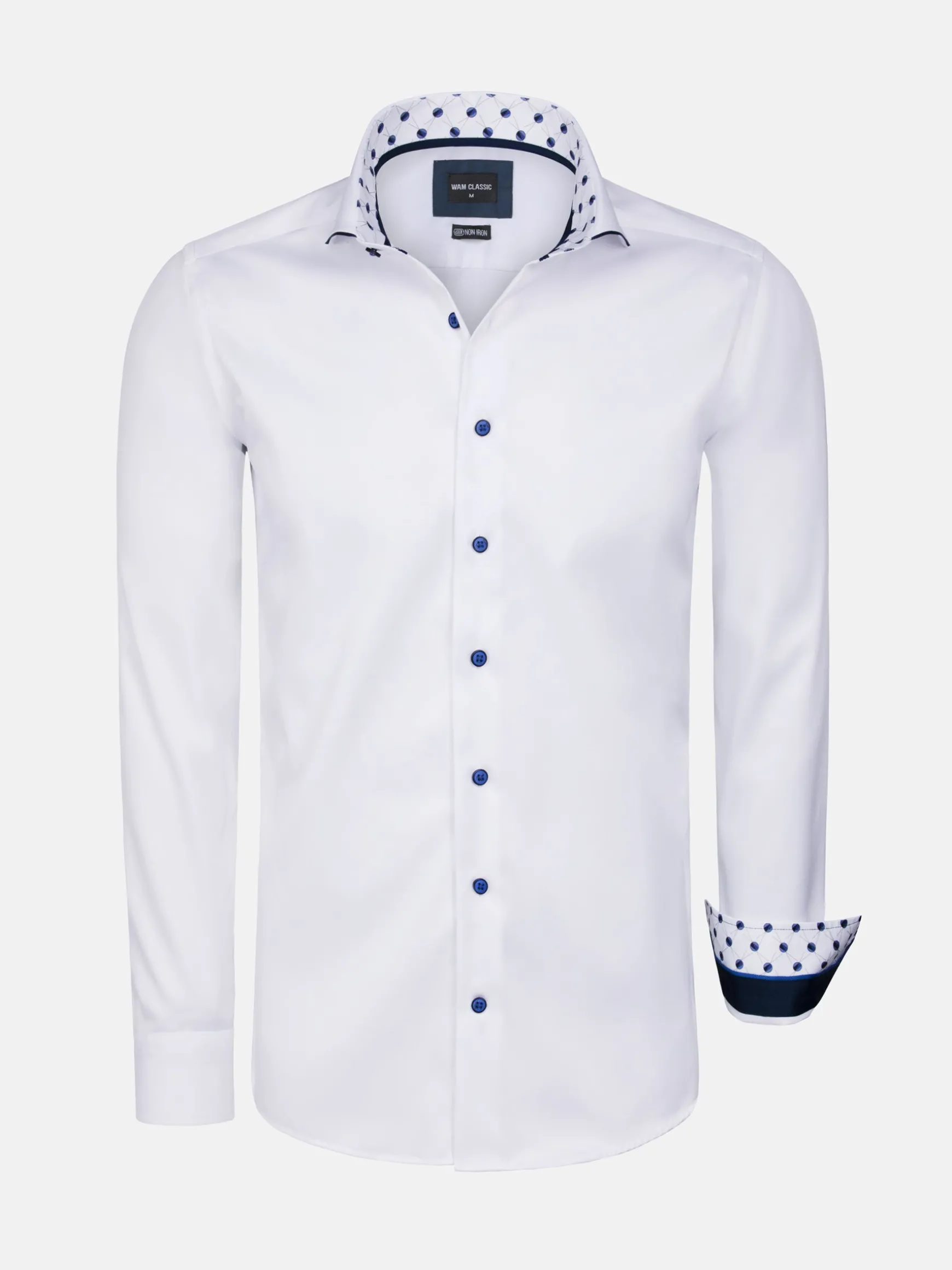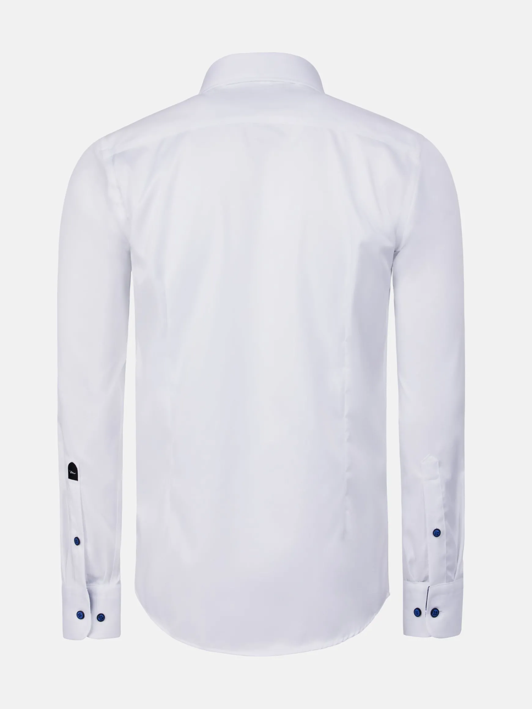 Een klassiek wit overhemd met een twist. De fraaie blauwe knopen geven dit ontwerp net iets extra’s en de binnen kant van de kraag en de manchet zijn speels vormgegeven. Eindeloos te combineren met kleuren en geschikt om te dragen voor veel verschillende gelegenheden. Een must voor iedere garderobe.