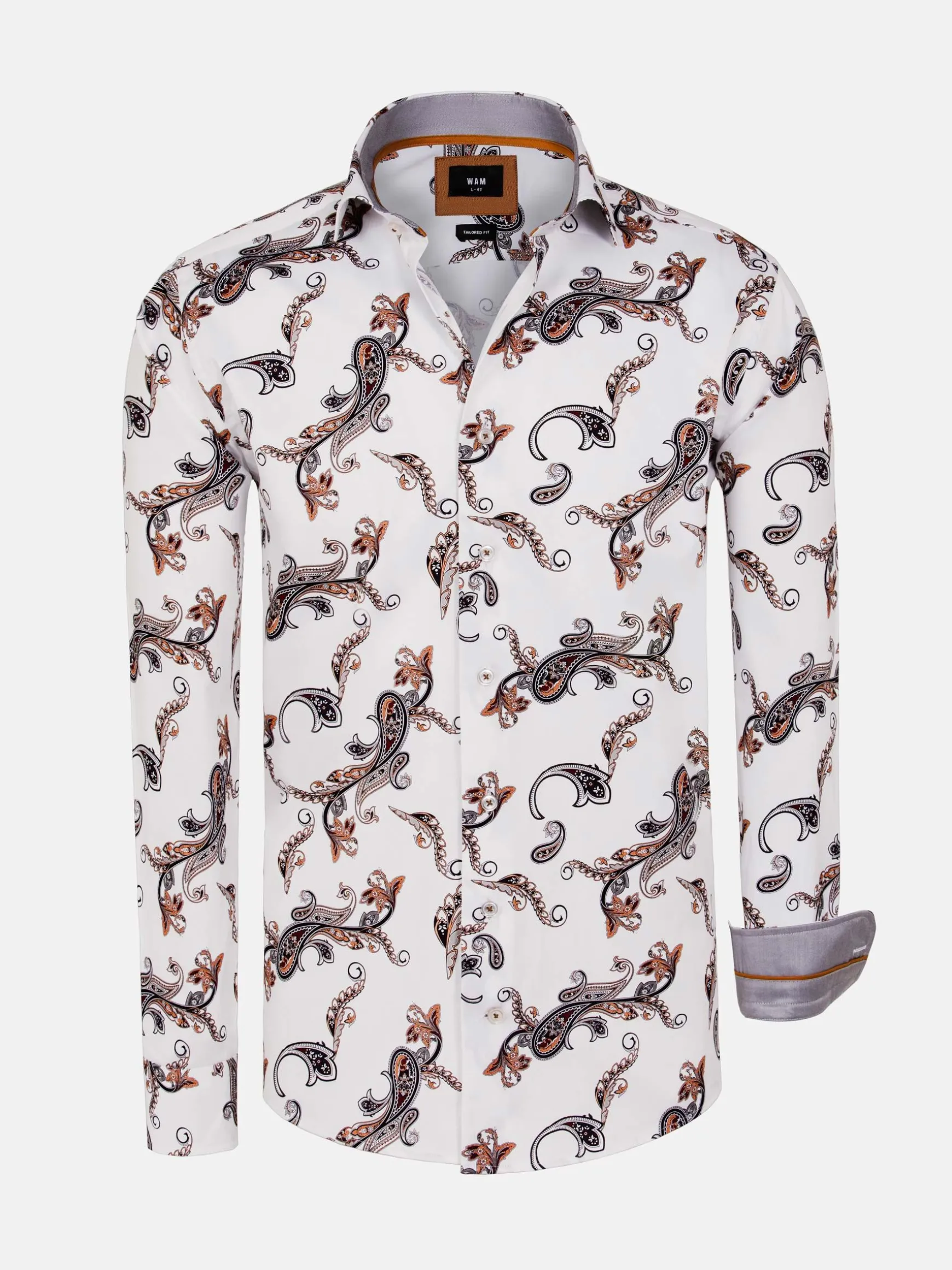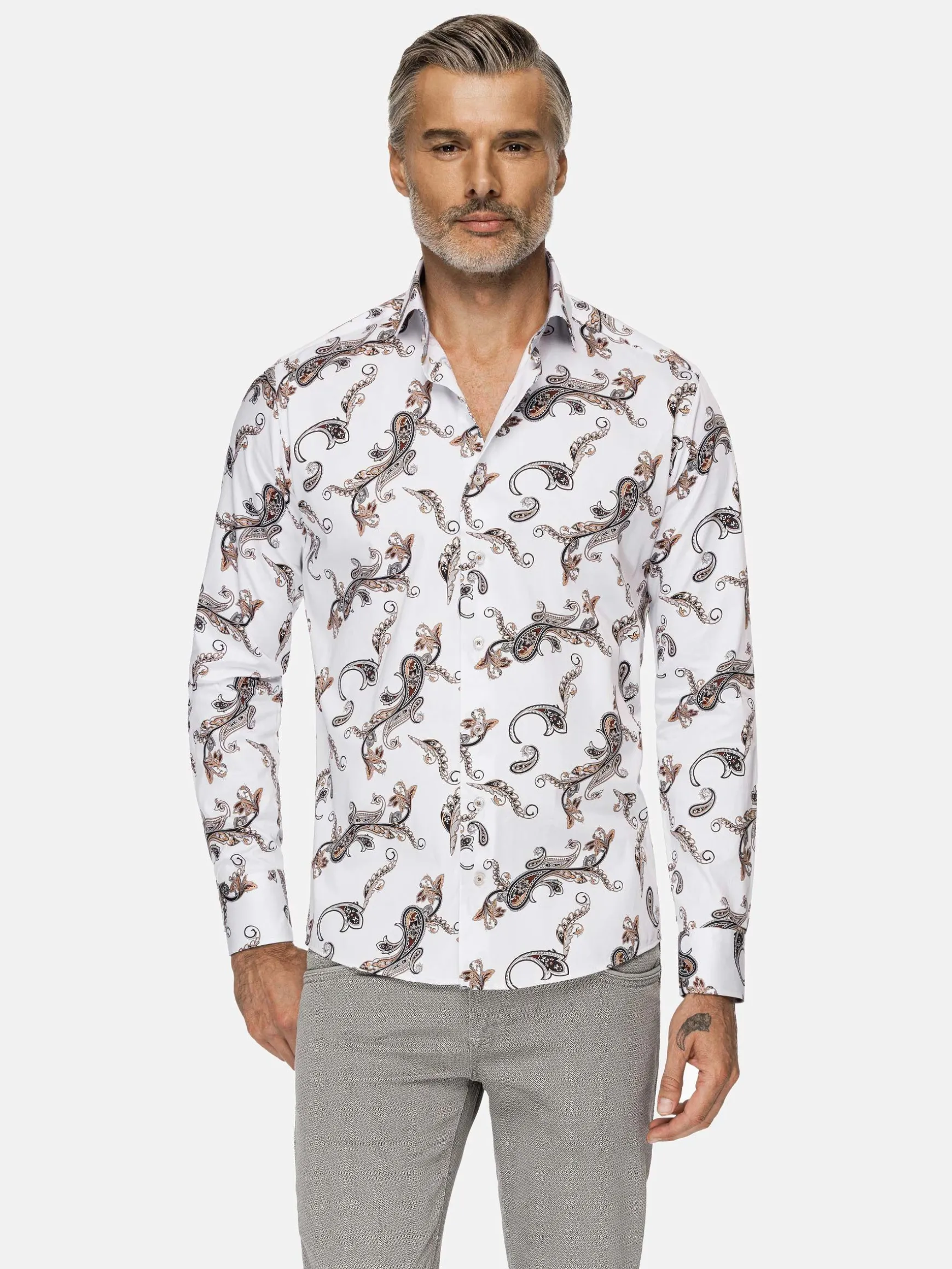 Paisley, een perfecte mix van hedendaagse elegantie en tijdloze charme. Het verbluffende witte paisley bloemenpatroon straalt verfijning uit die werkelijk ongeëvenaard is. Het ingewikkelde bloemmotief voegt een vleugje verfijning toe, waardoor het een veelzijdige keuze is voor elke gelegenheid, of het nu een formeel evenement is of een informeel samenzijn met vrienden. Dit witte paisley overhemd heeft een lange witte mouw met een paisley bloemenprint, waardoor het een must-have toevoeging aan je garderobe is. Ervaar de allure van paisley print, de aantrekkingskracht van witte bloemen en het pure comfort van dit stijlvolle overhemd met paisley witte bloemenprint met lange mouw.